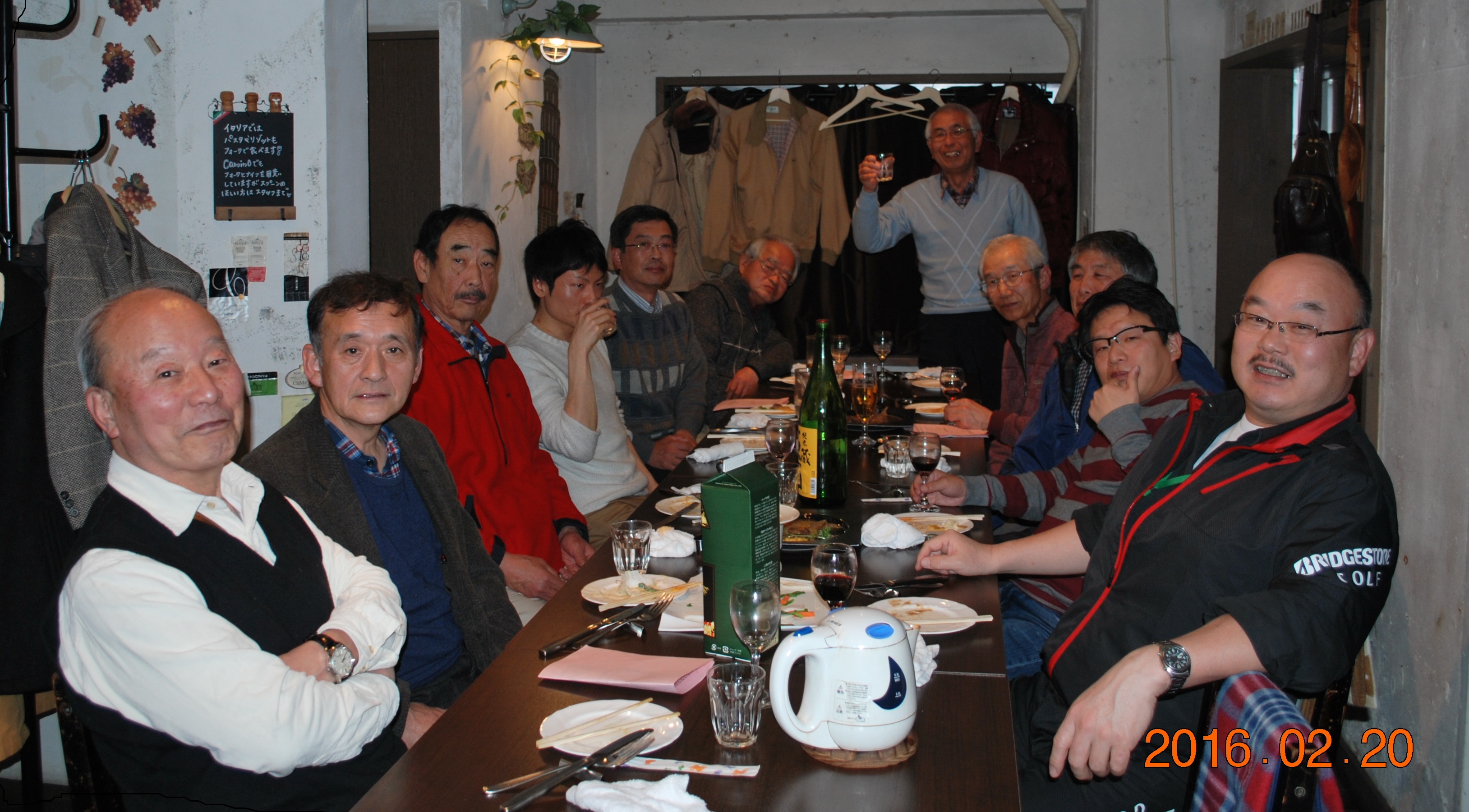 昨日は寒い雨降る中 わが街「国立」にご参集いただきありがとうございました。 まず最初に慎んで岩坪様のご冥福をお祈りし献杯しました。 皆様のご協力のもと、滞りなく年度計画の策定が完了し、新年会を楽しく終了することが出来ました。 公式戦の日程は次の要に決まりました。 第1戦:4月2日(土曜)、第2戦:5月28日(土曜)、第3戦:7月2日(土曜) 第4戦:9月3日(土曜)、第5戦:10月15日(土曜)、第6戦:11月26日(土曜) 主な討議結果をしるします。 1.本年度はアテストカード用紙を廃止して直接IT画面にてアテストする。 順位集計表の用紙は今年も使用して各自が記入する。 2.横山さんが傘寿になられるので祝宴を企画する 3.会計繰越金は過多にせず適宜年度内で消費する方向とする。 「2016年酔狂会 ご案内」の修正版と記念のワンショットを添付します。 以上 國本 添付ファイル(SGC16.doc):【ここを右クリック】 添付ファイル(DSC_0002s.JPG):【ここをクリック】