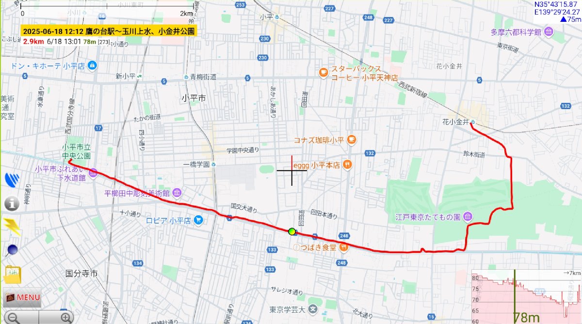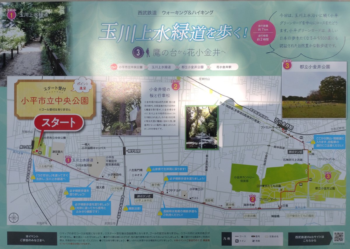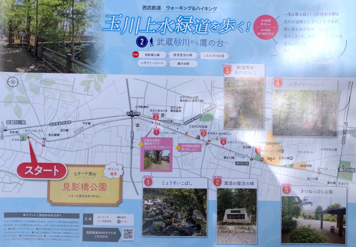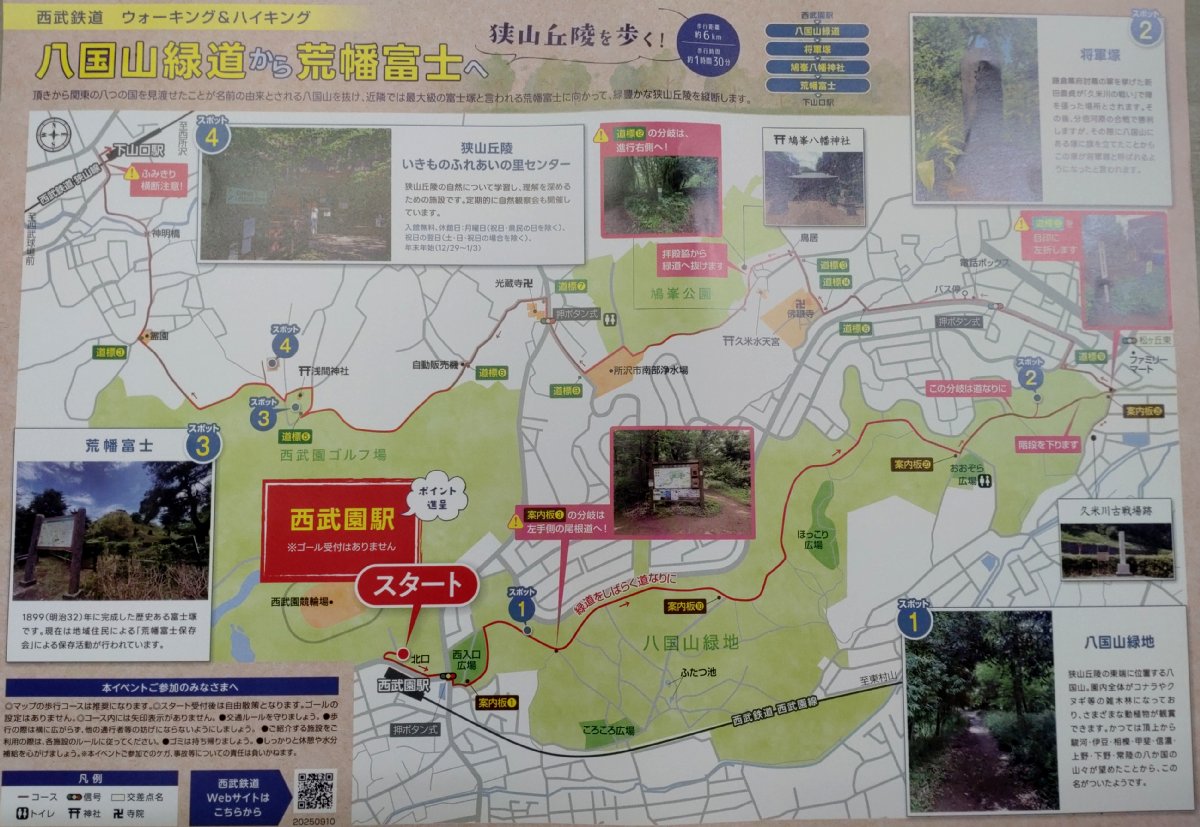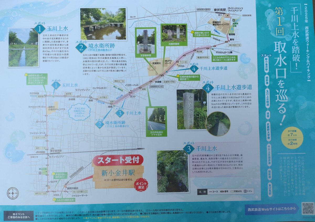 ★2025年09月17日(水) 晴れ、気温(青梅)35.2/23.0℃、西武鉄道、「千川上水を踏破!」武蔵野の屋敷林をめぐる! 猛暑日となった、とてもつらいウォーキングであった。 蒸し暑く汗だくで途中道を間違えるなどして、集中力が散漫ながら歩き切った。 ★2025年09月10日(水) 晴れ/曇り、気温(青梅)32.9/24.2℃、西武鉄道、八国山緑道から荒幡富士へ 佐山丘陵を歩く! 午後から曇りで時々雨、蒸し暑い中でのウォーキング。 ●八国山緑道:狭山丘陵の東端にある八国山のコナラやクヌギの雑木林。 ●荒幡富士:明治32年完成した歴史ある富士塚で、関東では最も大きな富士塚と言われている ★2025年09月03日(水) 晴れ、気温(青梅)36.2/23.9℃、西武鉄道、多摩川沿いの福生南公園、水鳥公園から五鉄通りを歩く! 9月になっても猛暑日が続いている、久しぶり(2ヶ月ぶり)のウォーキング参加。 一番暑い時間帯に歩いたので汗びっしょり、日傘をさしてではあったがこの暑さ(青梅36℃越え)には参った。 ★2025年07月02日(水) 晴れ、気温(青梅)33.2/22.3℃、西武鉄道、「千川上水を踏破!」取水口をめぐる! 今日も夏日2Wほど続いている。6月の平均気温が過去最高を記録、今月も夏日が続いて梅雨明け間近か? 新小金井駅から玉川上水緑道を歩き境水衛所跡(千川上水の取水口)から千川上水(緑道)を歩き東伏見駅がゴール。 ●千川上水:元々は5代将軍綱吉の立ち寄り先である小石川御殿、湯島聖堂、寛永寺、」浅草寺等への給水を目的として作られた ★2025年06月25日(水) 雨/曇り、気温(青梅)29.1/23.1℃、西武鉄道・JR東日本、夏の訪れを感じながら御岳溪谷遊歩道を歩く! 歩き始める直前まで強い雨であったが、御嶽駅を雨上がりで蒸し暑い中スタート。 雨でぬれた遊歩道は歩きにくかったが御岳溪谷を楽しめた。 ★2025年06月18日(水) 晴れ、気温(青梅)34.7/24.4℃、西武鉄道、玉川上水緑道を歩く! 昨日は猛暑日、今日は猛暑日一歩手前の炎天下でのウォーキング、 しかし玉川上水緑道では木陰が多く涼しい風が吹く中でのウォーキングだった。 ★2025年06月11日(水) 雨、気温(青梅)21.5/19.2℃、西武鉄道、智光山公園の花菖蒲鑑賞ピクニックへ! 昨日梅雨入りした、昨年より11日早く平年より3日遅い。 今日は雨の中を智光山公園の花菖蒲鑑賞のウォーキング、智光山公園に着くころから本格的な雨となり 足元がずぶ濡れにながらの花菖蒲鑑賞であった。花菖蒲園には約2,600株もの花が咲きここっていた。 ★2025年05月21日(水)小満 晴れ、気温(青梅)30.5/18.0℃、西武鉄道、玉川上水緑道を歩く! 昨日は真夏日、今日も真夏日で蒸し暑い。 玉川上水緑道は木陰で涼しい風があり比較的歩きやすいウォーキングであった。 ★2025年04月05日(土) 晴れ、気温(青梅)16.2/1.1℃、西武鉄道、西新宿 代々木を散策! 神田川のサクラの花見ウォーキング、北風があり肌寒かったが絶好の花見日和である。 神田川沿いのサクラは満開でおお花見の人出で川沿いの遊歩道は混雑が激しかった。 が、約3?程の満開の神田川沿いのサクラを楽しむことができた。 ★2025年03月18日(火) 晴れ|曇り、気温(青梅)11.7/2.7℃、JR東日本、町田三天神と梅、桜をめぐるコース 町田三天神(町田天満宮、南大谷天神、菅原神社)と梅・桜をめぐるコースであったが、 梅はすでに終わり桜は早咲きがチラホラで時期が悪かった。(コース期間は3/1〜3/31) 恩田川沿いに早咲きのサクラとカワセミ、まちだのデコイチ(D51862)は楽しめた。 ★2025年03月07日(金) 晴れ、気温(青梅)10.6/0.6℃、JR東日本、目黒川がつなぐ歴史・ぶんかの街を歩く 北風が強く吹く中のウォーキングであった。 目黒川沿いのサクラはまだ咲く気配がない、 寒かったので足早に回ったが、旧朝倉家住宅とめぐろ歴史資料館を見学した。 ★2025年01月11日(土) 晴れ、気温(青梅)10.6/-4.2℃、秩父鉄道、新春開運祈願!秩父街なか歩きと自社巡り 今年初めてのウォーキングイベントに参加、秩父鉄道主催の秩父街なか歩きと自社巡りである。 最低気温青梅ー4.2、秩父-6.6℃と1月に入ってからの最低気温の中ではあったが日中は日差しがあり暖かく感じた。 秩父神社の初参拝をスタートに8か所をめぐり、ゴールでは秩父市のマスコットキャラクタの「ポテくまくん」に遭遇。