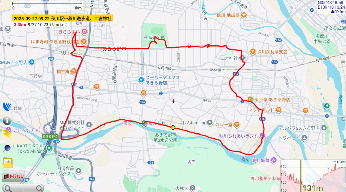 昨日は真夏日で暑かったが今日は清々しい陽気でウォーキング日和。 秋川駅スタートで秋川遊歩道、東秋留橋、二宮神社、都立秋留台公園、ゴールはスタートの秋川駅の周回コース ---------------------------------------------------------------------------------------------------------