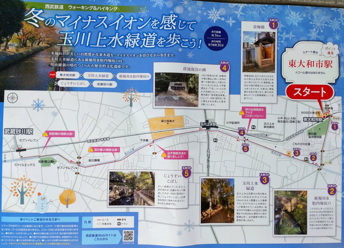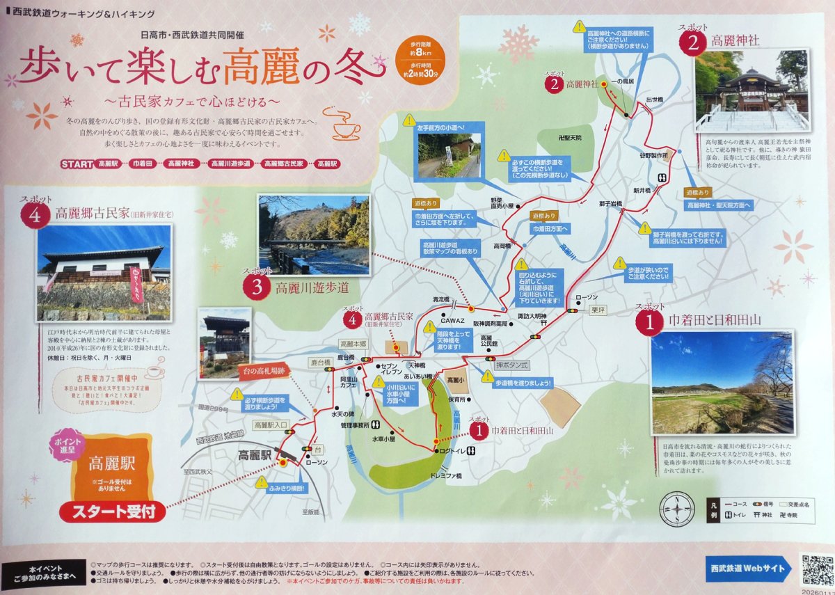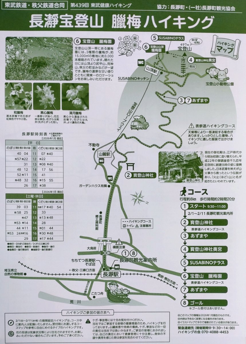 ★2026年02月18日(水) 晴れ、気温(青梅)12.1/0.9℃、西武鉄道、黒目川源流の「さいかちの道」を辿る! 黒目川を東久留米駅ちかくから上流の小平霊園ふきんまでの川沿いのウォーキング。 ここも最近の降雨量の少なさから水量が少ない。が、川沿いにはたくさんの野鳥が餌を求めていた。 目黒川の清流には「清流の宝石」「飛ぶ宝石」と称されるカワセミも見られた。 ★2026年02月14日(土) 晴れ、気温(青梅)14.5/1.1℃、秩父鉄道・JR東日本、ちちぶ巡礼体験ハイク 〜寺尾と秩父街なか道〜 3月下旬の陽気、汗だくで7か所の札所を巡った。今回の秩父までの往復は西武鉄道秩父線を利用・ 往路は飯能駅から秩父鉄道乗入れの長瀞行きで大野原駅下車してスタート、ゴールは秩父駅。 復路は西武秩父駅から飯能駅まで特急ラビュー利用した。ラビュー乗車は久しぶりである。 ★2026年02月03日(火) 節分、 晴れ、気温(青梅)10.7/-3.8℃、秩父鉄道・東武鉄道、長瀞宝登山 蝋梅ハイキング 長瀞駅から宝登山神社を経由で宝登山の蝋梅鑑賞ハイキング。ロウバイ(蝋梅)は少し時期が早く三分咲きであった。 山頂には昨年オープンした展望テラス「SUSABINOテラス」があり秩父地域が眺望できる絶景スポットとなっていた。 宝登山神社では節分会が催されており参加、たくさんの節分豆をいただいた。 ★2026年01月28日(水) 曇り、気温(青梅)9.1/-2.6℃、西武鉄道、冬のマイナスイオンを感じて玉川上水緑道を歩こう! 薄曇りで冷たい風の中を東大和市駅から武蔵砂川駅間の玉川上水緑道を歩いた。 今月の雨量がほぼ0?で玉川上水緑道は乾燥してパウダー状の土が続いており足元は土埃まみれとなった。 距離は短かく短時間であったが緑道の木立には野鳥が多くみられ、珍しいコゲラを見ることができた。 ★2026年01月23日(金) 晴れ、気温(青梅)8.4/-5.9℃、秩父鉄道・JR東日本、ちちぶ巡礼体験ハイク 〜横瀬の道〜 最強・長期の寒波、今日は青梅で₋6℃、秩父で₋8℃と今冬最低気温である。 風は弱く寒いながらも歩いていると日差しが強く暖かく感じられ、 武甲山を眺めながら秩父札所の5番から11番の巡礼ハイクを楽しんだ。 ★2026年01月17日(土) 晴れ、気温(青梅)15.1/-0.7℃、西武鉄道、歩いて楽しむ高麗の冬 今年初めてのウォーキング参加、4月の気候で真冬とは思えない。 初詣を兼ねて高麗神社へ高麗駅から巾着井田を経由しての往復、高麗神社は人気の高さが伺える参拝者の多さであった。