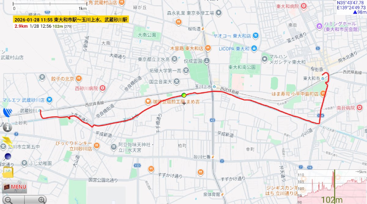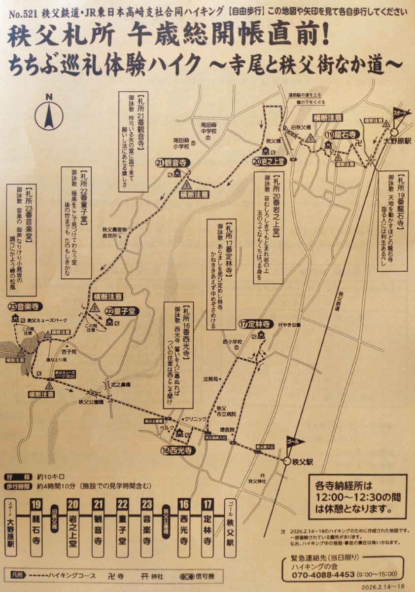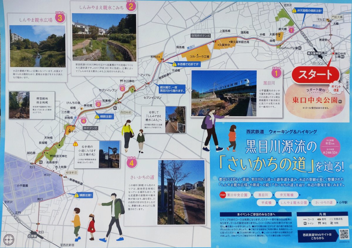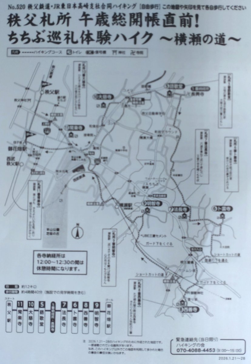 ★2026年02月18日(水) 晴れ、気温(青梅)12.1/0.9℃、西武鉄道、黒目川源流の「さいかちの道」を辿る! 黒目川を東久留米駅ちかくから上流の小平霊園ふきんまでの川沿いのウォーキング。 ここも最近の降雨量の少なさから水量が少ない。が、川沿いにはたくさんの野鳥が餌を求めていた。 目黒川の清流には「清流の宝石」「飛ぶ宝石」と称されるカワセミも見られた。 ★2026年02月14日(土) 晴れ、気温(青梅)14.5/1.1℃、秩父鉄道・JR東日本、ちちぶ巡礼体験ハイク 〜寺尾と秩父街なか道〜 3月下旬の陽気、汗だくで7か所の札所を巡った。今回の秩父までの往復は西武鉄道秩父線を利用・ 往路は飯能駅から秩父鉄道乗入れの長瀞行きで大野原駅下車してスタート、ゴールは秩父駅。 復路は西武秩父駅から飯能駅まで特急ラビュー利用した。ラビュー乗車は久しぶりである。 ★2026年02月03日(火) 節分、 晴れ、気温(青梅)10.7/-3.8℃、秩父鉄道・東武鉄道、長瀞宝登山 蝋梅ハイキング 長瀞駅から宝登山神社を経由で宝登山の蝋梅鑑賞ハイキング。ロウバイ(蝋梅)は少し時期が早く三分咲きであった。 山頂には昨年オープンした展望テラス「SUSABINOテラス」があり秩父地域が眺望できる絶景スポットとなっていた。 宝登山神社では節分会が催されており参加、たくさんの節分豆をいただいた。 ★2026年01月28日(水) 曇り、気温(青梅)9.1/-2.6℃、西武鉄道、冬のマイナスイオンを感じて玉川上水緑道を歩こう! 薄曇りで冷たい風の中を東大和市駅から武蔵砂川駅間の玉川上水緑道を歩いた。 今月の雨量がほぼ0?で玉川上水緑道は乾燥してパウダー状の土が続いており足元は土埃まみれとなった。 距離は短かく短時間であったが緑道の木立には野鳥が多くみられ、珍しいコゲラを見ることができた。 ★2026年01月23日(金) 晴れ、気温(青梅)8.4/-5.9℃、秩父鉄道・JR東日本、ちちぶ巡礼体験ハイク 〜横瀬の道〜 最強・長期の寒波、今日は青梅で₋6℃、秩父で₋8℃と今冬最低気温である。 風は弱く寒いながらも歩いていると日差しが強く暖かく感じられ、 武甲山を眺めながら秩父札所の5番から11番の巡礼ハイクを楽しんだ。 ★2026年01月17日(土) 晴れ、気温(青梅)15.1/-0.7℃、西武鉄道、歩いて楽しむ高麗の冬 今年初めてのウォーキング参加、4月の気候で真冬とは思えない。 初詣を兼ねて高麗神社へ高麗駅から巾着井田を経由しての往復、高麗神社は人気の高さが伺える参拝者の多さであった。