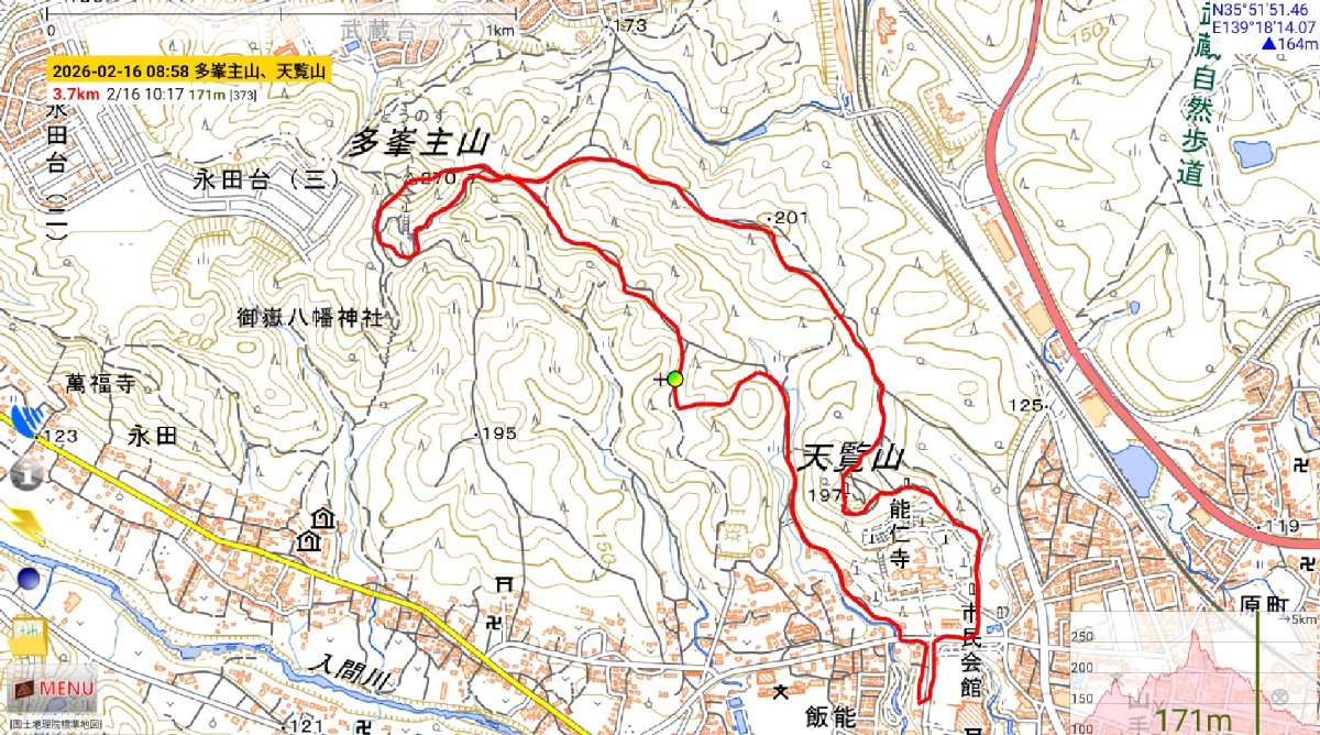★2026年02月16日(月)、晴れ/曇り、気温(青梅)14.4 / 2.8℃、多峯主山(271m)、天覧山(195m)