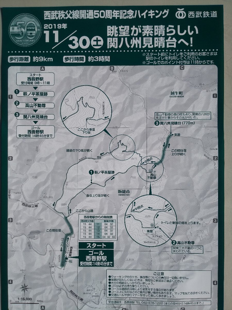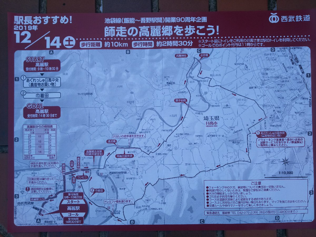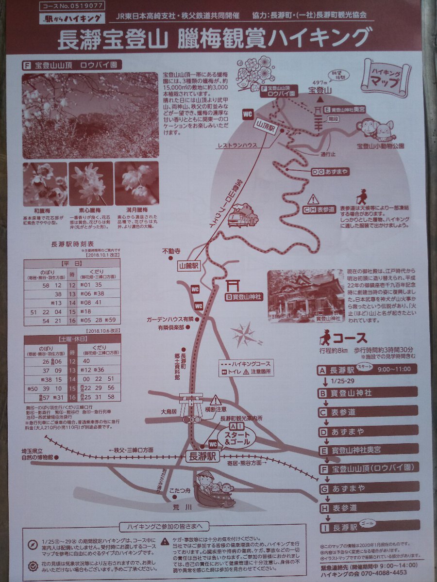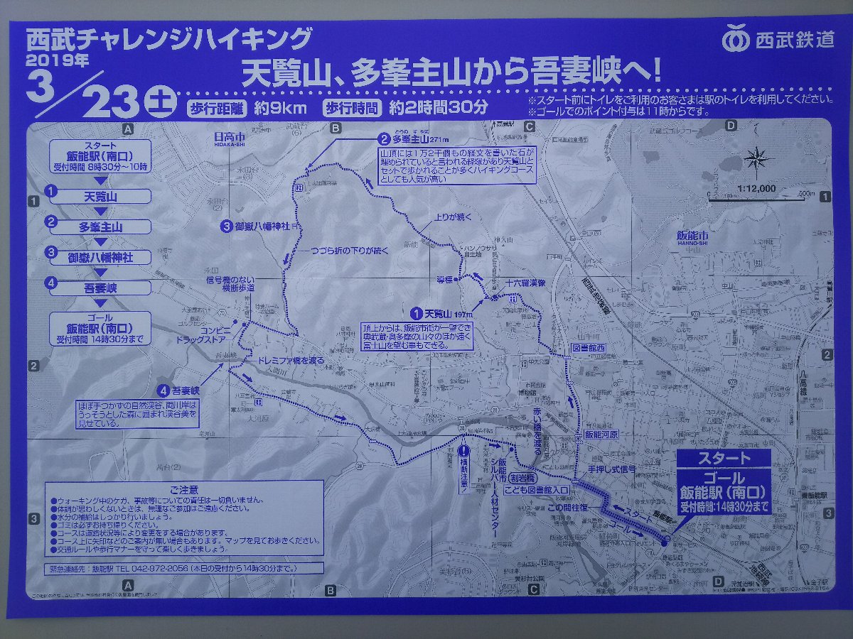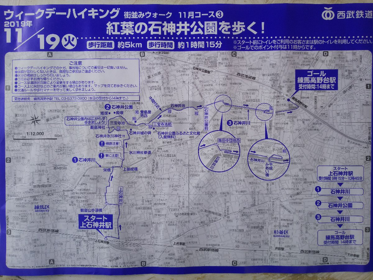 ★2019年12月10日(火)、気温(青梅)12.1/6.2℃、西武鉄道、「関のボロ市」フリー散策! 本立寺の門前で催されている「関のボロ市」へ。 その後は、武蔵関公園散策と、東伏見稲荷神社へ参拝。 ★「関のボロ市」 毎年12月9,10日に武蔵関駅北口から本立寺門前で行われる蚤の市を中心とする伝統行事。 ★2019年11月30日(土)、気温(青梅)11.3/-0.6℃、西武鉄道、眺望が素晴らしい関八州見晴台へ! 朝の最低気温が氷点下、快晴の天気の中、西吾野から関八州見晴台の西武鉄道のハイキング。 高山不動尊から関八州見晴台では紅葉がみられ、関八州見晴台(771m)では富士山がくっきりと望むことができた。 帰路は不動三滝(不動滝、大滝、白滝)の一つの白滝を観瀑。 ★2019年11月26日(火)、気温(青梅)11.9/6.3℃、西武鉄道、神宮外苑イチョウ並木フリー散策 前日は20℃越えの陽気から、本日は日中10℃以下の真冬の陽気。 神宮外苑のイチョウ並木周辺のフリー散策に参加、イチョウ並木は今月末くらいまで見頃の感じ。 聖徳記念絵画館は大正時代に建てられた明治天皇と昭憲皇太后の御事蹟を描いた80枚の絵画が展示、一時間以上かけて鑑賞。 最後は建設がやっと完成した新国立競技場を眺めてごオール。 ★2019年11月19日(火)、気温(青梅)19.9/12.4℃、西武鉄道、紅葉の石神井公園を歩く 3か月ぶりのウォーキング参加である。 今年は紅葉の時期が2週間ほど遅れているため、石神井公園の紅葉は一部色づいているがまだまだである。 ★2019年08月31日(土)、気温(青梅)30.2/22.8℃、秩父鉄道、JR東日本、長瀞七草寺めぐりハイキング とても蒸し暑い日で、時間の都合で一部カットした。 夏休み最後の週末のため長瀞は観光客であふれており、舟下りも待ちの行列ができていた。 ★2019年05月11日(土)、気温(青梅)27.4/12.3℃、西武鉄道、第8回うまかんべぇ〜ウォーキング 前日に続き27℃以上の夏日、うまかんべぇ〜ウォーキングに参加 うまかんべぇ〜祭り会場の一角に戦災建造物の急日立航空機株式会社変電所があり、ゴール後に見学。 ★2019年04月23日(火)、気温(青梅)23.5/14.8℃、西武鉄道、春風そよぐ秩父久那の里を訪ねて 今日も暑い日である。秩父では25℃越えの夏日であった。 久那の里では鯉のぼりの中、菜の花や八重桜、花桃などが咲き誇り武甲山を背景に眺めが良かった。 久那の里は「鯉のぼりの里」と言われ観光客が多く訪れている。 ★2019年04月21日(日)、気温(青梅)22.6/9℃、西武鉄道、新緑の戸山公園・神田川と薬王院ぼたん散策 薬王院のぼたんは見頃で多くの観賞客が訪れていた。 神田川遊歩道の桜並木は既に葉桜である。 肥後細川庭園ではシャガの花が満開で綺麗であった ★2019年04月05日(金)、気温(青梅)23.7/4.4℃、西武鉄道、春色の横手渓谷から多峯主山を歩く! 2・3日前の2月の陽気から今日は初夏の陽気で20℃越え、日差しも強くとても暑かった。 多峯主山からの展望がよく富士山や武甲山を眺めることができた。 帰途の反応中央公園の桜はほぼ満開で多くの花見客で賑わっていた。 ★2019年03月26日(火)、西武鉄道、花揺れる清流を歩き、春を満喫! 都心では桜の花が満開になろうとしているが、今回のコース上では桜は開花したばかりである。 春先は雨が少ないためか落合川の水量は少なく、黒目川では干上がっているところもあった。 キブシ、トサミズキやユキヤナギが落合川で多く見られ、黒目川のしんやま親水広場の桜は月末が花見頃である。 ★2019年03月23日(土)、西武鉄道、天覧山、多峯主山から吾妻峡へ! 前日(3/22)の20℃超えの陽気から今日は10℃以下の真冬並みの寒さ。 飯能駅から天覧山、多峯主、御嶽八幡神社、吾妻峡、飯能河原、飯能駅のコース。 昨日のような陽気なら飯能河原ではBBQや河原遊びで賑わうところだが、今日は閑散としていた。 ★2019年03月12日(火)、西武鉄道、加治丘陵から桜山展望台を訪ねて! 4月中旬の陽気が続いてスギ花粉の飛散が非常に強い中、桜山展望台を訪ねるウォーキング。 桜山展望台からは富士山やスカイツリーの展望が酔うところだが、生憎訪れた時には雲の中、霞の中であった。 コース途中の農家の畑で雄のキジに遭遇、多くのウォーカーが傍を通っても逃げない人馴れしたキジ。 ★2019年02月26日(火)、JR東日本、江戸時代の川崎宿を感じながら過去から未来へと巡る 東海道川崎宿を散策、最後に東芝未来科学館の見学。 ★2019年02月08日(金)、JR東日本、柏の街並みと手賀沼の景観を楽しむ安らぎウォーキング 昨日は4月の陽気、今日は真冬の陽気、明日は40年ぶりの寒さになるところもあり、積雪の予報が出ている。 今日の目玉は利根川の水を江戸川に送っている北千葉導水路にある北千葉導水ビジターセンターの見学であった。 北風が吹き寒い中のウォーキングであったので、寒さをしのぐ休憩場所でもあった。 ★2019年01月20日(日)、JR東日本、吾妻山公園の「早咲き菜の花」ウォッチング 今日は24節気の「大寒」、一年で最も寒の厳しい時期である。 早咲き菜の花と富士山が有名な二宮の吾妻山を巡