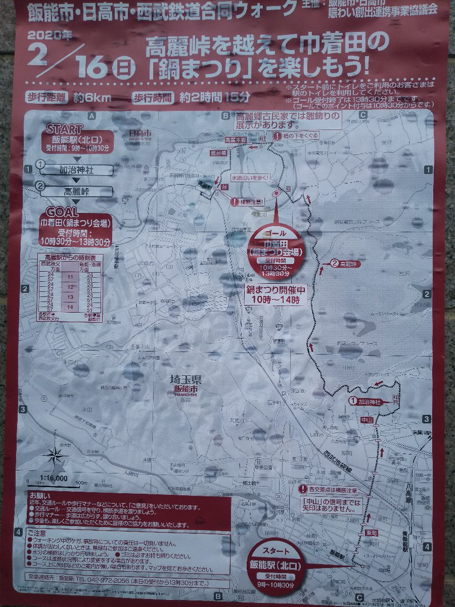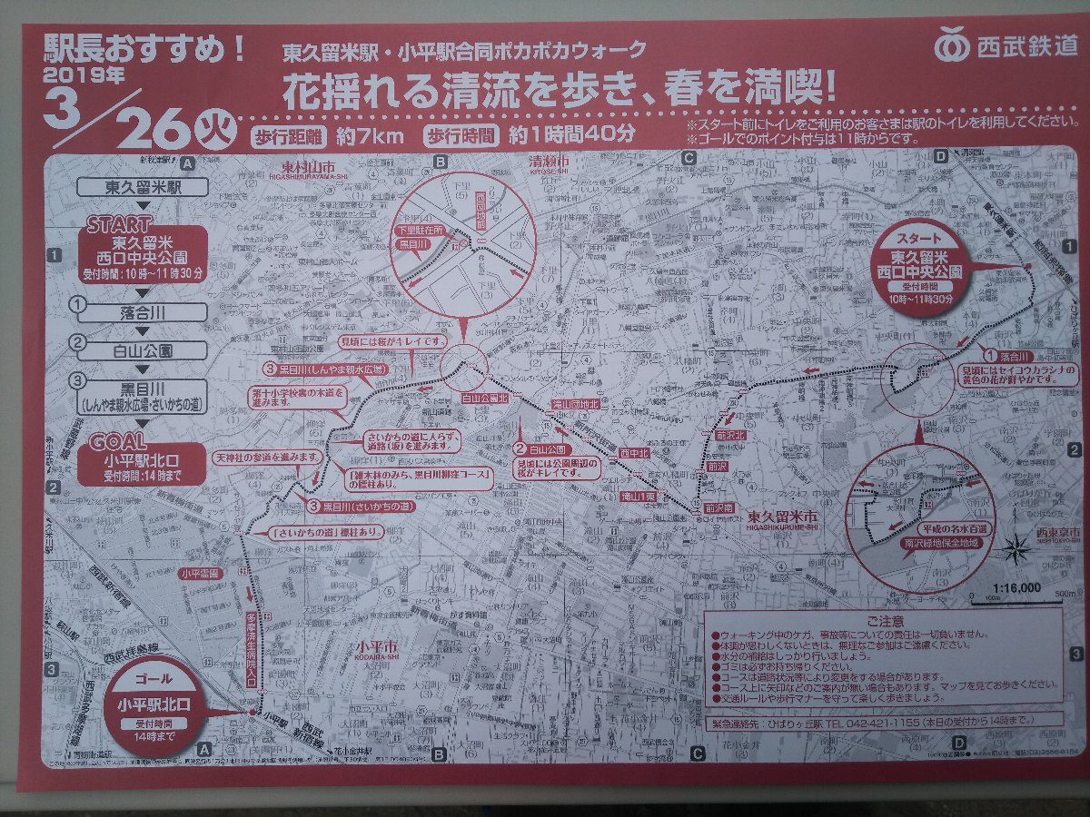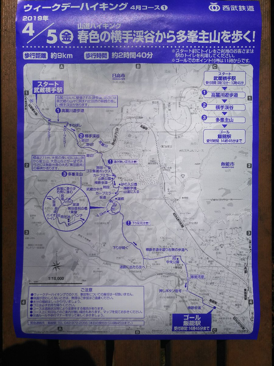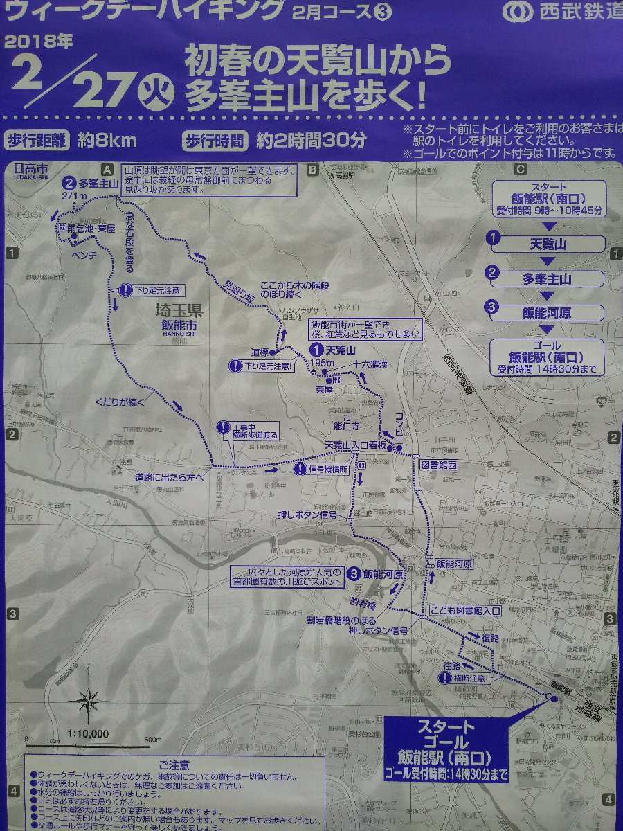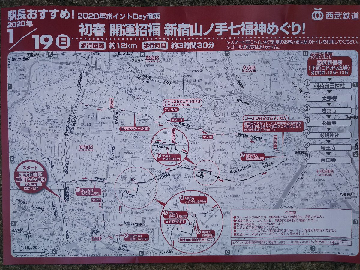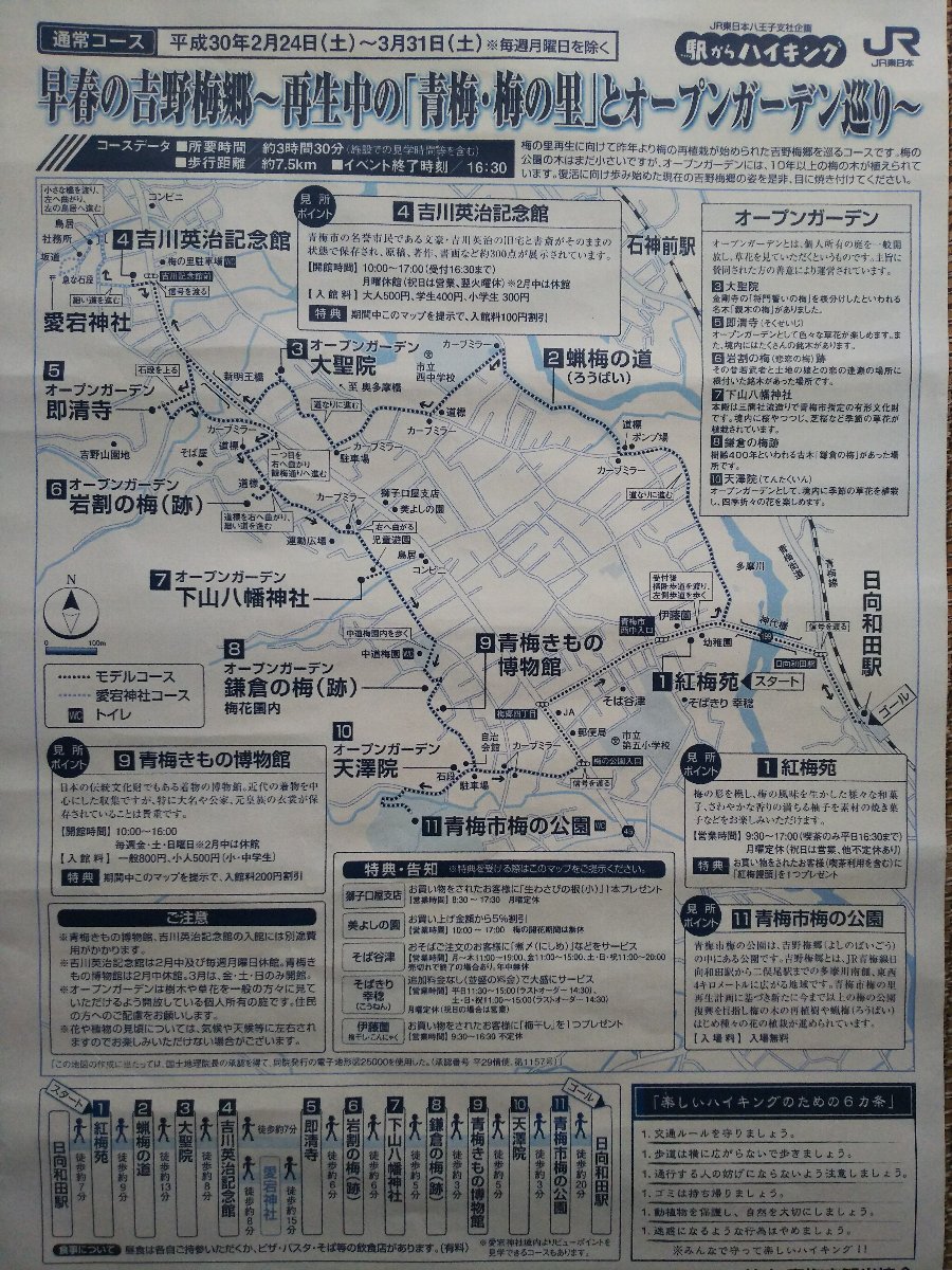 ★2019年12月10日(火)、気温(青梅)12.1/6.2℃、西武鉄道、「関のボロ市」フリー散策! 本立寺の門前で催されている「関のボロ市」へ。 その後は、武蔵関公園散策と、東伏見稲荷神社へ参拝。 ★「関のボロ市」 毎年12月9,10日に武蔵関駅北口から本立寺門前で行われる蚤の市を中心とする伝統行事。 ★2019年11月30日(土)、気温(青梅)11.3/-0.6℃、西武鉄道、眺望が素晴らしい関八州見晴台へ! 朝の最低気温が氷点下、快晴の天気の中、西吾野から関八州見晴台の西武鉄道のハイキング。 高山不動尊から関八州見晴台では紅葉がみられ、関八州見晴台(771m)では富士山がくっきりと望むことができた。 帰路は不動三滝(不動滝、大滝、白滝)の一つの白滝を観瀑。 ★2019年11月26日(火)、気温(青梅)11.9/6.3℃、西武鉄道、神宮外苑イチョウ並木フリー散策 前日は20℃越えの陽気から、本日は日中10℃以下の真冬の陽気。 神宮外苑のイチョウ並木周辺のフリー散策に参加、イチョウ並木は今月末くらいまで見頃の感じ。 聖徳記念絵画館は大正時代に建てられた明治天皇と昭憲皇太后の御事蹟を描いた80枚の絵画が展示、一時間以上かけて鑑賞。 最後は建設がやっと完成した新国立競技場を眺めてごオール。 ★2019年11月19日(火)、気温(青梅)19.9/12.4℃、西武鉄道、紅葉の石神井公園を歩く 3か月ぶりのウォーキング参加である。 今年は紅葉の時期が2週間ほど遅れているため、石神井公園の紅葉は一部色づいているがまだまだである。 ★2019年08月31日(土)、気温(青梅)30.2/22.8℃、秩父鉄道、JR東日本、長瀞七草寺めぐりハイキング とても蒸し暑い日で、時間の都合で一部カットした。 夏休み最後の週末のため長瀞は観光客であふれており、舟下りも待ちの行列ができていた。 ★2019年05月11日(土)、気温(青梅)27.4/12.3℃、西武鉄道、第8回うまかんべぇ〜ウォーキング 前日に続き27℃以上の夏日、うまかんべぇ〜ウォーキングに参加 うまかんべぇ〜祭り会場の一角に戦災建造物の急日立航空機株式会社変電所があり、ゴール後に見学。 ★2019年04月23日(火)、気温(青梅)23.5/14.8℃、西武鉄道、春風そよぐ秩父久那の里を訪ねて 今日も暑い日である。秩父では25℃越えの夏日であった。 久那の里では鯉のぼりの中、菜の花や八重桜、花桃などが咲き誇り武甲山を背景に眺めが良かった。 久那の里は「鯉のぼりの里」と言われ観光客が多く訪れている。 ★2019年04月21日(日)、気温(青梅)22.6/9℃、西武鉄道、新緑の戸山公園・神田川と薬王院ぼたん散策 薬王院のぼたんは見頃で多くの観賞客が訪れていた。 神田川遊歩道の桜並木は既に葉桜である。 肥後細川庭園ではシャガの花が満開で綺麗であった ★2019年04月05日(金)、気温(青梅)23.7/4.4℃、西武鉄道、春色の横手渓谷から多峯主山を歩く! 2・3日前の2月の陽気から今日は初夏の陽気で20℃越え、日差しも強くとても暑かった。 多峯主山からの展望がよく富士山や武甲山を眺めることができた。 帰途の反応中央公園の桜はほぼ満開で多くの花見客で賑わっていた。 ★2019年03月26日(火)、西武鉄道、花揺れる清流を歩き、春を満喫! 都心では桜の花が満開になろうとしているが、今回のコース上では桜は開花したばかりである。 春先は雨が少ないためか落合川の水量は少なく、黒目川では干上がっているところもあった。 キブシ、トサミズキやユキヤナギが落合川で多く見られ、黒目川のしんやま親水広場の桜は月末が花見頃である。 ★2019年03月23日(土)、西武鉄道、天覧山、多峯主山から吾妻峡へ! 前日(3/22)の20℃超えの陽気から今日は10℃以下の真冬並みの寒さ。 飯能駅から天覧山、多峯主、御嶽八幡神社、吾妻峡、飯能河原、飯能駅のコース。 昨日のような陽気なら飯能河原ではBBQや河原遊びで賑わうところだが、今日は閑散としていた。 ★2019年03月12日(火)、西武鉄道、加治丘陵から桜山展望台を訪ねて! 4月中旬の陽気が続いてスギ花粉の飛散が非常に強い中、桜山展望台を訪ねるウォーキング。 桜山展望台からは富士山やスカイツリーの展望が酔うところだが、生憎訪れた時には雲の中、霞の中であった。 コース途中の農家の畑で雄のキジに遭遇、多くのウォーカーが傍を通っても逃げない人馴れしたキジ。 ★2019年02月26日(火)、JR東日本、江戸時代の川崎宿を感じながら過去から未来へと巡る 東海道川崎宿を散策、最後に東芝未来科学館の見学。 ★2019年02月08日(金)、JR東日本、柏の街並みと手賀沼の景観を楽しむ安らぎウォーキング 昨日は4月の陽気、今日は真冬の陽気、明日は40年ぶりの寒さになるところもあり、積雪の予報が出ている。 今日の目玉は利根川の水を江戸川に送っている北千葉導水路にある北千葉導水ビジターセンターの見学であった。 北風が吹き寒い中のウォーキングであったので、寒さをしのぐ休憩場所でもあった。 ★2019年01月20日(日)、JR東日本、吾妻山公園の「早咲き菜の花」ウォッチング 今日は24節気の「大寒」、一年で最も寒の厳しい時期である。 早咲き菜の花と富士山が有名な二宮の吾妻山を巡