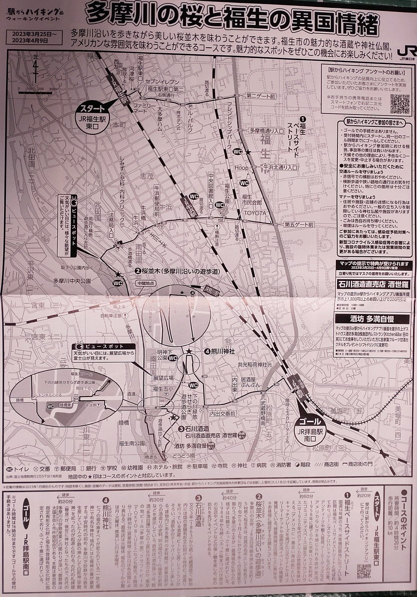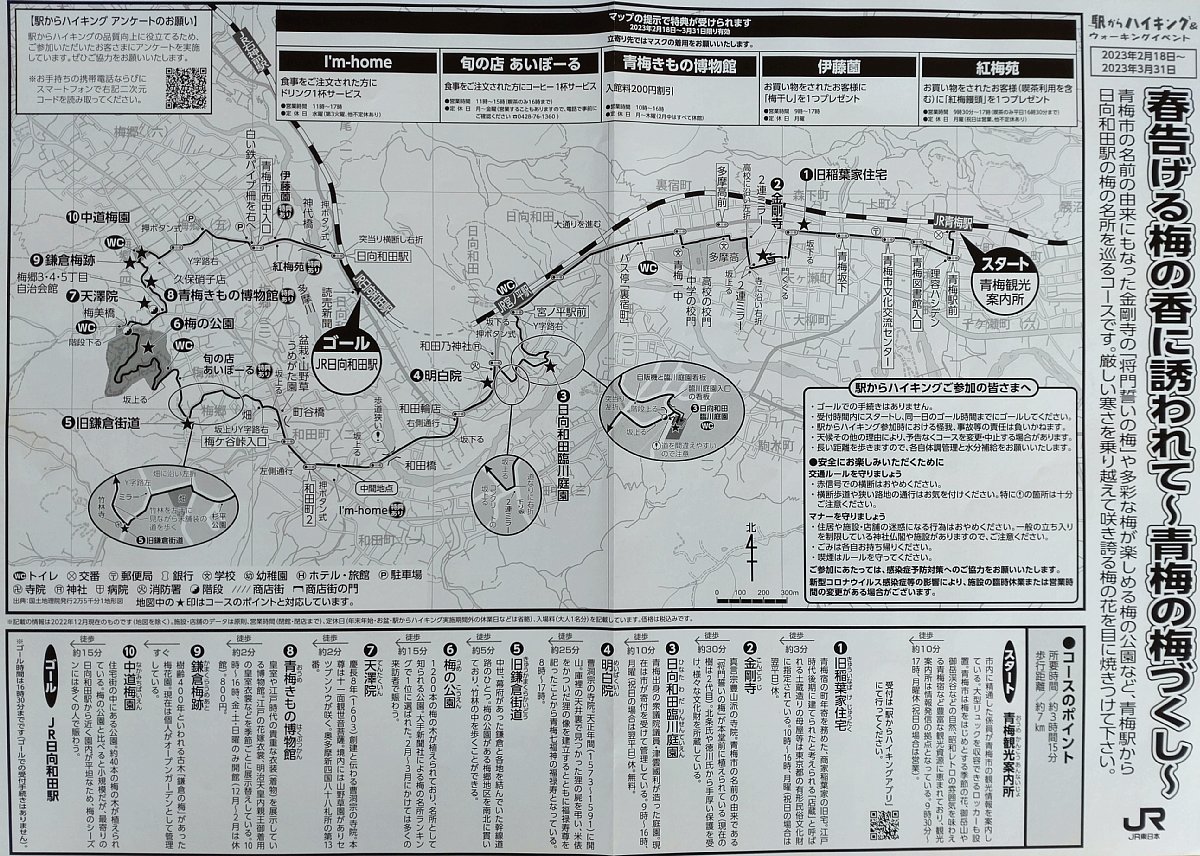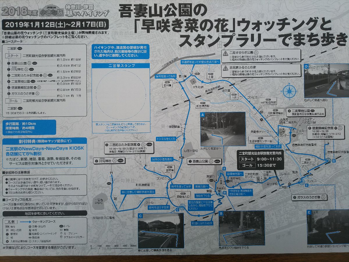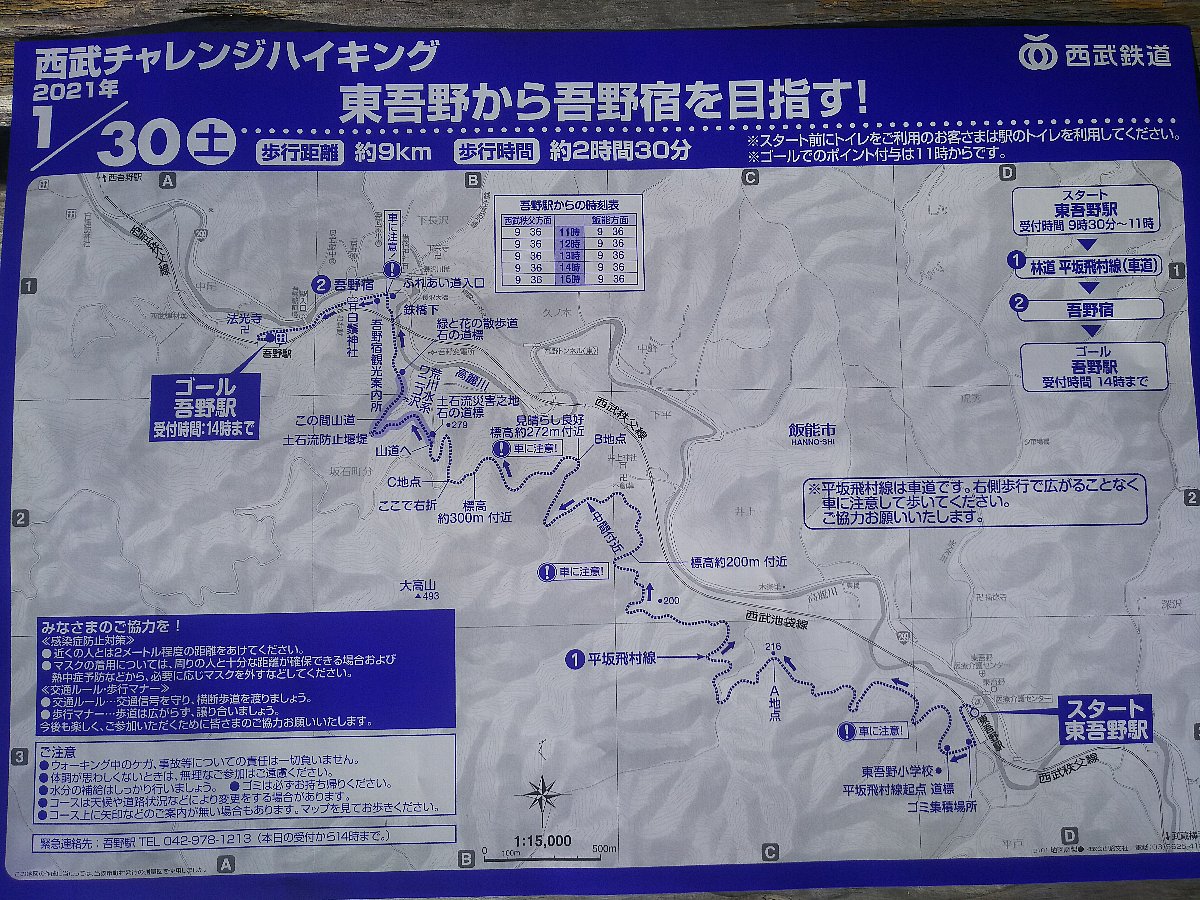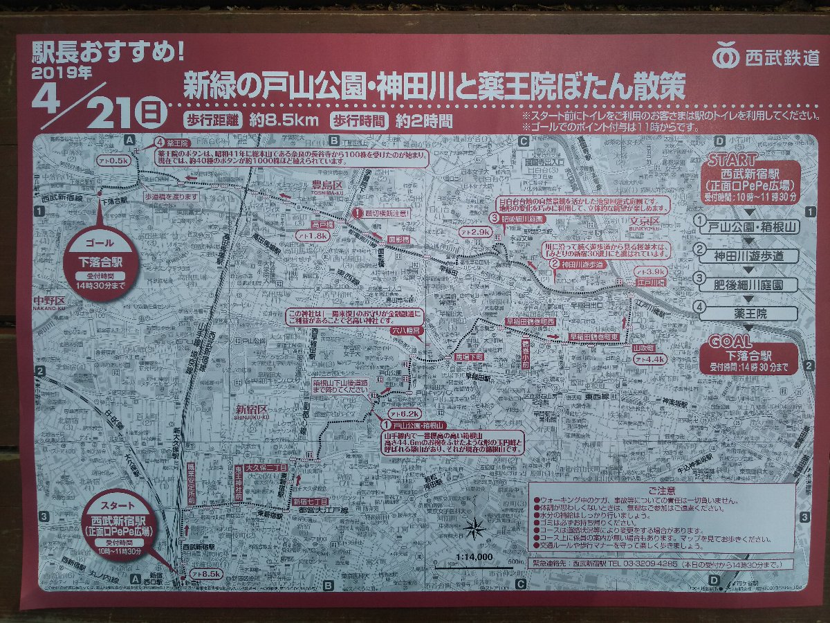 ★2019年12月10日(火)、気温(青梅)12.1/6.2℃、西武鉄道、「関のボロ市」フリー散策! 本立寺の門前で催されている「関のボロ市」へ。 その後は、武蔵関公園散策と、東伏見稲荷神社へ参拝。 ★「関のボロ市」 毎年12月9,10日に武蔵関駅北口から本立寺門前で行われる蚤の市を中心とする伝統行事。 ★2019年11月30日(土)、気温(青梅)11.3/-0.6℃、西武鉄道、眺望が素晴らしい関八州見晴台へ! 朝の最低気温が氷点下、快晴の天気の中、西吾野から関八州見晴台の西武鉄道のハイキング。 高山不動尊から関八州見晴台では紅葉がみられ、関八州見晴台(771m)では富士山がくっきりと望むことができた。 帰路は不動三滝(不動滝、大滝、白滝)の一つの白滝を観瀑。 ★2019年11月26日(火)、気温(青梅)11.9/6.3℃、西武鉄道、神宮外苑イチョウ並木フリー散策 前日は20℃越えの陽気から、本日は日中10℃以下の真冬の陽気。 神宮外苑のイチョウ並木周辺のフリー散策に参加、イチョウ並木は今月末くらいまで見頃の感じ。 聖徳記念絵画館は大正時代に建てられた明治天皇と昭憲皇太后の御事蹟を描いた80枚の絵画が展示、一時間以上かけて鑑賞。 最後は建設がやっと完成した新国立競技場を眺めてごオール。 ★2019年11月19日(火)、気温(青梅)19.9/12.4℃、西武鉄道、紅葉の石神井公園を歩く 3か月ぶりのウォーキング参加である。 今年は紅葉の時期が2週間ほど遅れているため、石神井公園の紅葉は一部色づいているがまだまだである。 ★2019年08月31日(土)、気温(青梅)30.2/22.8℃、秩父鉄道、JR東日本、長瀞七草寺めぐりハイキング とても蒸し暑い日で、時間の都合で一部カットした。 夏休み最後の週末のため長瀞は観光客であふれており、舟下りも待ちの行列ができていた。 ★2019年05月11日(土)、気温(青梅)27.4/12.3℃、西武鉄道、第8回うまかんべぇ〜ウォーキング 前日に続き27℃以上の夏日、うまかんべぇ〜ウォーキングに参加 うまかんべぇ〜祭り会場の一角に戦災建造物の急日立航空機株式会社変電所があり、ゴール後に見学。 ★2019年04月23日(火)、気温(青梅)23.5/14.8℃、西武鉄道、春風そよぐ秩父久那の里を訪ねて 今日も暑い日である。秩父では25℃越えの夏日であった。 久那の里では鯉のぼりの中、菜の花や八重桜、花桃などが咲き誇り武甲山を背景に眺めが良かった。 久那の里は「鯉のぼりの里」と言われ観光客が多く訪れている。 ★2019年04月21日(日)、気温(青梅)22.6/9℃、西武鉄道、新緑の戸山公園・神田川と薬王院ぼたん散策 薬王院のぼたんは見頃で多くの観賞客が訪れていた。 神田川遊歩道の桜並木は既に葉桜である。 肥後細川庭園ではシャガの花が満開で綺麗であった ★2019年04月05日(金)、気温(青梅)23.7/4.4℃、西武鉄道、春色の横手渓谷から多峯主山を歩く! 2・3日前の2月の陽気から今日は初夏の陽気で20℃越え、日差しも強くとても暑かった。 多峯主山からの展望がよく富士山や武甲山を眺めることができた。 帰途の反応中央公園の桜はほぼ満開で多くの花見客で賑わっていた。 ★2019年03月26日(火)、西武鉄道、花揺れる清流を歩き、春を満喫! 都心では桜の花が満開になろうとしているが、今回のコース上では桜は開花したばかりである。 春先は雨が少ないためか落合川の水量は少なく、黒目川では干上がっているところもあった。 キブシ、トサミズキやユキヤナギが落合川で多く見られ、黒目川のしんやま親水広場の桜は月末が花見頃である。 ★2019年03月23日(土)、西武鉄道、天覧山、多峯主山から吾妻峡へ! 前日(3/22)の20℃超えの陽気から今日は10℃以下の真冬並みの寒さ。 飯能駅から天覧山、多峯主、御嶽八幡神社、吾妻峡、飯能河原、飯能駅のコース。 昨日のような陽気なら飯能河原ではBBQや河原遊びで賑わうところだが、今日は閑散としていた。 ★2019年03月12日(火)、西武鉄道、加治丘陵から桜山展望台を訪ねて! 4月中旬の陽気が続いてスギ花粉の飛散が非常に強い中、桜山展望台を訪ねるウォーキング。 桜山展望台からは富士山やスカイツリーの展望が酔うところだが、生憎訪れた時には雲の中、霞の中であった。 コース途中の農家の畑で雄のキジに遭遇、多くのウォーカーが傍を通っても逃げない人馴れしたキジ。 ★2019年02月26日(火)、JR東日本、江戸時代の川崎宿を感じながら過去から未来へと巡る 東海道川崎宿を散策、最後に東芝未来科学館の見学。 ★2019年02月08日(金)、JR東日本、柏の街並みと手賀沼の景観を楽しむ安らぎウォーキング 昨日は4月の陽気、今日は真冬の陽気、明日は40年ぶりの寒さになるところもあり、積雪の予報が出ている。 今日の目玉は利根川の水を江戸川に送っている北千葉導水路にある北千葉導水ビジターセンターの見学であった。 北風が吹き寒い中のウォーキングであったので、寒さをしのぐ休憩場所でもあった。 ★2019年01月20日(日)、JR東日本、吾妻山公園の「早咲き菜の花」ウォッチング 今日は24節気の「大寒」、一年で最も寒の厳しい時期である。 早咲き菜の花と富士山が有名な二宮の吾妻山を巡