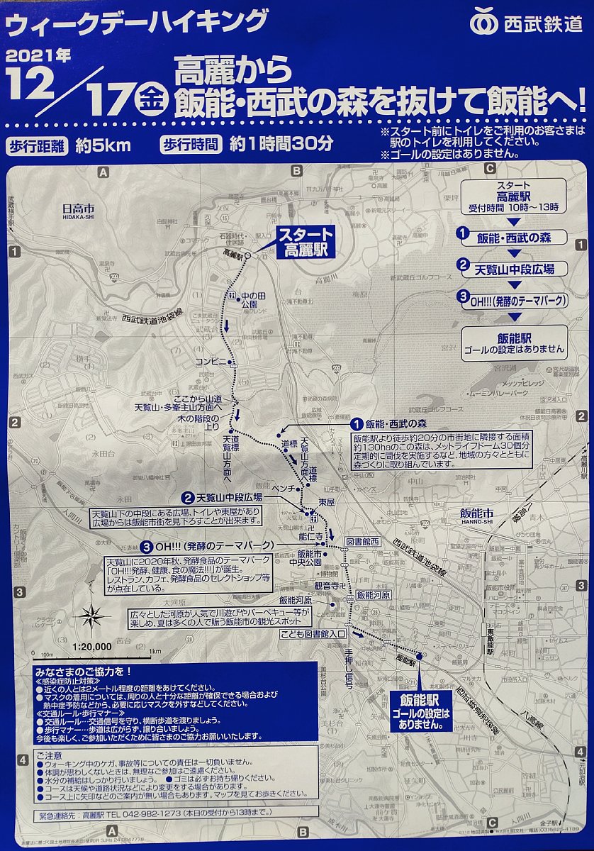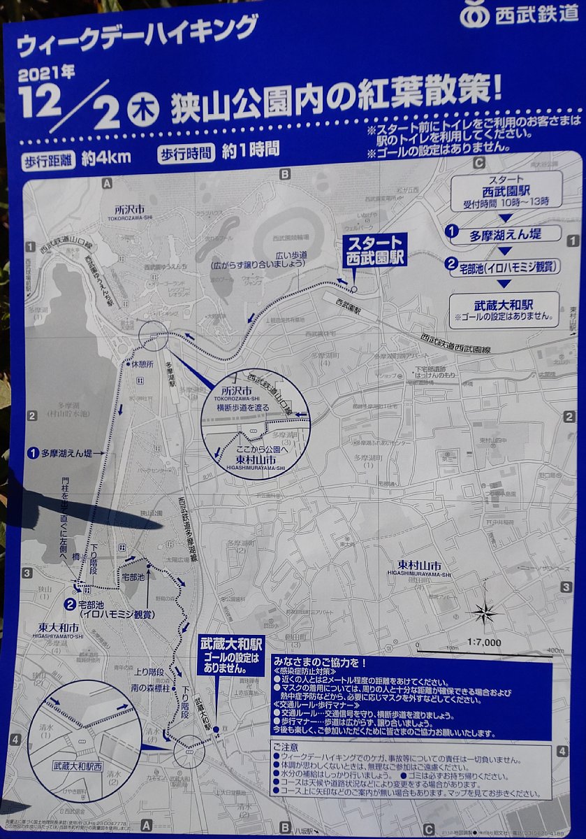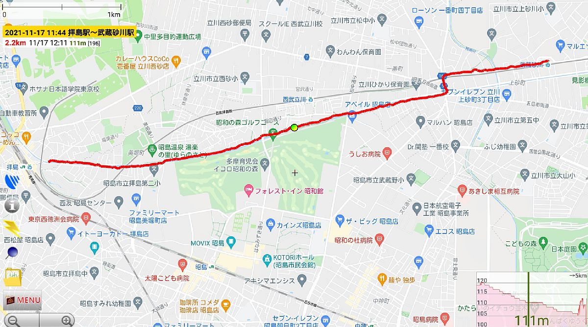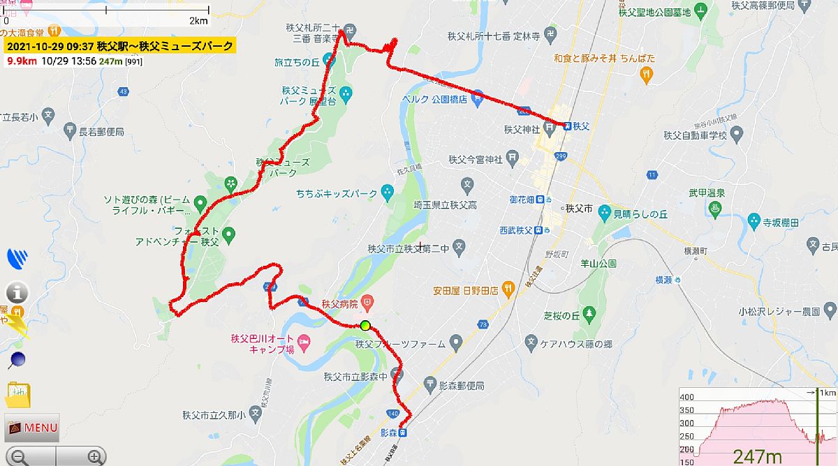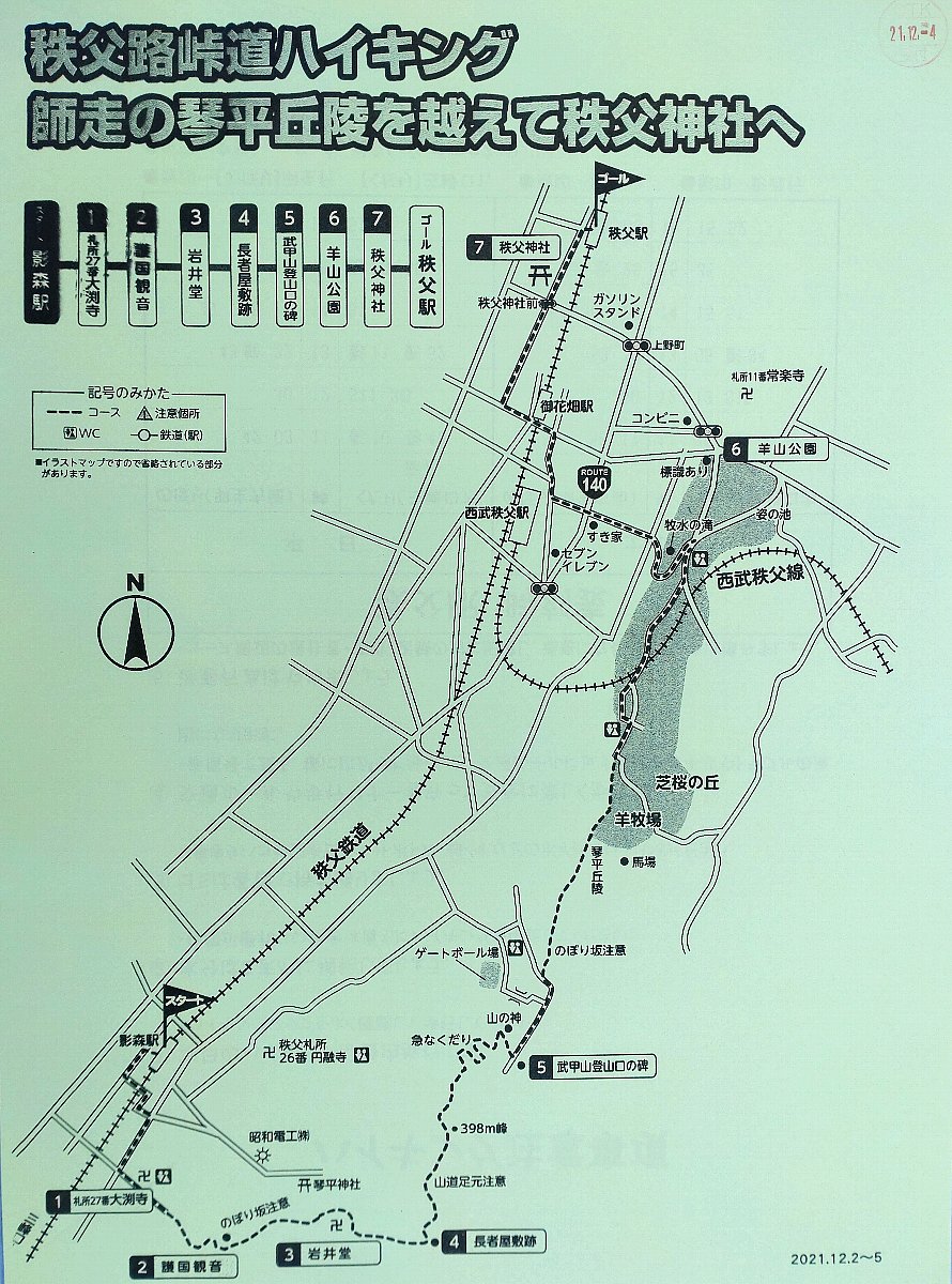 ★2021年12月04日(土) 晴れ、気温(青梅)14.6/1.6℃、秩父鉄道、師走の琴平丘陵を越えて秩父神社へ 秩父市の最低気温が氷点下であったが快晴でスタート時点では絶好のコンディションとなり、琴平丘陵の尾根を縦走。 羊山公園で昼食、ゴールは秩父神社でこの一年間の秩父地域のハイキング&ウォーキングの無事感謝のお礼参拝。 帰路はご褒美に西武秩父線の特急ラビューでゆったりと家路に就く。 ★2021年12月02日(木) 晴れ、気温(青梅)12.9/0.5℃、西武鉄道、狭山公園内の紅葉散策! 西武園駅から多摩湖、狭山公園へ、ゴールは武蔵大和駅。 狭山公園の紅葉はピークを過ぎたところだが充分観賞・堪能でき、多摩湖からは富士山が綺麗に眺望することができた。 ★2021年11月26日(金) 晴れ、気温(青梅)15.8/3.1℃、西武鉄道、紅葉の吾野・東郷公園を訪ねる! 吾野駅と東郷公園の往復のコース。東郷公園は紅葉の名所で秩父御嶽神社の神苑。 東郷公園には東郷元帥の銅像があり公園内に日露戦争の遺物や記念品が点在している。 秩父御嶽神社の参道石段は数百段の急階段で途中休み休みであった。 ★2021年11月17日(水) 晴れ、気温(青梅)16.3/7.0℃、西武鉄道、玉川上水緑道を歩く! 拝島駅から武蔵砂川駅の玉川上水緑道約5?のウォーキング、緑道の紅葉はこれからである。 歩行距離が短いのでハイペースの5km/H強で歩いた。 ★2021年11月14日(日) 晴れ、気温(青梅)17.3/5.9℃、秩父鉄道、熊倉城址を越えて弟富士山へ 白久駅から熊倉城址(城山)を経て武州日野駅にゴールするコース。熊倉城址(城山648m)までは急峻な階段道(煩悩坂)、尾根縦走で小ピークを幾つも階段道のアップダウンを繰り返しとてもハードなコースであった。下山はほとんどが林道で快適な後半だった。 ゴール手前の弟富士山には行かず、道の駅「あらかわ」で昼食、蒸気機関車SLパレオエクスプレスの動画撮影後に武州日野駅。 武州日野駅では今年9月に導入した保線専用車両(08-1X)の撮影に成功。 ★2021年11月07日(日)立冬 晴れ、気温(青梅)18.1/9.8℃、秩父鉄道、フリーハイキング 金ヶ嶽 歩くには好コンディションの低山登山(ハイキング)であった。 野上駅をスタート、高砂橋、春日神社(金ヶ嶽370m)、植平峠、仙元峠、塞神峠、金石水管橋、 ゴールはスタート同じ野上駅であったが、昼食の場所として長瀞岩畳にするためゴールは長瀞岩畳に変更した。 ★2021年10月31日(日) 曇り|雨、気温(青梅)15.2/9.7℃、西武鉄道、小平グリーンロードから田無アスタ専門店内でショッピング 時々小雨がパラツク日であったが、歩くには問題なく快適であった。 田無神社で参拝し、田無駅にゴール&昼食。 ★2021年10月29日(金) 晴れ、気温(青梅)19.6/8.5℃、秩父鉄道、秩父ミューズパークのイチョウ鑑賞ハイキング 今日も快晴でウォーキングに最適であった。 秩父ミューズパーク内の長いイチョウ並木の黄葉は見頃で青空に黄色に黄葉したイチョウを堪能することができ、 また武甲山の雄大な姿もすばらしかった。 ★2021年10月28日(木) 晴れ、気温(青梅)22.5/10.1℃、西武鉄道、川越総合卸売市場から入間川沿いを歩く! 快晴でウォーキング日和、入間川沿いを気持ちよく歩くことができた。 ★2021年10月22日(金) 曇り|雨、気温(青梅)12.1/9.0℃、秩父鉄道・東武鉄道、鐘撞堂山から円良田湖をめぐるハイキング 寄居家期から大正池経由で鐘撞堂山へ、下山は円良田湖経由で波久礼駅のルート。 今回は、金子駅(JR)→寄居駅→ハイキング⇒波久礼駅(父鉄)→御花畑駅(父鉄)、西武秩父駅(西武)→東飯能駅→金子駅(JR)と 鉄道を多く利用しての参加。天候は曇り時々小雨とまずまずで歩くのには良いコンディションであった。 ◆秩父鉄道秩父駅に入線するSLパレオエクスプレス(PaleoExpress) ◆秩父鉄道波久礼駅に向かう影森行き電車 ★2021年10月14日(木) 晴れ、気温(青梅)23.3/14.6℃、西武鉄道、日高市山脈公園から横手渓谷を歩く! 紅葉にはまだ早い横手渓谷である。見頃は来月半ばである。 横手渓谷は西武鉄道秩父線の武蔵横手駅付近の高麗川で遊歩道があり散策できる。 ★2021年10月09日(土) 曇り、気温(青梅)26.1/17.5℃、西武鉄道、加治丘陵から桜山展望台を訪ねて! 晴れていれば桜山展望台から富士山を眺めることができるのだが、生憎の曇り空。 元加治駅から入間川河川敷にある阿須運動公園を経て桜山展望台、そして仏子駅に至るハイキングコース。 ★2021年09月30日(木) 曇り、気温(青梅)26.8/17.1℃、西武鉄道、曼殊沙華咲く 入間川沿いを歩く! 台風16号が明日にも関東地方に近づき風雨が心配されれ蒸し暑い中での入間川沿いウォーキング。 市民運動場脇のヒガンバナは既に終わっていたが、入間川遊歩道のヒガンバナは鑑賞できる状況であった。 ★2021年09月25日(土) 雨/曇り、気温(青梅)22.0/18.5℃、秩父鉄道、そばの花咲く秩父あらかわの里山歩きと彼岸花観賞 霧雨で気温も20℃位と、前日が真夏日と思えないほどの肌寒い中であったが、ちちぶ花見の里では満開のそばの花、深山の花園ではピークを過ぎていたがガンバナ観賞、ま