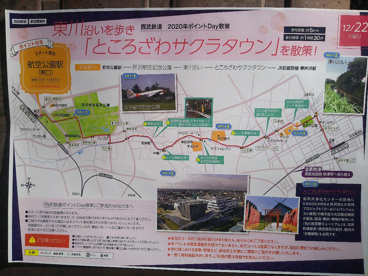 今年最後のウォーキングイベントに参加。東川沿いには桜並木が続いており桜の季節に訪れたいところである。 航空公園は日本で最初の飛行場の跡地に整備され、YS-11旅客機やC-46A輸送機の展示や航空発祥記念館などがある。 ところざわサクラタウンは所沢浄化センター跡地にKADOKAWAと所沢市の共同プロジェクト「クールジャパンフォレスト構想」の大型複合施設。 ------------------------------------------------------------------------------------------------------------
