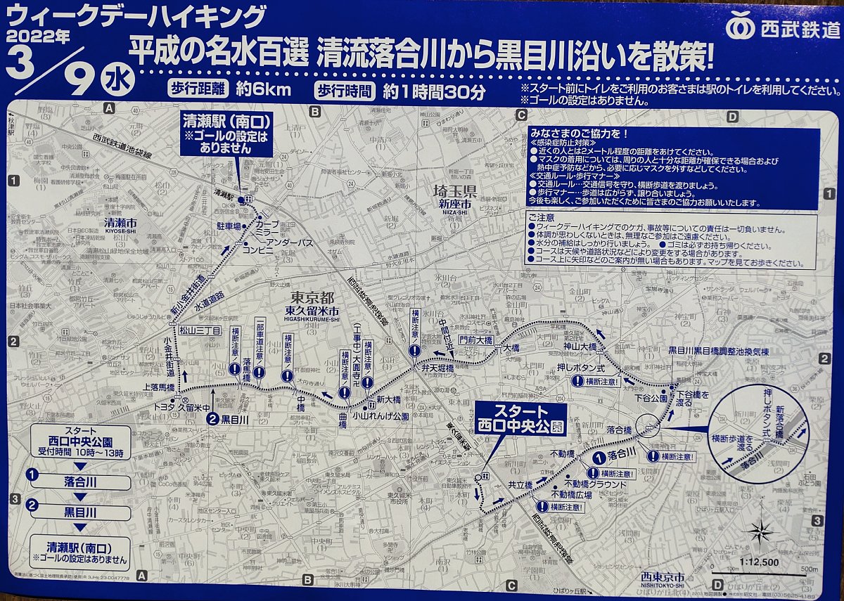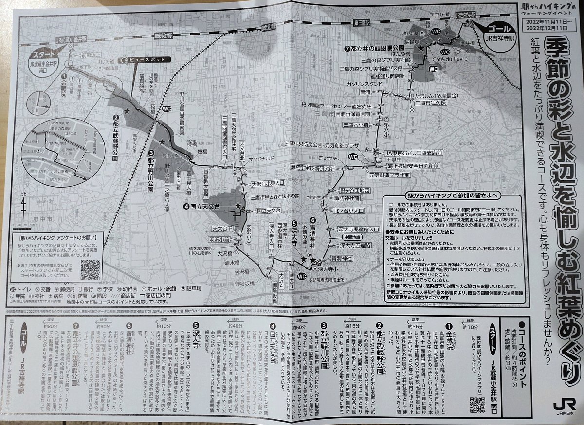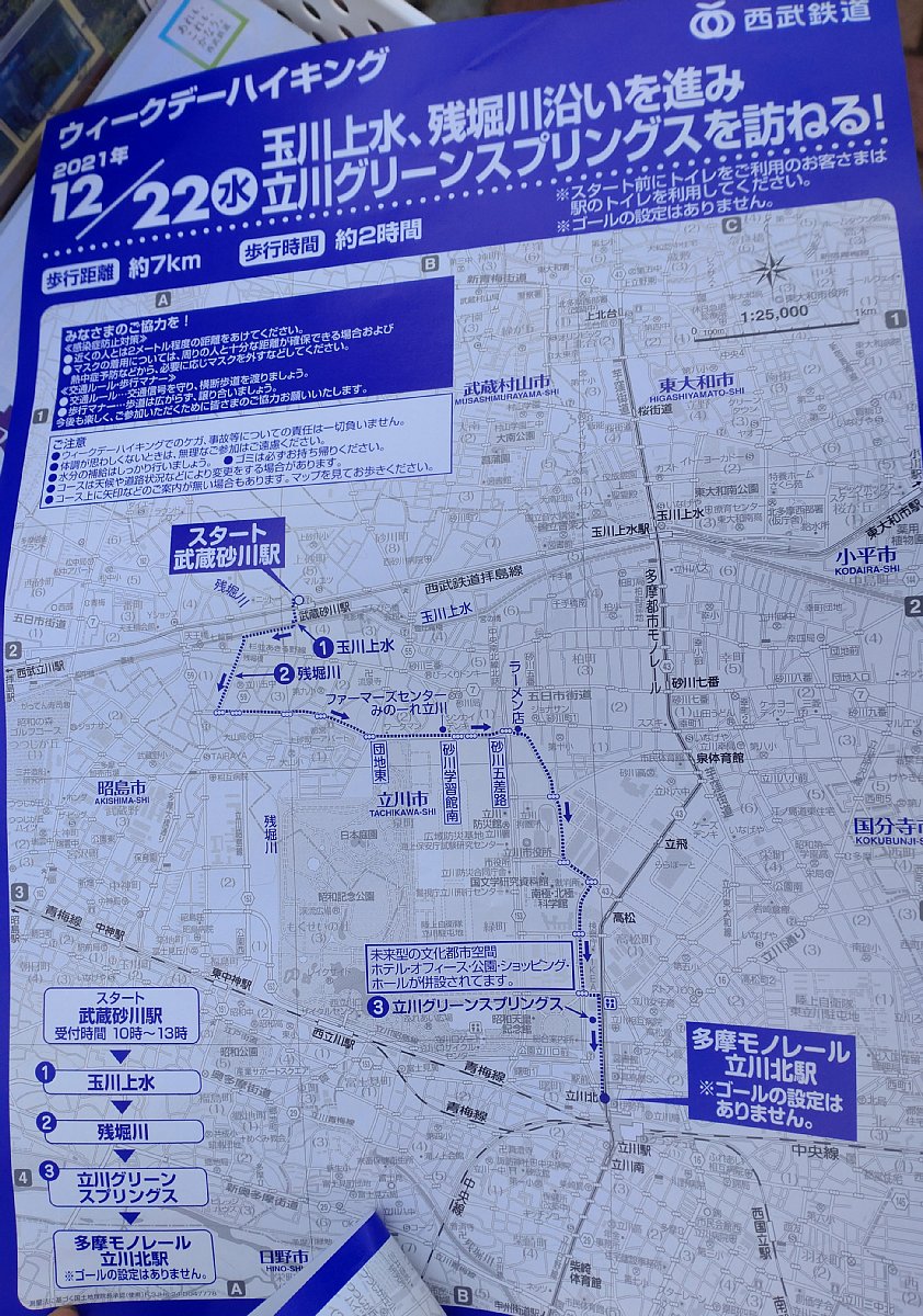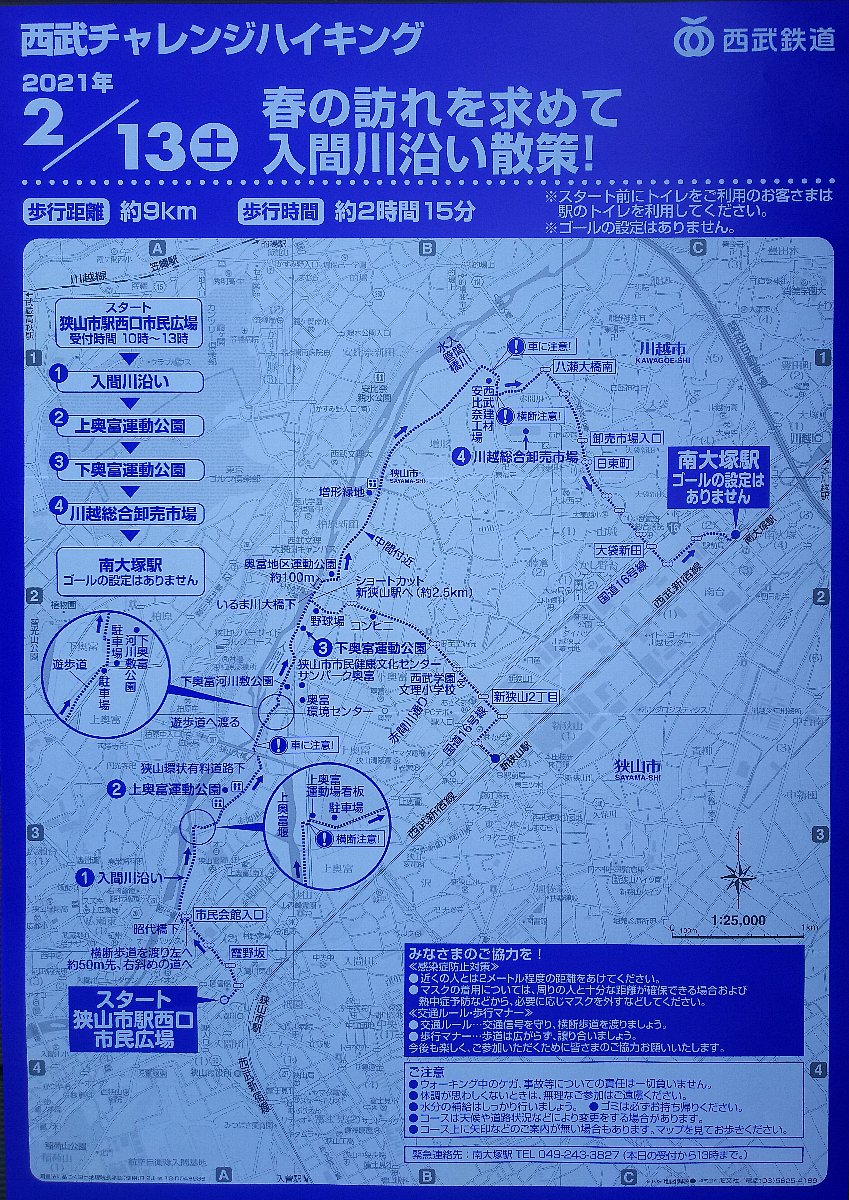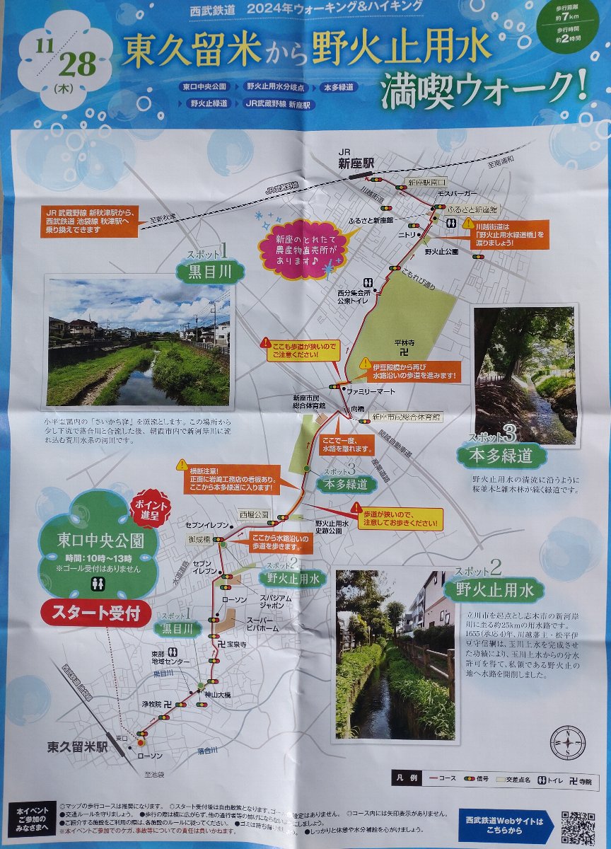★2025年09月17日(水) 晴れ、気温(青梅)35.2/23.0℃、西武鉄道、「千川上水を踏破!」武蔵野の屋敷林をめぐる! 猛暑日となった、とてもつらいウォーキングであった。 蒸し暑く汗だくで途中道を間違えるなどして、集中力が散漫ながら歩き切った。 ★2025年09月10日(水) 晴れ/曇り、気温(青梅)32.9/24.2℃、西武鉄道、八国山緑道から荒幡富士へ 佐山丘陵を歩く! 午後から曇りで時々雨、蒸し暑い中でのウォーキング。 ●八国山緑道:狭山丘陵の東端にある八国山のコナラやクヌギの雑木林。 ●荒幡富士:明治32年完成した歴史ある富士塚で、関東では最も大きな富士塚と言われている ★2025年09月03日(水) 晴れ、気温(青梅)36.2/23.9℃、西武鉄道、多摩川沿いの福生南公園、水鳥公園から五鉄通りを歩く! 9月になっても猛暑日が続いている、久しぶり(2ヶ月ぶり)のウォーキング参加。 一番暑い時間帯に歩いたので汗びっしょり、日傘をさしてではあったがこの暑さ(青梅36℃越え)には参った。 ★2025年07月02日(水) 晴れ、気温(青梅)33.2/22.3℃、西武鉄道、「千川上水を踏破!」取水口をめぐる! 今日も夏日2Wほど続いている。6月の平均気温が過去最高を記録、今月も夏日が続いて梅雨明け間近か? 新小金井駅から玉川上水緑道を歩き境水衛所跡(千川上水の取水口)から千川上水(緑道)を歩き東伏見駅がゴール。 ●千川上水:元々は5代将軍綱吉の立ち寄り先である小石川御殿、湯島聖堂、寛永寺、」浅草寺等への給水を目的として作られた ★2025年06月25日(水) 雨/曇り、気温(青梅)29.1/23.1℃、西武鉄道・JR東日本、夏の訪れを感じながら御岳溪谷遊歩道を歩く! 歩き始める直前まで強い雨であったが、御嶽駅を雨上がりで蒸し暑い中スタート。 雨でぬれた遊歩道は歩きにくかったが御岳溪谷を楽しめた。 ★2025年06月18日(水) 晴れ、気温(青梅)34.7/24.4℃、西武鉄道、玉川上水緑道を歩く! 昨日は猛暑日、今日は猛暑日一歩手前の炎天下でのウォーキング、 しかし玉川上水緑道では木陰が多く涼しい風が吹く中でのウォーキングだった。 ★2025年06月11日(水) 雨、気温(青梅)21.5/19.2℃、西武鉄道、智光山公園の花菖蒲鑑賞ピクニックへ! 昨日梅雨入りした、昨年より11日早く平年より3日遅い。 今日は雨の中を智光山公園の花菖蒲鑑賞のウォーキング、智光山公園に着くころから本格的な雨となり 足元がずぶ濡れにながらの花菖蒲鑑賞であった。花菖蒲園には約2,600株もの花が咲きここっていた。 ★2025年05月21日(水)小満 晴れ、気温(青梅)30.5/18.0℃、西武鉄道、玉川上水緑道を歩く! 昨日は真夏日、今日も真夏日で蒸し暑い。 玉川上水緑道は木陰で涼しい風があり比較的歩きやすいウォーキングであった。 ★2025年04月05日(土) 晴れ、気温(青梅)16.2/1.1℃、西武鉄道、西新宿 代々木を散策! 神田川のサクラの花見ウォーキング、北風があり肌寒かったが絶好の花見日和である。 神田川沿いのサクラは満開でおお花見の人出で川沿いの遊歩道は混雑が激しかった。 が、約3?程の満開の神田川沿いのサクラを楽しむことができた。 ★2025年03月18日(火) 晴れ|曇り、気温(青梅)11.7/2.7℃、JR東日本、町田三天神と梅、桜をめぐるコース 町田三天神(町田天満宮、南大谷天神、菅原神社)と梅・桜をめぐるコースであったが、 梅はすでに終わり桜は早咲きがチラホラで時期が悪かった。(コース期間は3/1〜3/31) 恩田川沿いに早咲きのサクラとカワセミ、まちだのデコイチ(D51862)は楽しめた。 ★2025年03月07日(金) 晴れ、気温(青梅)10.6/0.6℃、JR東日本、目黒川がつなぐ歴史・ぶんかの街を歩く 北風が強く吹く中のウォーキングであった。 目黒川沿いのサクラはまだ咲く気配がない、 寒かったので足早に回ったが、旧朝倉家住宅とめぐろ歴史資料館を見学した。 ★2025年01月11日(土) 晴れ、気温(青梅)10.6/-4.2℃、秩父鉄道、新春開運祈願!秩父街なか歩きと自社巡り 今年初めてのウォーキングイベントに参加、秩父鉄道主催の秩父街なか歩きと自社巡りである。 最低気温青梅ー4.2、秩父-6.6℃と1月に入ってからの最低気温の中ではあったが日中は日差しがあり暖かく感じた。 秩父神社の初参拝をスタートに8か所をめぐり、ゴールでは秩父市のマスコットキャラクタの「ポテくまくん」に遭遇。