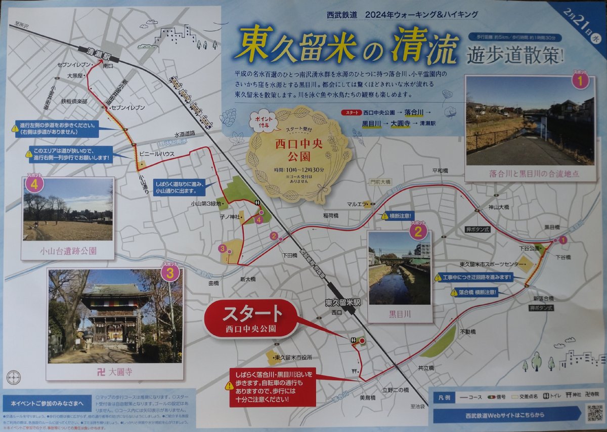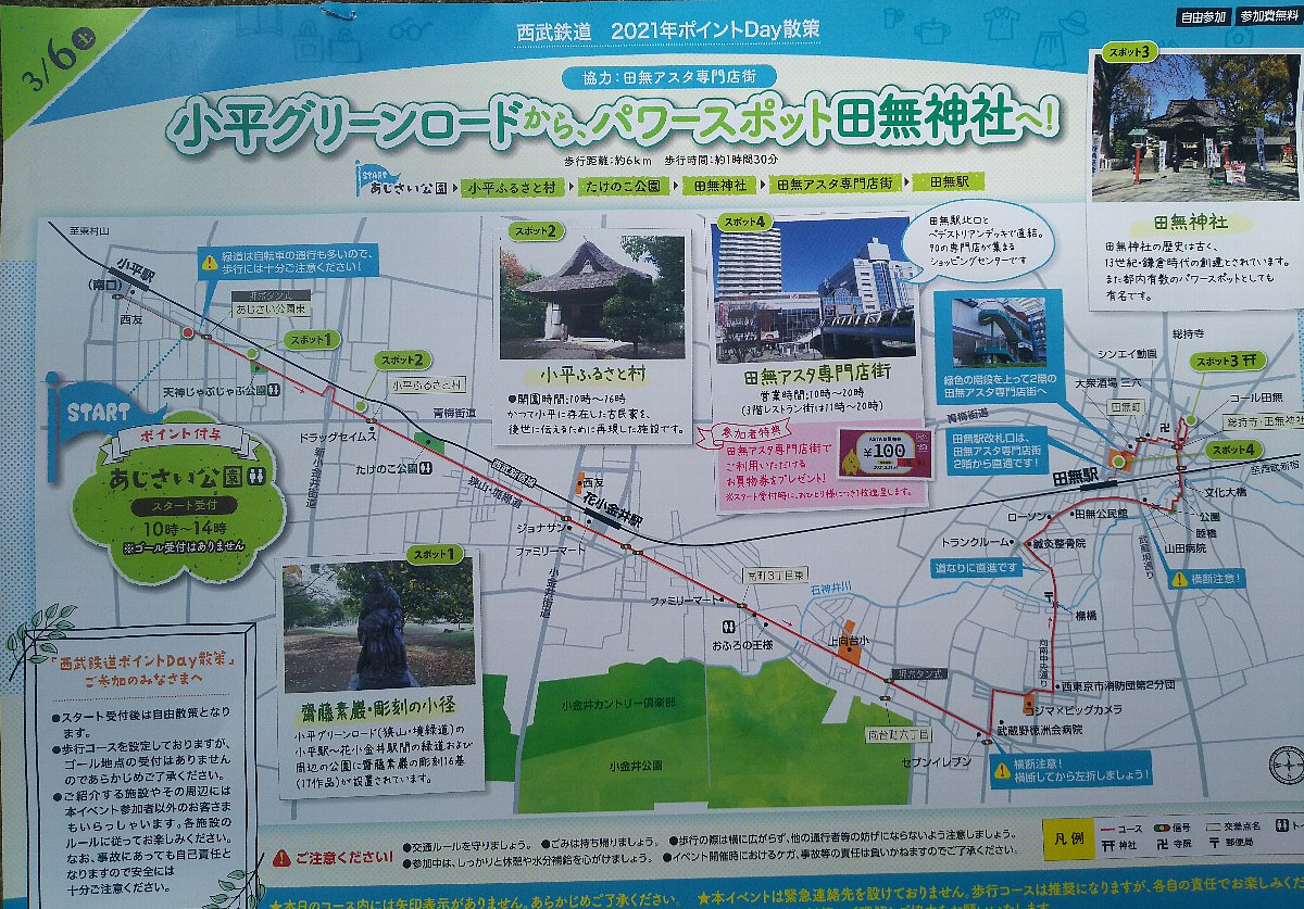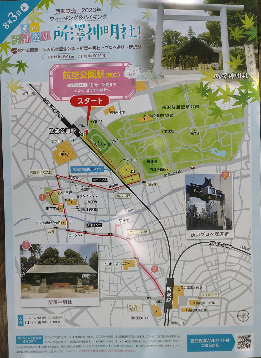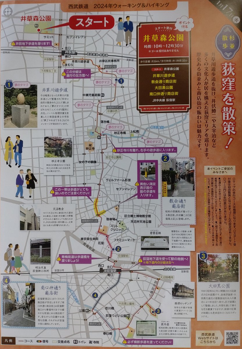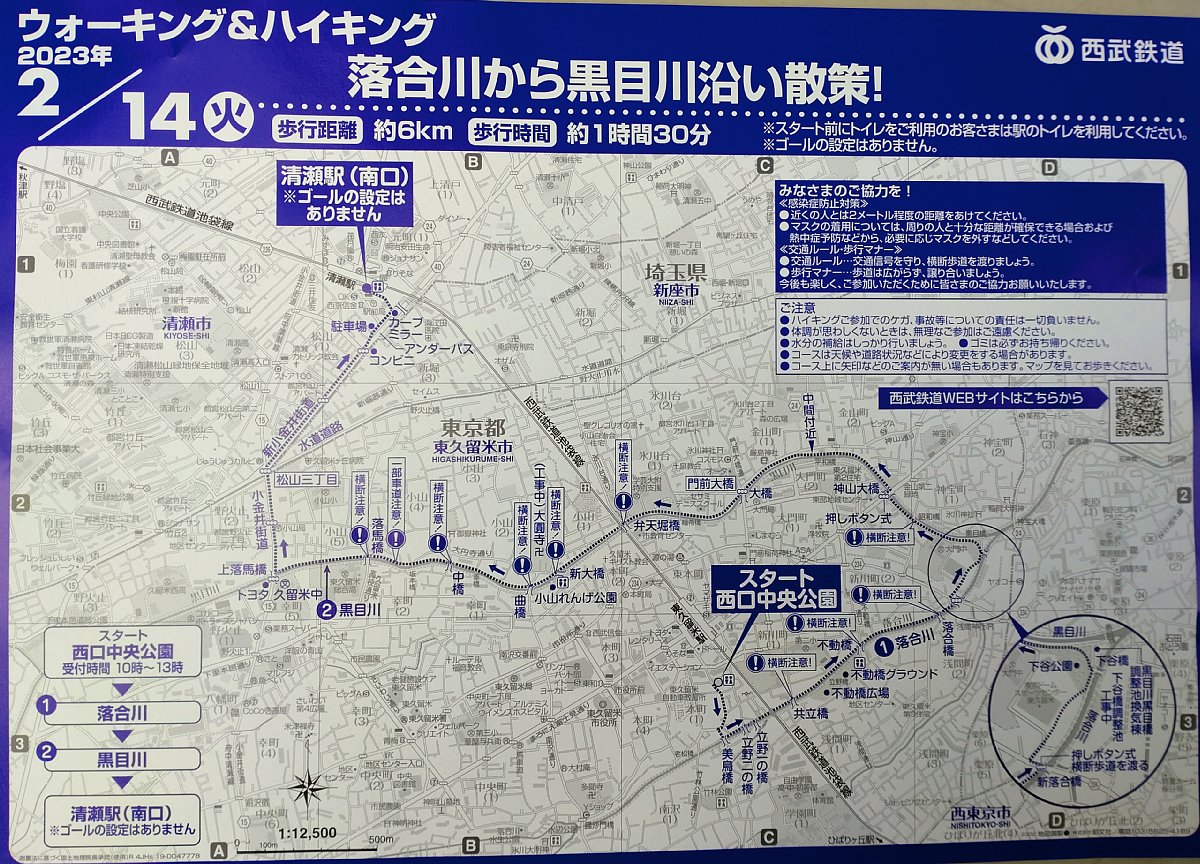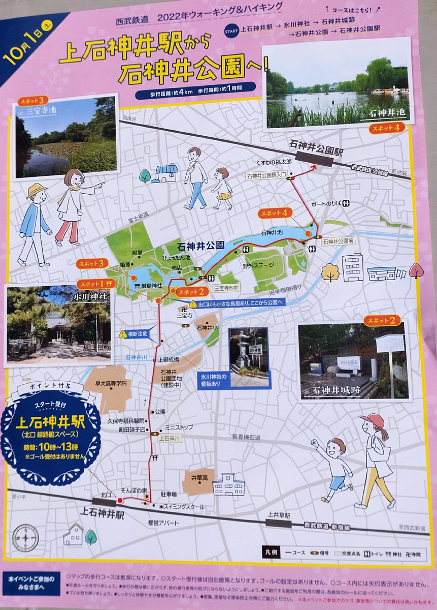 ★2025年09月17日(水) 晴れ、気温(青梅)35.2/23.0℃、西武鉄道、「千川上水を踏破!」武蔵野の屋敷林をめぐる! 猛暑日となった、とてもつらいウォーキングであった。 蒸し暑く汗だくで途中道を間違えるなどして、集中力が散漫ながら歩き切った。 ★2025年09月10日(水) 晴れ/曇り、気温(青梅)32.9/24.2℃、西武鉄道、八国山緑道から荒幡富士へ 佐山丘陵を歩く! 午後から曇りで時々雨、蒸し暑い中でのウォーキング。 ●八国山緑道:狭山丘陵の東端にある八国山のコナラやクヌギの雑木林。 ●荒幡富士:明治32年完成した歴史ある富士塚で、関東では最も大きな富士塚と言われている ★2025年09月03日(水) 晴れ、気温(青梅)36.2/23.9℃、西武鉄道、多摩川沿いの福生南公園、水鳥公園から五鉄通りを歩く! 9月になっても猛暑日が続いている、久しぶり(2ヶ月ぶり)のウォーキング参加。 一番暑い時間帯に歩いたので汗びっしょり、日傘をさしてではあったがこの暑さ(青梅36℃越え)には参った。 ★2025年07月02日(水) 晴れ、気温(青梅)33.2/22.3℃、西武鉄道、「千川上水を踏破!」取水口をめぐる! 今日も夏日2Wほど続いている。6月の平均気温が過去最高を記録、今月も夏日が続いて梅雨明け間近か? 新小金井駅から玉川上水緑道を歩き境水衛所跡(千川上水の取水口)から千川上水(緑道)を歩き東伏見駅がゴール。 ●千川上水:元々は5代将軍綱吉の立ち寄り先である小石川御殿、湯島聖堂、寛永寺、」浅草寺等への給水を目的として作られた ★2025年06月25日(水) 雨/曇り、気温(青梅)29.1/23.1℃、西武鉄道・JR東日本、夏の訪れを感じながら御岳溪谷遊歩道を歩く! 歩き始める直前まで強い雨であったが、御嶽駅を雨上がりで蒸し暑い中スタート。 雨でぬれた遊歩道は歩きにくかったが御岳溪谷を楽しめた。 ★2025年06月18日(水) 晴れ、気温(青梅)34.7/24.4℃、西武鉄道、玉川上水緑道を歩く! 昨日は猛暑日、今日は猛暑日一歩手前の炎天下でのウォーキング、 しかし玉川上水緑道では木陰が多く涼しい風が吹く中でのウォーキングだった。 ★2025年06月11日(水) 雨、気温(青梅)21.5/19.2℃、西武鉄道、智光山公園の花菖蒲鑑賞ピクニックへ! 昨日梅雨入りした、昨年より11日早く平年より3日遅い。 今日は雨の中を智光山公園の花菖蒲鑑賞のウォーキング、智光山公園に着くころから本格的な雨となり 足元がずぶ濡れにながらの花菖蒲鑑賞であった。花菖蒲園には約2,600株もの花が咲きここっていた。 ★2025年05月21日(水)小満 晴れ、気温(青梅)30.5/18.0℃、西武鉄道、玉川上水緑道を歩く! 昨日は真夏日、今日も真夏日で蒸し暑い。 玉川上水緑道は木陰で涼しい風があり比較的歩きやすいウォーキングであった。 ★2025年04月05日(土) 晴れ、気温(青梅)16.2/1.1℃、西武鉄道、西新宿 代々木を散策! 神田川のサクラの花見ウォーキング、北風があり肌寒かったが絶好の花見日和である。 神田川沿いのサクラは満開でおお花見の人出で川沿いの遊歩道は混雑が激しかった。 が、約3?程の満開の神田川沿いのサクラを楽しむことができた。 ★2025年03月18日(火) 晴れ|曇り、気温(青梅)11.7/2.7℃、JR東日本、町田三天神と梅、桜をめぐるコース 町田三天神(町田天満宮、南大谷天神、菅原神社)と梅・桜をめぐるコースであったが、 梅はすでに終わり桜は早咲きがチラホラで時期が悪かった。(コース期間は3/1〜3/31) 恩田川沿いに早咲きのサクラとカワセミ、まちだのデコイチ(D51862)は楽しめた。 ★2025年03月07日(金) 晴れ、気温(青梅)10.6/0.6℃、JR東日本、目黒川がつなぐ歴史・ぶんかの街を歩く 北風が強く吹く中のウォーキングであった。 目黒川沿いのサクラはまだ咲く気配がない、 寒かったので足早に回ったが、旧朝倉家住宅とめぐろ歴史資料館を見学した。 ★2025年01月11日(土) 晴れ、気温(青梅)10.6/-4.2℃、秩父鉄道、新春開運祈願!秩父街なか歩きと自社巡り 今年初めてのウォーキングイベントに参加、秩父鉄道主催の秩父街なか歩きと自社巡りである。 最低気温青梅ー4.2、秩父-6.6℃と1月に入ってからの最低気温の中ではあったが日中は日差しがあり暖かく感じた。 秩父神社の初参拝をスタートに8か所をめぐり、ゴールでは秩父市のマスコットキャラクタの「ポテくまくん」に遭遇。