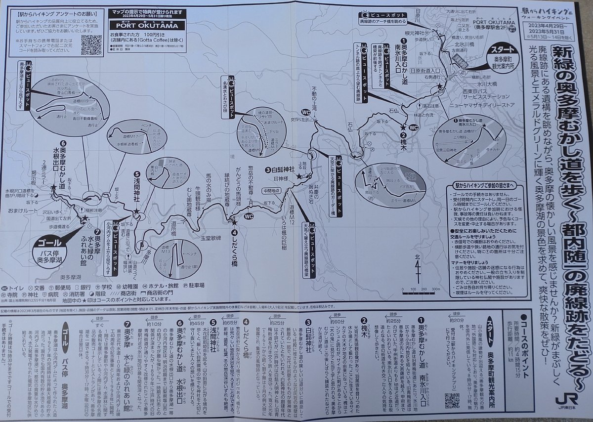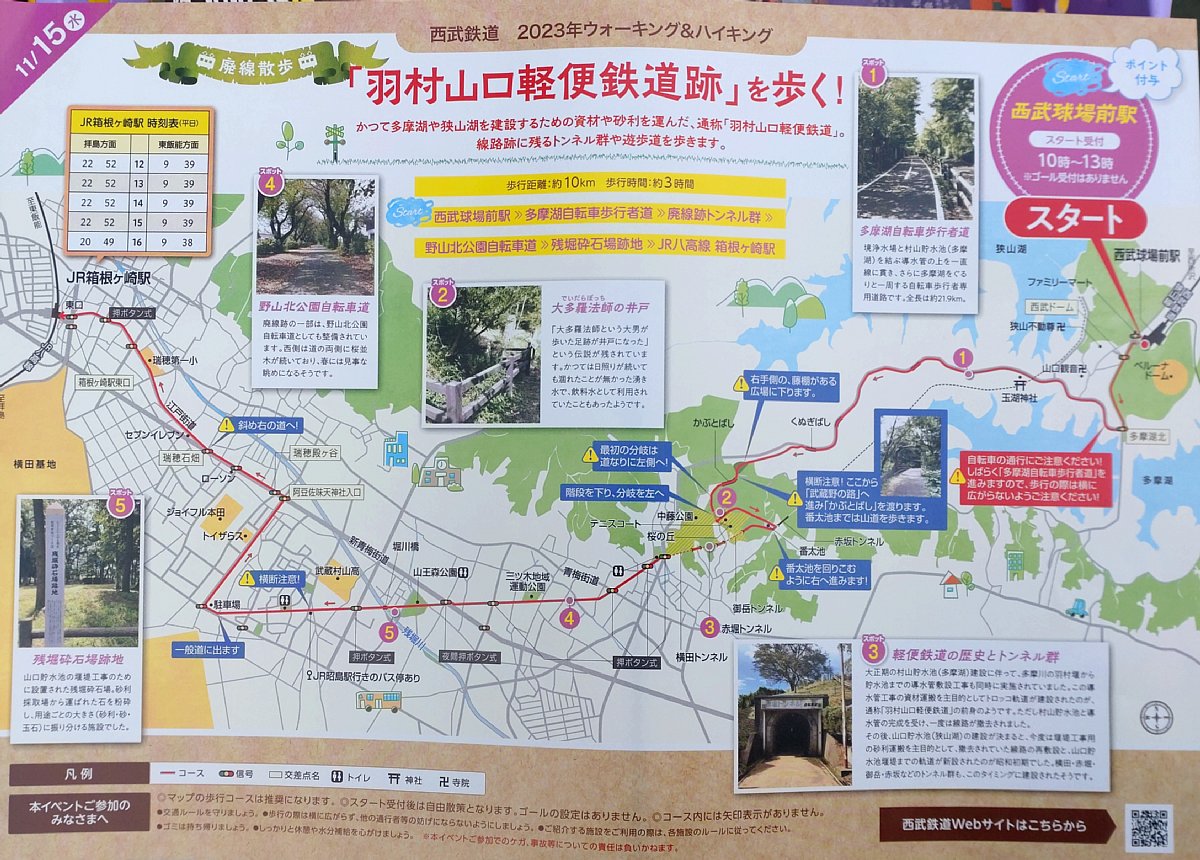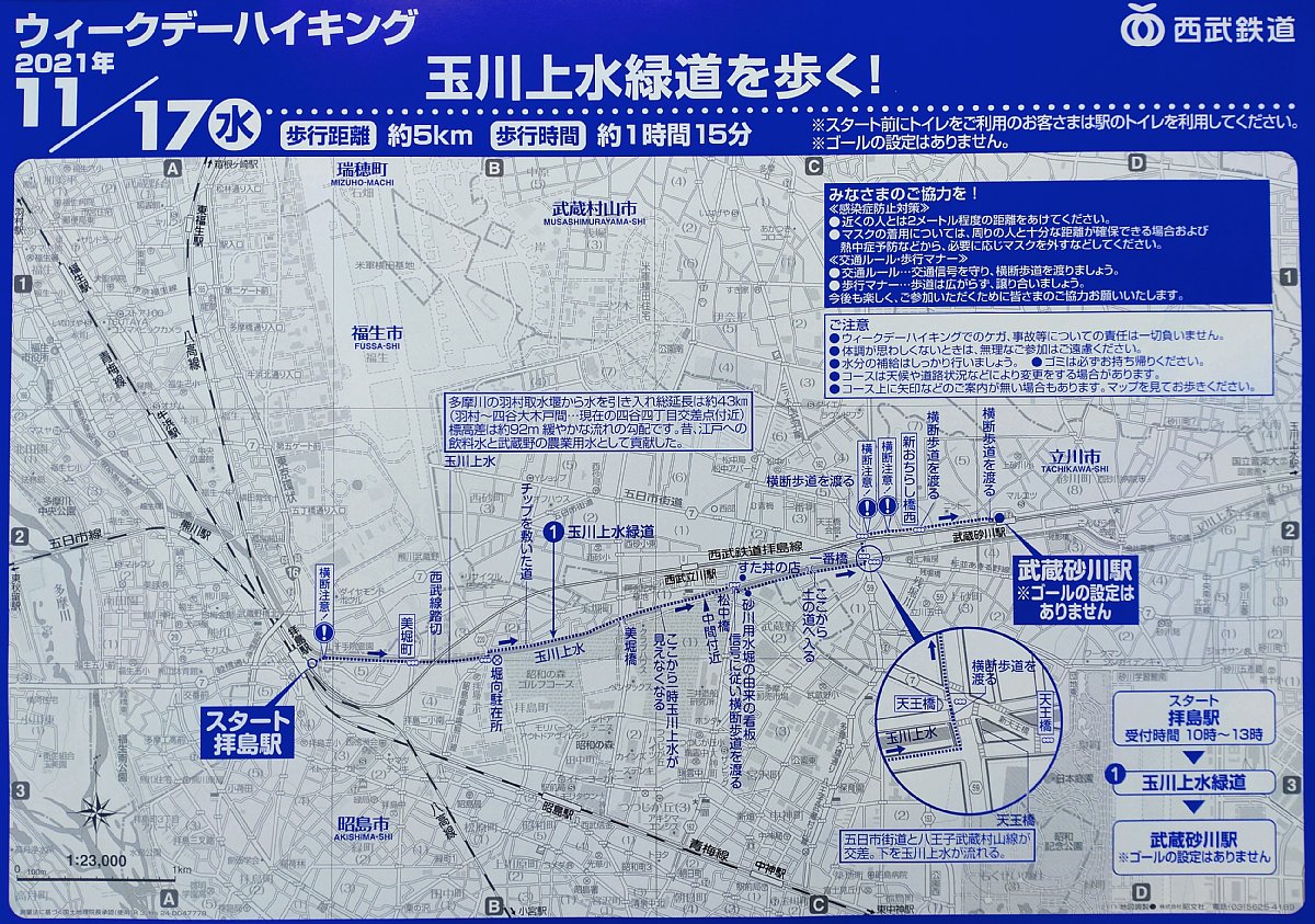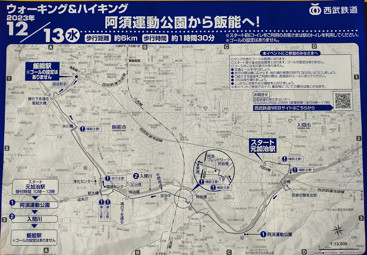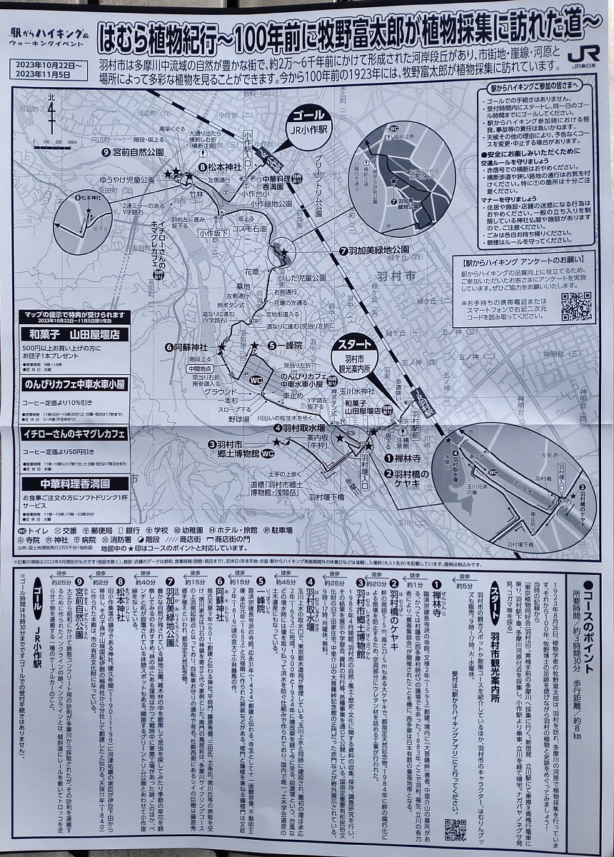 ★2023年12月13日(水) 晴れ、気温(青梅)15.0/3.3℃、西武鉄道、阿須運動公園から飯能へ! 当初の予定コースは元加治駅〜「加治丘陵から桜山展望台へ!」であったが、加治丘陵ハイキングコースに"クマ"が出没したため入間川沿いの「阿須運動公園から飯能へ!」に変更となり、元加治駅→阿須運動公園→入間川遊歩道→飯能駅のコースで、快晴の中をのんびりと歩くことができた。途中JR八高線の開業当時から使用されている「八高線入間川橋梁」が印象的であった。 ★2023年11月29日(水) 晴れ、気温(青梅)16.3/1.6℃、西武鉄道、横瀬木の間コースから琴平丘陵をあるく! 横瀬駅から木の間ハイキングコースを歩くハイキング。紅葉はピークを過ぎていた。 琴平丘陵、羊山公園経由でゴールは西武秩父駅。平年より暖かい陽気でハイキング日和であった。 ★2023年11月15日(水) 曇り、気温(青梅)13.2/6.6℃、西武鉄道、「羽村山口軽便鉄道跡」を歩く! 西武球場前駅からJR箱根ヶ崎駅までを多摩湖辞典や歩行者道、羽村山口軽便鉄道跡のトンネル群・遊歩道を 歩くコースで、約10?と西武のウォーキングにしては長い距離である。 羽村山口軽便鉄道は多摩湖や狭山湖を建設するための資材や砂利を運んだ線路で、敗戦後のトンネルは自転車道や遊歩道として 利用されて、遊歩道は桜並木として楽しまれている。 ★2023年11月10日(金) 曇り/雨、気温(青梅)15.4/10.9℃、JR東日本、都心から約60分の大自然「秋川渓谷で」紅葉狩りと閉校した小学校めぐり 低気圧の通過で途中雨となりコース半ばで歩くのを断念、ショートカットして「瀬音の湯」へゴールした。 今年は猛暑が続いたため紅葉は平年より10日程遅れたいるが秋川渓谷の紅葉を少し堪能できた。 瀬音の湯では冷えて疲れた体をを「足湯」で温め帰路はバスで武蔵五日市駅へ ★2023年10月22日(日) 晴れ、気温(青梅)19.6/6.9℃、JR東日本、はむら植物紀行〜100年前に牧野富太郎が植物採取に訪れた道〜 今年上期の朝の連続ドラマのモデルとなった植物学者の牧野富太郎が羽村市を訪れた道のウォーキング。 秋らしい爽やかな中でのウォーキングで、この時期として咲いている花が少なく歩くのみであった。 ★2023年10月14日(土) 晴れ、気温(青梅)21.8/9.4℃、西武鉄道・JR東日本、潮風を漢字ながら海岸通りの新旧街の移り変わりを楽しむシティーウォーク 品川駅から田町駅経由浜松町駅までを主にクロネコヤマトミュージアム、レインボーブリッジ、浜離宮恩賜庭園訪ねた。 レインボーブリッジ、浜離宮恩賜庭園は5年振り、朝は青梅の気温は10℃を切る寒さであったが昼は汗ばむほどであった。 ★2023年09月09日(土) 雨/曇り、気温(青梅)27.4/21.2℃、JR東日本、稲城の梨園と、秋の三沢川と多摩川の風を楽しむ 台風13号で前日は大雨、本日は小雨後曇り(沿岸沿いは本日も大雨)、蒸し暑い中でのウォーキング。 稲城市は無しで有名だがほぼ終わりに近い状態、三沢川の両岸には約1?の桜並木があり土倉の季節に訪れたい場所である。 ★2023年09月06日(水) 曇り/雨、気温(青梅)31.9/22.5℃、西武鉄道、杉並散歩「科学と自然の散歩みち」を歩く 9月になってもまだまだ暑い真夏日、天候は台風が近づいている影響で不安定。 科学と自然の散歩道みちは小柴昌俊博士のノーベル賞受賞と杉並名誉区民称号を贈呈された記念として整備された散歩道。 ★2023年08月03日(木) 晴れ、気温(青梅)35.8/23.4℃、西武鉄道、夏の寺社巡り 所澤神明社 今日も猛暑日、炎天下を短距離であるがウォーキングに参加。 航空公園駅から所澤神明社を経由して所沢駅がゴールである。 炎天下・猛暑の中を歩くのは辛く熱中症の危険が伴う恐れがあり、次回からは日傘(帰路に購入)を使おう。 ★2023年07月08日(土) 曇り、気温(青梅)26.1/23.2℃、秩父鉄道、武甲山の伏流水をめぐりあめ薬師縁日を訪ねる 影森駅から御花畑駅近くの秩父札所13番慈眼寺のあめ薬師縁日を訪ねるウォーキング。 ゴール後は秩父市内のオムライスが有名な「パリ―食堂」で昼食。 ★パリ―食堂:1927年創業、建物は創業当時の姿で国の重要有形文化財 ★2023年07月05日(水) 曇り、気温(青梅)28.2/21.0℃、西武鉄道、狭山・境緑道から境浄水場専用線跡を歩く! 曇りで蒸し暑いが爽やかな風の中でのウォーキング。 小平から武蔵境まで狭山・境緑道と境浄水場専用線跡をのんびりと。 ★2023年06月21日(水)夏至 曇り、気温(青梅)26.6/16.1℃、西武鉄道、「東久留米駅郊外線跡」を歩く! 本日6月21日は夏至、曇りで蒸し暑い。 戦時中に田無の軍需工場へ物資を運んだ東久留米駅郊外線跡の遊歩道を歩く。 軍需工場跡地は大規模な住宅地になっている。 ★2023年06月09日(金) 雨|曇り、気温(青梅)21.9/16.4℃、JR東日本、ぶらり小岩下町情緒と花菖蒲の名所を訪ねる 前日(6/8)梅雨入り、小雨降る中を小岩菖蒲園の花菖蒲観賞するため小岩駅からラウォーキング。 コース途中で下小岩親水緑道・上小岩親水緑道、江戸川河川敷ロードを歩き、影向の松(樹齢600年、繁茂面積日本一)観賞。 小岩菖蒲園で見頃となっている1
