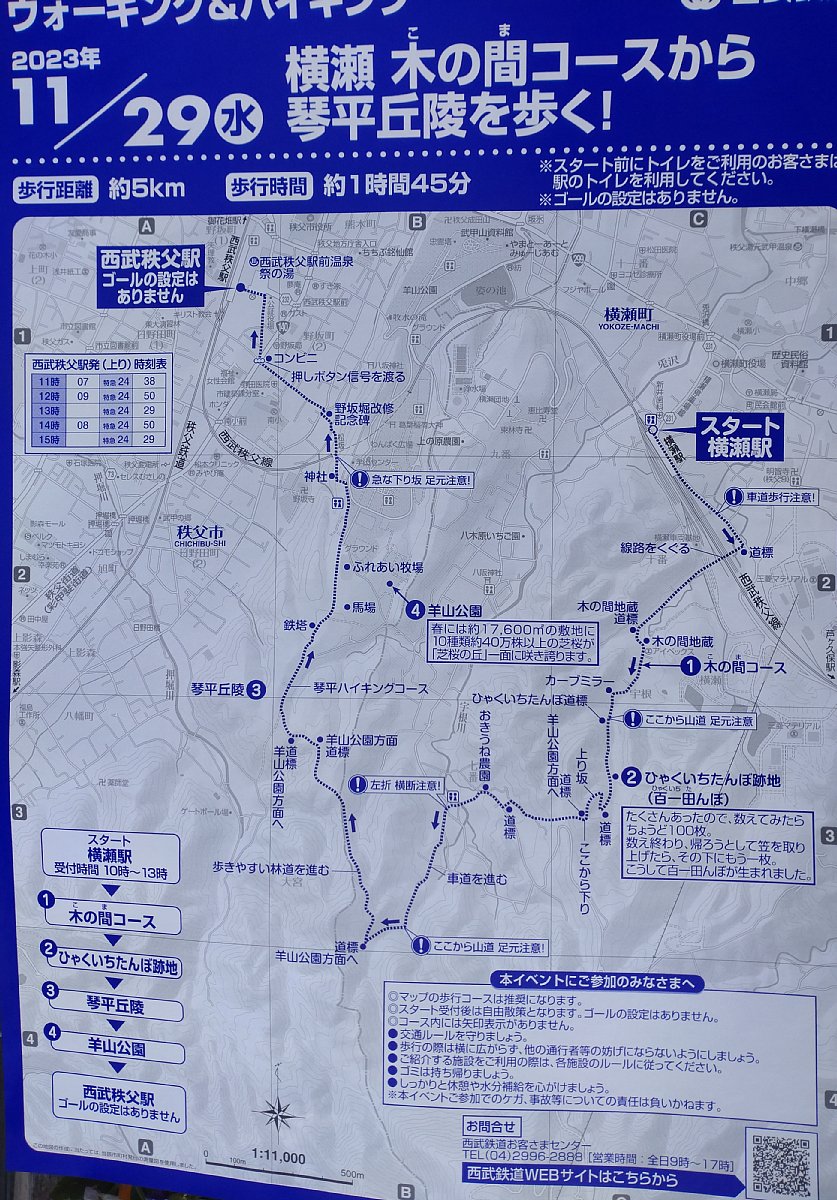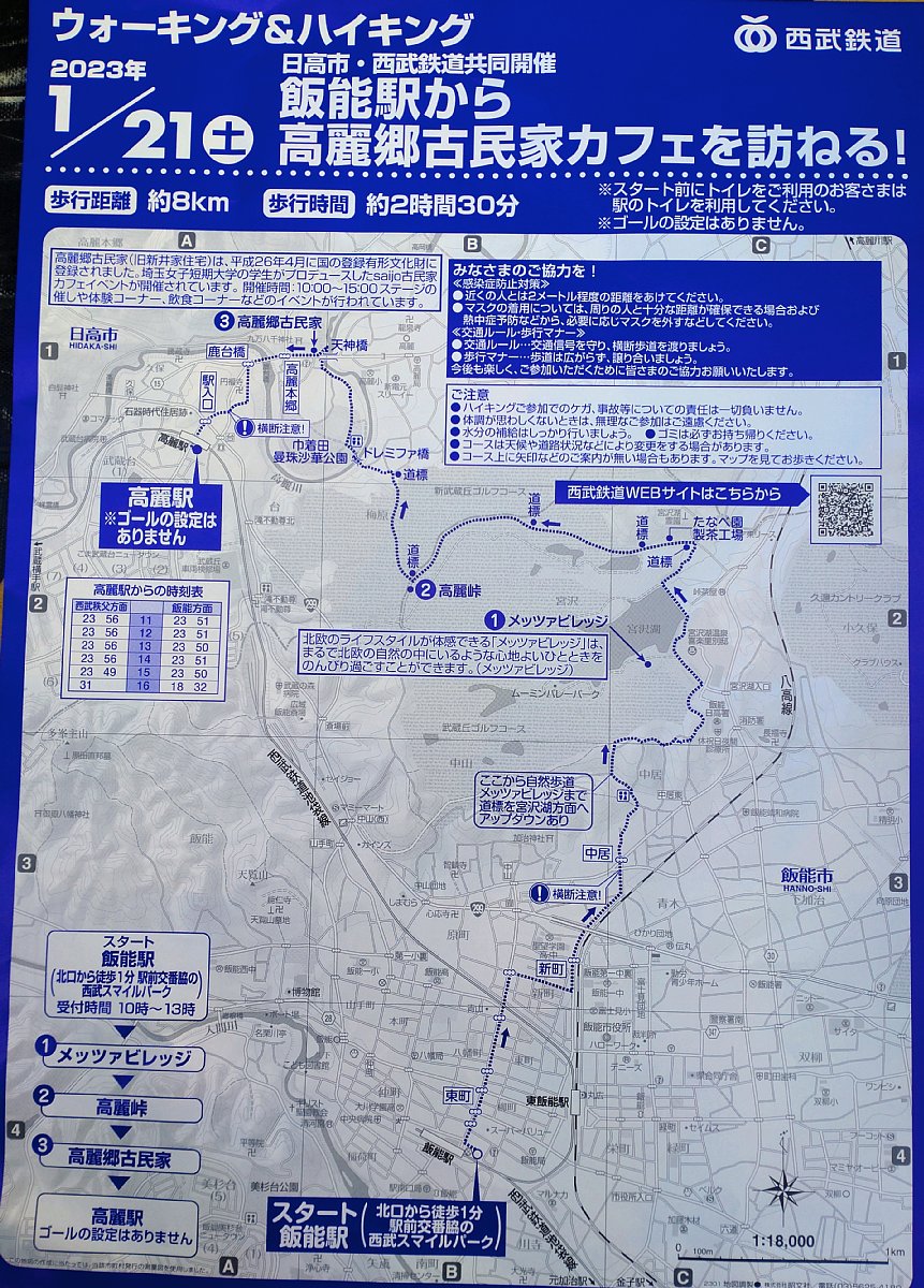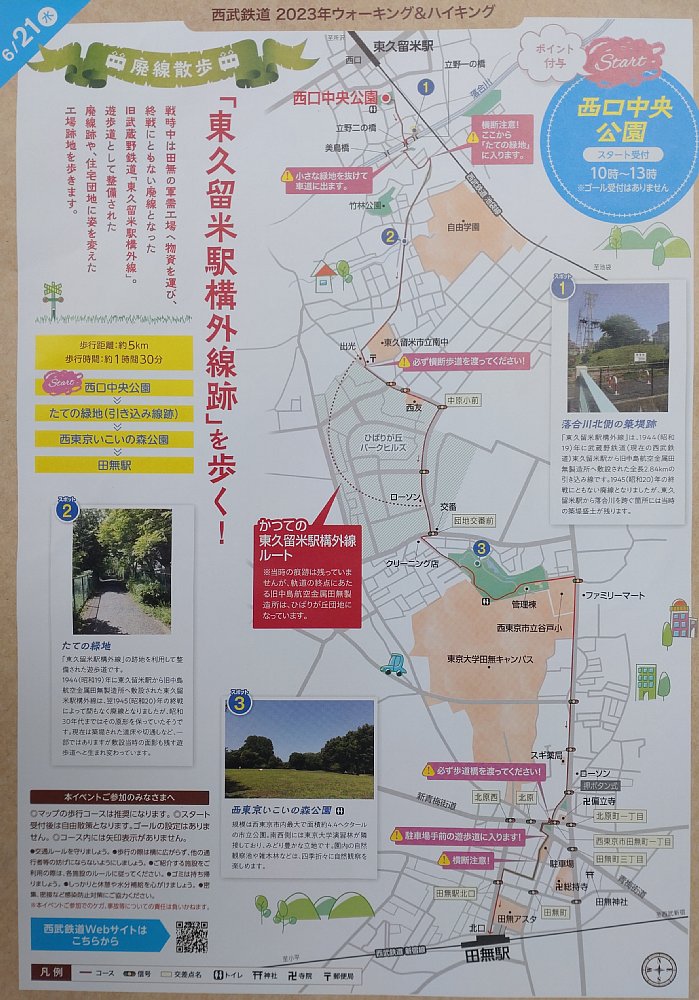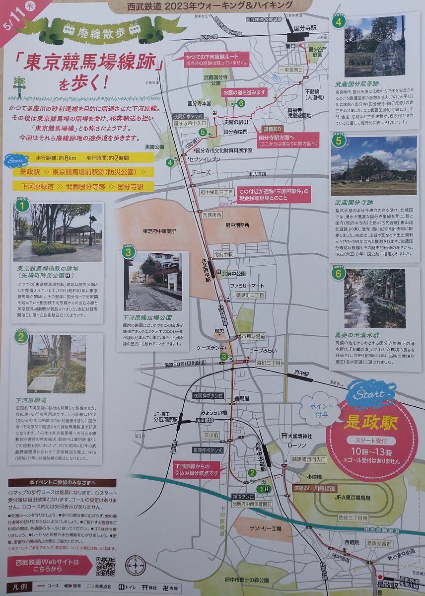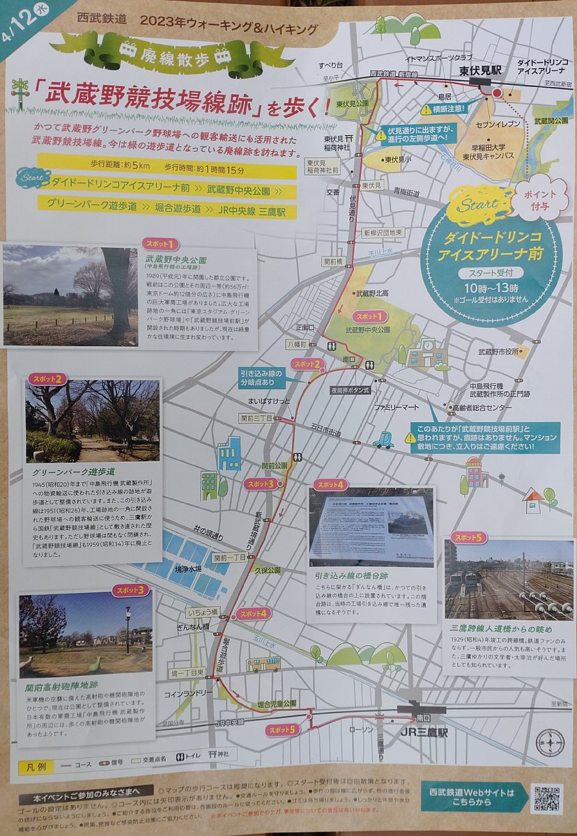 ★2023年12月13日(水) 晴れ、気温(青梅)15.0/3.3℃、西武鉄道、阿須運動公園から飯能へ! 当初の予定コースは元加治駅〜「加治丘陵から桜山展望台へ!」であったが、加治丘陵ハイキングコースに"クマ"が出没したため入間川沿いの「阿須運動公園から飯能へ!」に変更となり、元加治駅→阿須運動公園→入間川遊歩道→飯能駅のコースで、快晴の中をのんびりと歩くことができた。途中JR八高線の開業当時から使用されている「八高線入間川橋梁」が印象的であった。 ★2023年11月29日(水) 晴れ、気温(青梅)16.3/1.6℃、西武鉄道、横瀬木の間コースから琴平丘陵をあるく! 横瀬駅から木の間ハイキングコースを歩くハイキング。紅葉はピークを過ぎていた。 琴平丘陵、羊山公園経由でゴールは西武秩父駅。平年より暖かい陽気でハイキング日和であった。 ★2023年11月15日(水) 曇り、気温(青梅)13.2/6.6℃、西武鉄道、「羽村山口軽便鉄道跡」を歩く! 西武球場前駅からJR箱根ヶ崎駅までを多摩湖辞典や歩行者道、羽村山口軽便鉄道跡のトンネル群・遊歩道を 歩くコースで、約10?と西武のウォーキングにしては長い距離である。 羽村山口軽便鉄道は多摩湖や狭山湖を建設するための資材や砂利を運んだ線路で、敗戦後のトンネルは自転車道や遊歩道として 利用されて、遊歩道は桜並木として楽しまれている。 ★2023年11月10日(金) 曇り/雨、気温(青梅)15.4/10.9℃、JR東日本、都心から約60分の大自然「秋川渓谷で」紅葉狩りと閉校した小学校めぐり 低気圧の通過で途中雨となりコース半ばで歩くのを断念、ショートカットして「瀬音の湯」へゴールした。 今年は猛暑が続いたため紅葉は平年より10日程遅れたいるが秋川渓谷の紅葉を少し堪能できた。 瀬音の湯では冷えて疲れた体をを「足湯」で温め帰路はバスで武蔵五日市駅へ ★2023年10月22日(日) 晴れ、気温(青梅)19.6/6.9℃、JR東日本、はむら植物紀行〜100年前に牧野富太郎が植物採取に訪れた道〜 今年上期の朝の連続ドラマのモデルとなった植物学者の牧野富太郎が羽村市を訪れた道のウォーキング。 秋らしい爽やかな中でのウォーキングで、この時期として咲いている花が少なく歩くのみであった。 ★2023年10月14日(土) 晴れ、気温(青梅)21.8/9.4℃、西武鉄道・JR東日本、潮風を漢字ながら海岸通りの新旧街の移り変わりを楽しむシティーウォーク 品川駅から田町駅経由浜松町駅までを主にクロネコヤマトミュージアム、レインボーブリッジ、浜離宮恩賜庭園訪ねた。 レインボーブリッジ、浜離宮恩賜庭園は5年振り、朝は青梅の気温は10℃を切る寒さであったが昼は汗ばむほどであった。 ★2023年09月09日(土) 雨/曇り、気温(青梅)27.4/21.2℃、JR東日本、稲城の梨園と、秋の三沢川と多摩川の風を楽しむ 台風13号で前日は大雨、本日は小雨後曇り(沿岸沿いは本日も大雨)、蒸し暑い中でのウォーキング。 稲城市は無しで有名だがほぼ終わりに近い状態、三沢川の両岸には約1?の桜並木があり土倉の季節に訪れたい場所である。 ★2023年09月06日(水) 曇り/雨、気温(青梅)31.9/22.5℃、西武鉄道、杉並散歩「科学と自然の散歩みち」を歩く 9月になってもまだまだ暑い真夏日、天候は台風が近づいている影響で不安定。 科学と自然の散歩道みちは小柴昌俊博士のノーベル賞受賞と杉並名誉区民称号を贈呈された記念として整備された散歩道。 ★2023年08月03日(木) 晴れ、気温(青梅)35.8/23.4℃、西武鉄道、夏の寺社巡り 所澤神明社 今日も猛暑日、炎天下を短距離であるがウォーキングに参加。 航空公園駅から所澤神明社を経由して所沢駅がゴールである。 炎天下・猛暑の中を歩くのは辛く熱中症の危険が伴う恐れがあり、次回からは日傘(帰路に購入)を使おう。 ★2023年07月08日(土) 曇り、気温(青梅)26.1/23.2℃、秩父鉄道、武甲山の伏流水をめぐりあめ薬師縁日を訪ねる 影森駅から御花畑駅近くの秩父札所13番慈眼寺のあめ薬師縁日を訪ねるウォーキング。 ゴール後は秩父市内のオムライスが有名な「パリ―食堂」で昼食。 ★パリ―食堂:1927年創業、建物は創業当時の姿で国の重要有形文化財 ★2023年07月05日(水) 曇り、気温(青梅)28.2/21.0℃、西武鉄道、狭山・境緑道から境浄水場専用線跡を歩く! 曇りで蒸し暑いが爽やかな風の中でのウォーキング。 小平から武蔵境まで狭山・境緑道と境浄水場専用線跡をのんびりと。 ★2023年06月21日(水)夏至 曇り、気温(青梅)26.6/16.1℃、西武鉄道、「東久留米駅郊外線跡」を歩く! 本日6月21日は夏至、曇りで蒸し暑い。 戦時中に田無の軍需工場へ物資を運んだ東久留米駅郊外線跡の遊歩道を歩く。 軍需工場跡地は大規模な住宅地になっている。 ★2023年06月09日(金) 雨|曇り、気温(青梅)21.9/16.4℃、JR東日本、ぶらり小岩下町情緒と花菖蒲の名所を訪ねる 前日(6/8)梅雨入り、小雨降る中を小岩菖蒲園の花菖蒲観賞するため小岩駅からラウォーキング。 コース途中で下小岩親水緑道・上小岩親水緑道、江戸川河川敷ロードを歩き、影向の松(樹齢600年、繁茂面積日本一)観賞。 小岩菖蒲園で見頃となっている1