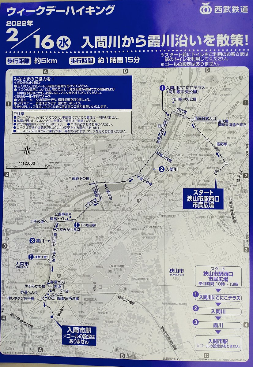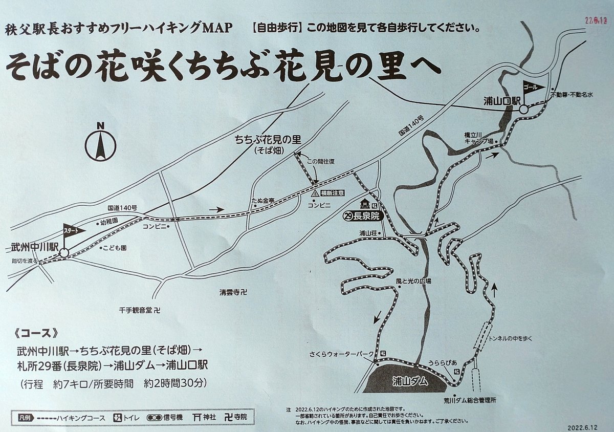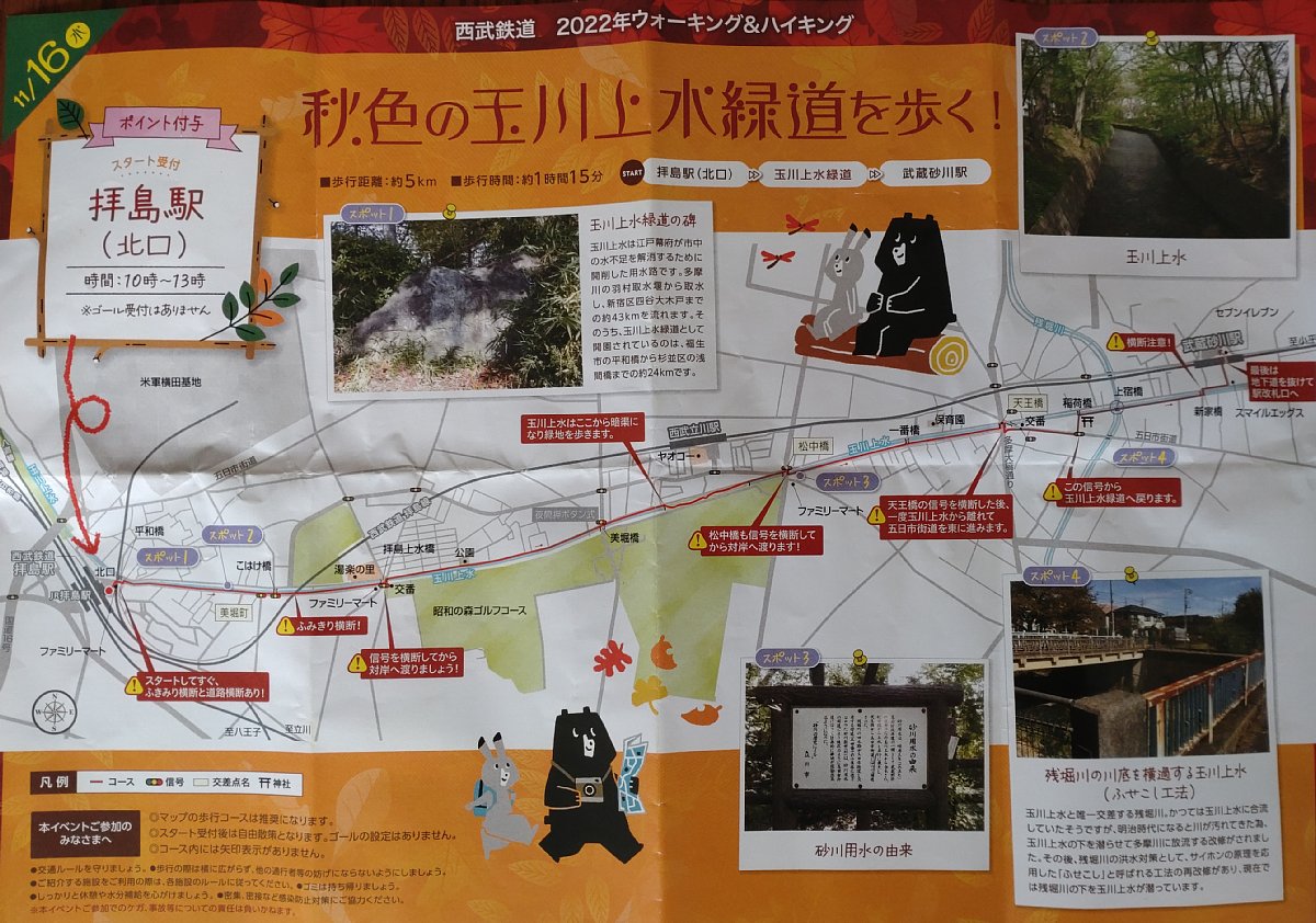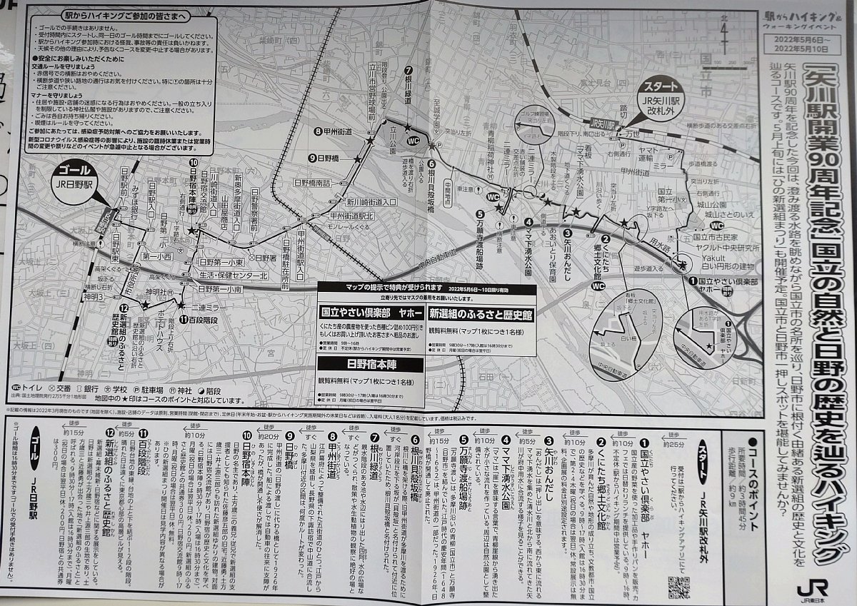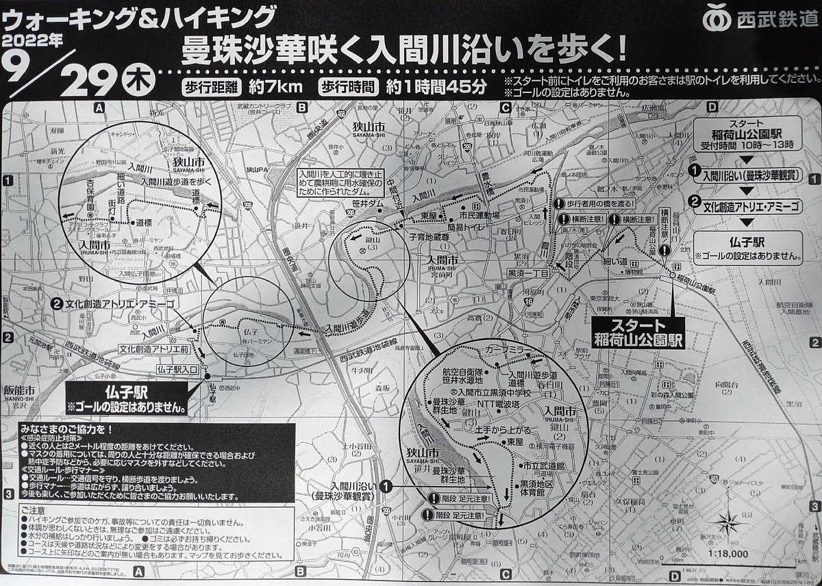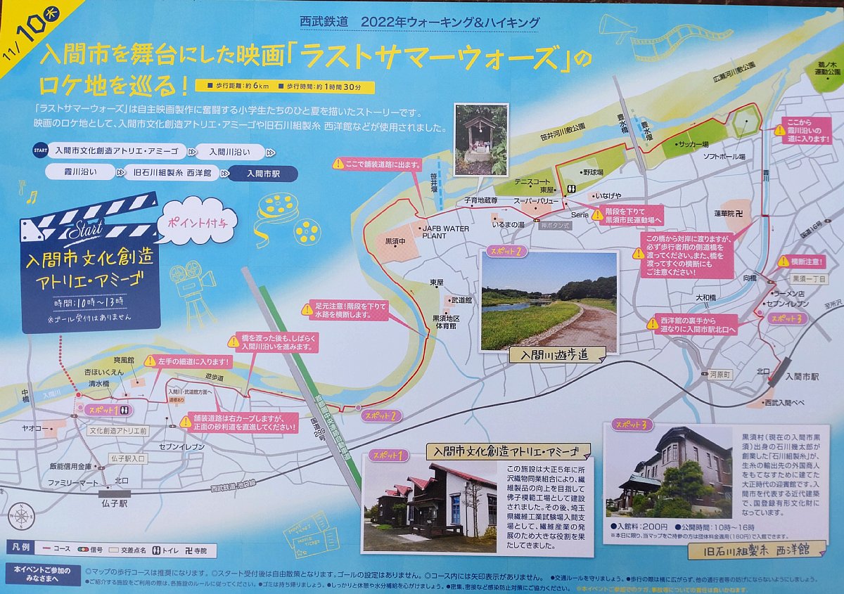 ★2022年11月10日(木) 、気温(青梅)19.2/8.1℃、西武鉄道、入間市を舞台にした映画「ラストサマーウォーズ」のロケ地を巡る! 9月に入間川沿いの曼殊沙華鑑賞ウォークとほぼ逆のコースであった。 小春日和で汗ばむ中を気持ちよく歩くことができた。 ★2022年10月08日(土)寒露 晴れ/曇り、気温(青梅)21.3/11.4℃、西武鉄道、入間川沿い安比奈親水公園を歩く! 昨日・一昨日は雨で12月の気温で寒かったが今日は平年並みに戻りウォーキング日和である。 安比奈親水降雨園は入間川沿いに長く広がった公園で、子供連れの家族が楽しめるところである。 ★2022年10月01日(土) 晴れ、気温(青梅)28.5/0.0℃、西武鉄道、上石神井駅から石神井公園へ! 快晴で汗ばむ中を石神井公園へのウォーキング。 コースは上石神井駅から石神井公園、ゴールが石神井公園駅だが、歩行距離が約4?と短かったので石神井公園からは 石神井川沿いを歩いて上石神井駅に戻ることにした。石神井川ではカワセミに遭遇、撮影することができた。 ★2022年09月29日(木) 晴れ、気温(青梅)26.3/18.4℃、西武鉄道、曼殊沙華咲く入間川沿いを歩く! 入間川沿いに群生しているヒガンバナ(曼殊沙華)を観賞するウォーキング。 時期的にもう遅いかと思ったがどっこいまだまだ観賞できる状態であった。 ★2022年09月23日(金)秋分 曇り/雨、気温(青梅)24.0/17.9℃、西武鉄道、寺坂棚田の彼岸花観賞から秩父市内へ! 西武鉄道のウォーキング参加は約2ヶ月半ぶり、 台風15号の影響による雨の降り止む時間帯での寺坂棚田の彼岸花観賞ウォーキング。 前週の台風14号の風による稲が倒れているのが目立ったがヒガンバナはピークを過ぎた感じでも十分充分観賞できた。 ★2022年09月17日(土) 晴れ/曇り、気温(青梅)30.2/19.6℃、秩父鉄道、長瀞の曼殊沙華自生地を巡る 長瀞に自生するヒガンバナ(曼殊沙華)を巡るコース。 長瀞哲学の道で赤のヒガンバナ、不動寺で白のヒガンバナを観賞。不動寺はナデシコ寺としても有名。 コース途中では秩父鉄道電車・機関車を撮り鉄。荒川河川敷から興梠を通過するパレオエクスプレスをパシャリ。 ★2022年08月26日(金) 晴れ|曇り、気温(青梅)29.5/22.8℃、秩父鉄道、長瀞七草寺めぐりハイキング 時間の都合上、2寺を訪れることができなかった。 七草が見頃の時期はズレているのでなんとか咲いているのを観賞できることができた。 ★2022年08月19日(金) 晴れ、気温(青梅)31.9/20.4℃、JR東日本、日本有数のレンゲショウマ群生地と霊峰御岳山の神秘が宿るパワースポット巡り 御岳山のレンゲショウマ鑑賞とロックガーデンを散策する。ケーブルカーを往復利用で参加。 毎年のように御岳山のレンゲショウマを観賞に行くが、今回は見頃の時期で可憐なh名を堪能できた。 そして御岳山の武蔵御嶽神社に参拝とロックガーデン散策、綾広の滝を観瀑。 ★2022年07月02日(土) 晴れ、西武鉄道、高麗川沿いから山道を歩き吾野へ! 今日も猛暑日、8日連続である。 約5km程度の歩行距離であるが猛暑の中ではハードでタフなウォーキングであった。 ★2022年06月23日(木) 曇り、気温(青梅)24.6/20.5℃、西武鉄道・JR東日本、湖畔で感じる北欧時間と地産地消を楽しむ! 前夜の雨でアップダウンと泥濘で歩きぬく中の長キャリのウォーキング。 藩の駅から武蔵丘陵のゴルフ場脇を通りムーミンバレーパーク、宮沢湖を経由し高麗川駅がゴール。 ★2022年06月19日(日) 晴れ、気温(青梅)30.9/17.8℃、JR東日本、秋川渓谷〜花咲き爺さんのあじさい山と五日市の待ちをめぐる 梅雨晴れ(五月晴れ−さつきばれ)で蒸し暑く真夏日となり、汗だくでの長距離ウォーキング。 南沢あじさい山のアジサイは見頃前で期待外れに感があった。一万株もあるといわれているので満開時は見事と思う。 ★2022年06月12日(日) 晴れ、気温(青梅)25.9/15.6℃、秩父鉄道、そばの花咲くちちぶ花見の里へ、浦山ダム 武州中川駅から「ちちぶ花見の里」のそばの花観賞と浦山ダム見学するコース。ゴールは浦山口駅。 ゴール間近でゲリラ豪雨に見舞われたがそばの花と浦山ダム見学を堪能できたウォーキングであった。 ★2022年05月31日(火) 雨|曇り、気温(青梅)21.7/14.9℃、西武鉄道、阿須運動公園散策!(入間川沿いを歩く) 雨上がりの蒸し暑い中でのウォーキングであった。 元加治駅をスタートに阿須運動公園から入間川沿いを上流に向かって歩き飯能駅がゴール。 途中JR八高線を過ぎてから2か所ほど長い桜並木があり桜の季節に歩きたいところである。 ★2022年05月10日(火) 晴れ、気温(青梅)21.9/9.1℃、西武鉄道、新緑の小平グリーンロード散策! 「美しい日本の歩きたくなるみち500選」認証コースで小平グリーロードの玉川上水沿い部分をウォーキング。 新緑で木漏れ日が漏れ爽やかな風の中、短距離ながら気持ちの良い玉川上水沿いのウォーキングであった。 途中西武鉄道の玉川上水車両基地の電車も楽しむこともできた。 ★2022年05月08日(日) 曇り、気温(青梅)19.5/0.0℃、JR東日本、国立の自然と日野の歴史を辿るハイキング 久々のJR東日本