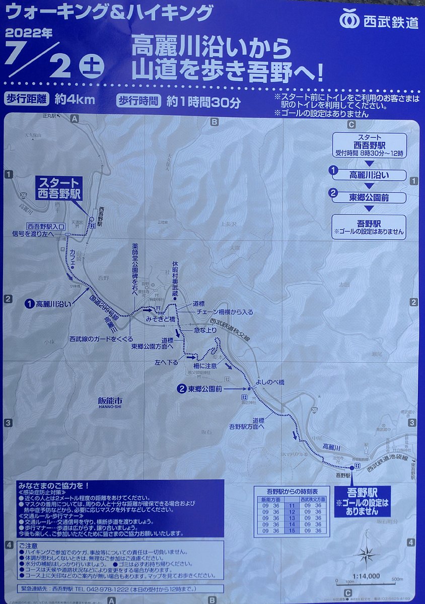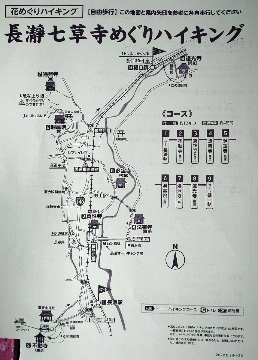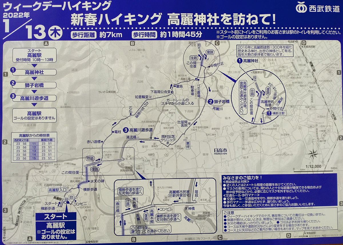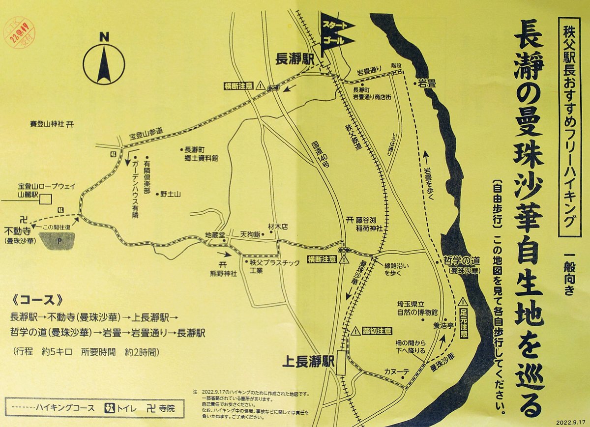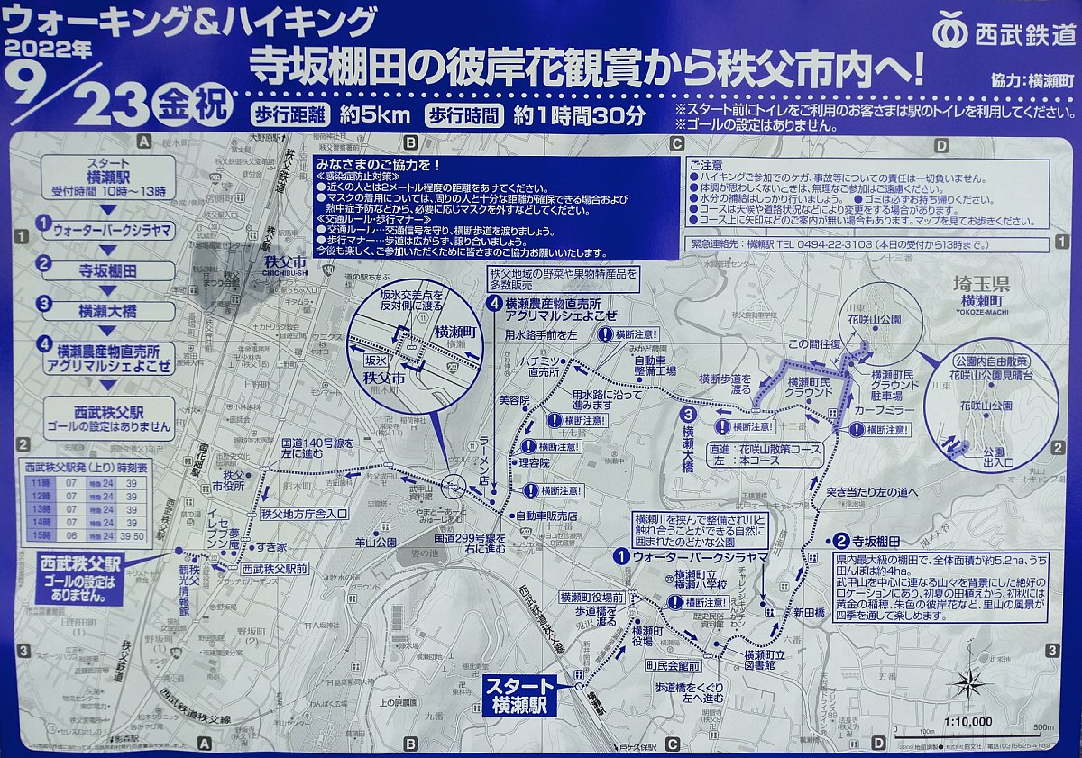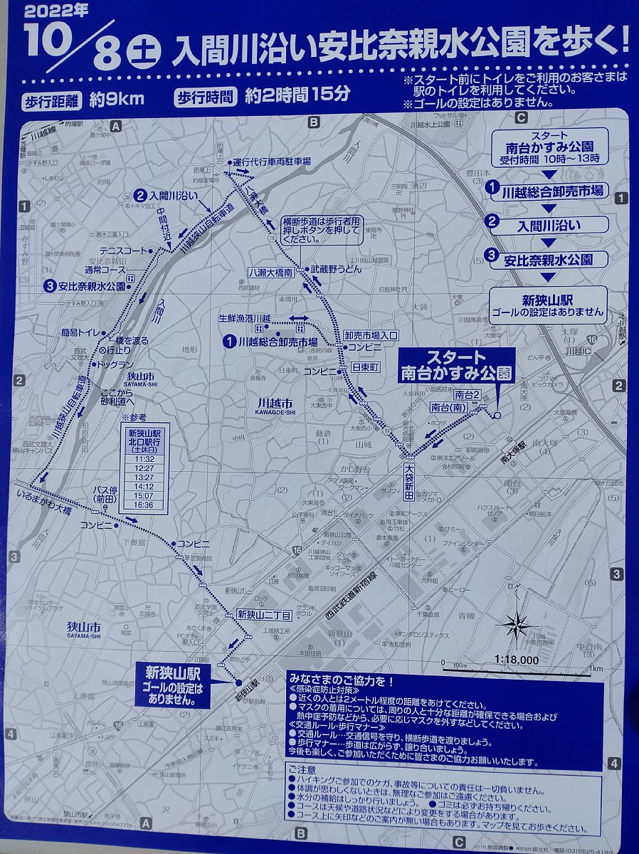 ★2022年11月10日(木) 、気温(青梅)19.2/8.1℃、西武鉄道、入間市を舞台にした映画「ラストサマーウォーズ」のロケ地を巡る! 9月に入間川沿いの曼殊沙華鑑賞ウォークとほぼ逆のコースであった。 小春日和で汗ばむ中を気持ちよく歩くことができた。 ★2022年10月08日(土)寒露 晴れ/曇り、気温(青梅)21.3/11.4℃、西武鉄道、入間川沿い安比奈親水公園を歩く! 昨日・一昨日は雨で12月の気温で寒かったが今日は平年並みに戻りウォーキング日和である。 安比奈親水降雨園は入間川沿いに長く広がった公園で、子供連れの家族が楽しめるところである。 ★2022年10月01日(土) 晴れ、気温(青梅)28.5/0.0℃、西武鉄道、上石神井駅から石神井公園へ! 快晴で汗ばむ中を石神井公園へのウォーキング。 コースは上石神井駅から石神井公園、ゴールが石神井公園駅だが、歩行距離が約4?と短かったので石神井公園からは 石神井川沿いを歩いて上石神井駅に戻ることにした。石神井川ではカワセミに遭遇、撮影することができた。 ★2022年09月29日(木) 晴れ、気温(青梅)26.3/18.4℃、西武鉄道、曼殊沙華咲く入間川沿いを歩く! 入間川沿いに群生しているヒガンバナ(曼殊沙華)を観賞するウォーキング。 時期的にもう遅いかと思ったがどっこいまだまだ観賞できる状態であった。 ★2022年09月23日(金)秋分 曇り/雨、気温(青梅)24.0/17.9℃、西武鉄道、寺坂棚田の彼岸花観賞から秩父市内へ! 西武鉄道のウォーキング参加は約2ヶ月半ぶり、 台風15号の影響による雨の降り止む時間帯での寺坂棚田の彼岸花観賞ウォーキング。 前週の台風14号の風による稲が倒れているのが目立ったがヒガンバナはピークを過ぎた感じでも十分充分観賞できた。 ★2022年09月17日(土) 晴れ/曇り、気温(青梅)30.2/19.6℃、秩父鉄道、長瀞の曼殊沙華自生地を巡る 長瀞に自生するヒガンバナ(曼殊沙華)を巡るコース。 長瀞哲学の道で赤のヒガンバナ、不動寺で白のヒガンバナを観賞。不動寺はナデシコ寺としても有名。 コース途中では秩父鉄道電車・機関車を撮り鉄。荒川河川敷から興梠を通過するパレオエクスプレスをパシャリ。 ★2022年08月26日(金) 晴れ|曇り、気温(青梅)29.5/22.8℃、秩父鉄道、長瀞七草寺めぐりハイキング 時間の都合上、2寺を訪れることができなかった。 七草が見頃の時期はズレているのでなんとか咲いているのを観賞できることができた。 ★2022年08月19日(金) 晴れ、気温(青梅)31.9/20.4℃、JR東日本、日本有数のレンゲショウマ群生地と霊峰御岳山の神秘が宿るパワースポット巡り 御岳山のレンゲショウマ鑑賞とロックガーデンを散策する。ケーブルカーを往復利用で参加。 毎年のように御岳山のレンゲショウマを観賞に行くが、今回は見頃の時期で可憐なh名を堪能できた。 そして御岳山の武蔵御嶽神社に参拝とロックガーデン散策、綾広の滝を観瀑。 ★2022年07月02日(土) 晴れ、西武鉄道、高麗川沿いから山道を歩き吾野へ! 今日も猛暑日、8日連続である。 約5km程度の歩行距離であるが猛暑の中ではハードでタフなウォーキングであった。 ★2022年06月23日(木) 曇り、気温(青梅)24.6/20.5℃、西武鉄道・JR東日本、湖畔で感じる北欧時間と地産地消を楽しむ! 前夜の雨でアップダウンと泥濘で歩きぬく中の長キャリのウォーキング。 藩の駅から武蔵丘陵のゴルフ場脇を通りムーミンバレーパーク、宮沢湖を経由し高麗川駅がゴール。 ★2022年06月19日(日) 晴れ、気温(青梅)30.9/17.8℃、JR東日本、秋川渓谷〜花咲き爺さんのあじさい山と五日市の待ちをめぐる 梅雨晴れ(五月晴れ−さつきばれ)で蒸し暑く真夏日となり、汗だくでの長距離ウォーキング。 南沢あじさい山のアジサイは見頃前で期待外れに感があった。一万株もあるといわれているので満開時は見事と思う。 ★2022年06月12日(日) 晴れ、気温(青梅)25.9/15.6℃、秩父鉄道、そばの花咲くちちぶ花見の里へ、浦山ダム 武州中川駅から「ちちぶ花見の里」のそばの花観賞と浦山ダム見学するコース。ゴールは浦山口駅。 ゴール間近でゲリラ豪雨に見舞われたがそばの花と浦山ダム見学を堪能できたウォーキングであった。 ★2022年05月31日(火) 雨|曇り、気温(青梅)21.7/14.9℃、西武鉄道、阿須運動公園散策!(入間川沿いを歩く) 雨上がりの蒸し暑い中でのウォーキングであった。 元加治駅をスタートに阿須運動公園から入間川沿いを上流に向かって歩き飯能駅がゴール。 途中JR八高線を過ぎてから2か所ほど長い桜並木があり桜の季節に歩きたいところである。 ★2022年05月10日(火) 晴れ、気温(青梅)21.9/9.1℃、西武鉄道、新緑の小平グリーンロード散策! 「美しい日本の歩きたくなるみち500選」認証コースで小平グリーロードの玉川上水沿い部分をウォーキング。 新緑で木漏れ日が漏れ爽やかな風の中、短距離ながら気持ちの良い玉川上水沿いのウォーキングであった。 途中西武鉄道の玉川上水車両基地の電車も楽しむこともできた。 ★2022年05月08日(日) 曇り、気温(青梅)19.5/0.0℃、JR東日本、国立の自然と日野の歴史を辿るハイキング 久々のJR東日本
