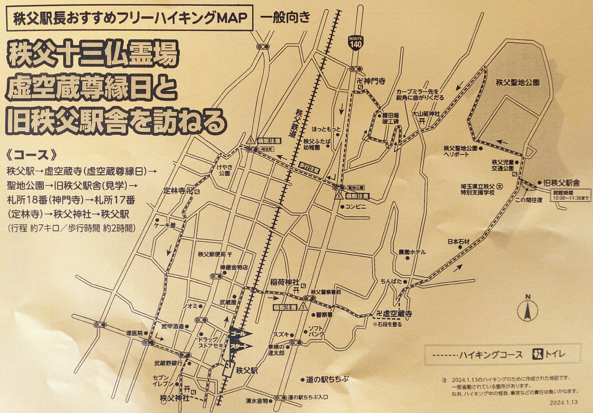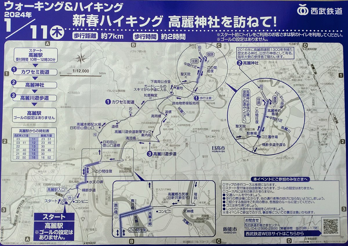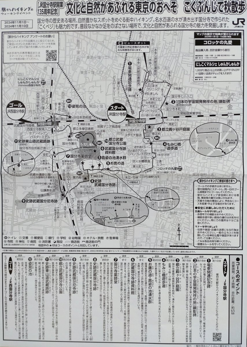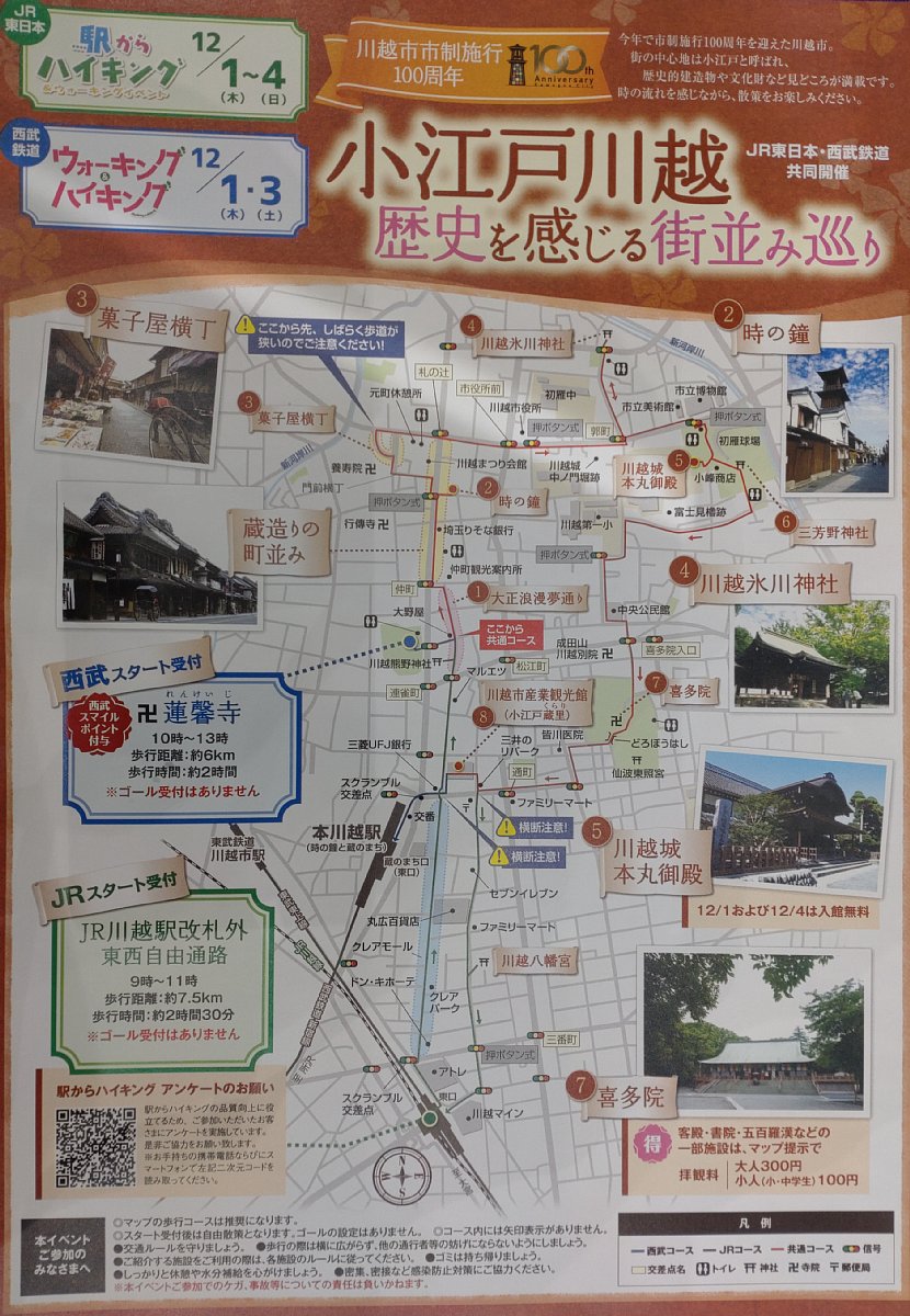 ★2024年12月13日(金) 曇り、気温(青梅)7.7/-2.8℃、JR東日本、浮世絵に描かれた江戸を感じる奥浅草散策 今冬一番の寒さの中でのウォーキング、上野駅からかっぱ橋道具街、隅田川テラスを経て南千住駅ゴール コース途中では7つの神社の参拝、隅田川テラスからはスカイツリーを眺めながらのウォーキング。 ★2024年12月08日(日) 、気温(青梅)12.5/0.7℃、西武鉄道、イベントを楽しむ!狭山茶の里ウォーキング ようやく平年並みの陽気になり、朝晩の寒さは答える。 北風が強い中を入間川沿いのウォーキング、コース途中に模擬店などの職やイベントが設けられた 西武鉄道と狭山市などが合同したウォーキングで参加者がとても多く賑やかな出会った。 ★2024年11月28日(木) 晴れ、気温(青梅)17.4/5.3℃、西武鉄道、東久留米から野火止用水満喫ウォーク! コース途中の平林寺、紅葉で知られく古刹である。 広いヘリ虹の山林の中にある境内にはたくさんのもみじが見ごろの紅葉であった。 ★2024年11月17日(日) 晴れ、気温(青梅)24.1/13.7℃、JR東日本、青梅の歴史と自然とアートに触れられるコース 今日は暑い、夏日手前でこの時期としては異常。 青梅駅から青梅丘陵ハイキングコースから釜の渕公園、郷土博物館をめぐる。 ★2024年11月03日(日) 、気温(青梅)22.7/10.2℃、秩父鉄道、寄居・風布みかんの里へ 紅葉にはまだまだ、今月末ころだろう。 以前11月末に訪れた時、日本(やまと)の里のもみじの紅葉はとてもきれいであったが、今回は深緑であった。 風布へは釜伏川沿いに「風の道」というコースがあり夏は川風があり気持ちいい散策路だと思う。 ★2024年11月01日(金) 晴れ/曇り、気温(青梅)20.4/9.3℃、JR東日本、文化と自然があふれる東京のおへそ こくぶんじで秋散歩 何回か訪れたことがあるお鷹の道、真姿の池湧水群、武蔵国分寺などを歩くコース。 ★2024年10月11日(金) 晴れ、気温(青梅)24.4/12.1℃、秩父鉄道、秩父札所と武甲山の伏流水をめぐる 絶好のウォーキング日和、少し汗ばむほどの陽気だが、久しぶりの秩父である。 平日のためか秩父市内は閑散としていたが、12月2・3日には日本3大曳山祭りの一つである「秩父夜祭」が行われ 多くの観光客で賑わう。一度は見てみたいものだ。 ★2024年09月28日(土) 曇り、気温(青梅)27.1/20.1℃、西武鉄道・JR東日本、絶景の曼殊沙華 〜日高市の自然と歴史を満喫〜 曇りで蒸し暑い中を高麗川駅から高麗神社を経て巾着田の曼殊沙華を鑑賞するウォーキング。 今年は猛暑が続いたため例年より開花が遅れており、ちょうど見ごろであった。いつもは彼岸の頃である。 ★2024年08月28日(水) 晴れ、気温(青梅)31.3/23.1℃、西武鉄道、東久留米の清流 遊歩道を散策! 台風10号の影響で不安定な天気で心配したが、一日降らずに持ちこたえた中でのウォーキング。 落合川、くろめがわの遊歩道は何回か歩いたことがあるが、炎天下でのウォーキングは今回が初めて。 やはり炎天下でのウォーキング辛い、特に今年は猛暑が連続しており夏バテ気味で体力の消耗が激しかった。 ★2024年07月03日(水) 曇り/晴れ、気温(青梅)33.0/22.9℃、西武鉄道、立川飛行場「中神引込線」廃線跡を歩く! 蒸し暑く真夏日となった、武蔵砂川駅から五日市街道、残堀川沿いを経て旧日本軍の立川飛行場「中神引込線」廃線跡をたどり、 ゴールが青梅線中神駅のウォーキング。残堀川の両岸は桜並木が続いておりサクラが咲くころにお花見で歩いてみたいところである。 ★2024年06月26日(水) 晴れ、気温(青梅)31.6/23.8℃、西武鉄道、吾野の清流 高麗川沿いの山道をあるく! 吾野駅から高麗川沿いの東郷公園前を経てアップダウンがある山道をひたすら歩き「休暇村奥武蔵」に出て、 最後は299号を歩きゴールの西吾野駅。コース途中で特にこれはという見るべきものはなかった。 ★2024年06月19日(水) 晴れ、気温(青梅)30.2/15.0℃、西武鉄道、落合川沿いから六仙公園を散策! 快晴で真夏日の中を東久留米駅から清流の落合川沿い、六仙公園、スカイタワー西東京を経てゴールが花小金井駅。 前半は木陰もありよかったが後半は大通りを歩くため木陰が少なく汗だくのウォーキングであった。 ★2024年06月15日(土) 晴れ、気温(青梅)30.7/18.7℃、秩父鉄道・JR東日本、くまがや別府沼公園の花菖蒲鑑賞ハイキング 日本一暑い場所で有名な熊谷市での駅からハイキング、 真夏日で街路樹がなく日影の少ない炎天下のコースで、途中立ち寄って休憩するような場所もなかった。 別府沼公園の花菖蒲園は期待外れのハナショウブの少なさであった。 ★2024年06月04日(火) 晴れ/曇り、気温(青梅)23.3/13.4℃、JR東日本、東京で自然・歴史を感じるハイキング 恵比寿駅から有栖川宮記念公園、気象科学館、NHK放送博物館、東京タワー、増上寺、芝大神宮などを辿りゴールが浜松町駅。 途中、気象科学とNHK放送博物館の見学と東京タワーのメインデッキ(高さ150m)から都内を一望、富士山は雲で眺望できず。 ★2024年05月09日(木) 晴れ、気温(青梅)19.4/8.2℃、西武鉄道、野火止用水沿い