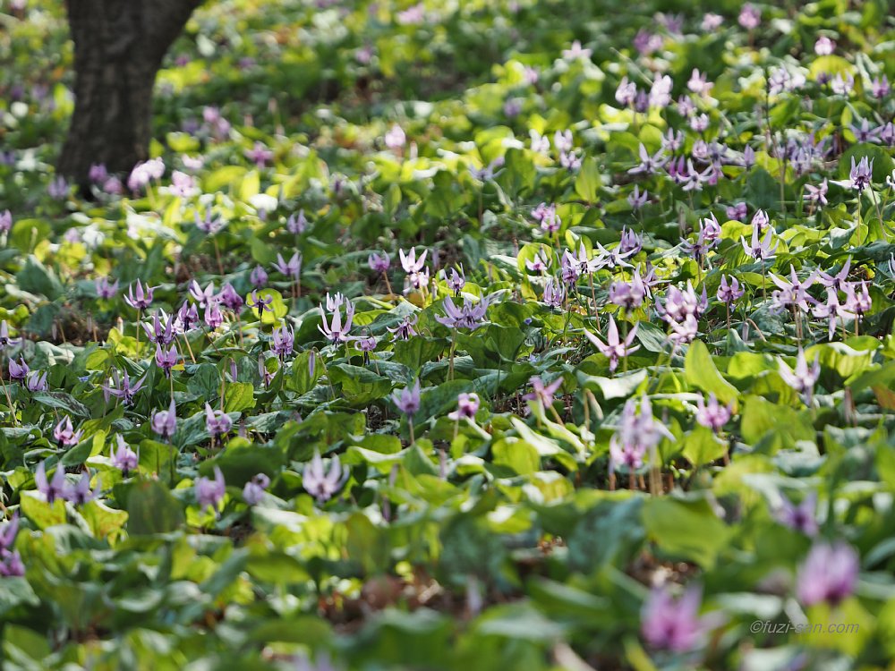 初夏の陽気、瑞穂町のさやま加多来里の郷のカタクリ群生を観賞、開花度50%程とのこと。 幻の白色のカタクリはまだ蕾であった。 ■さやま加多来里の郷 瑞穂町の約3000㎡の北斜面に20万株以上のカタクリが群生している。 数万株に1株と言われる珍しい「幻の白い「カタクリ」が咲いていることもある。