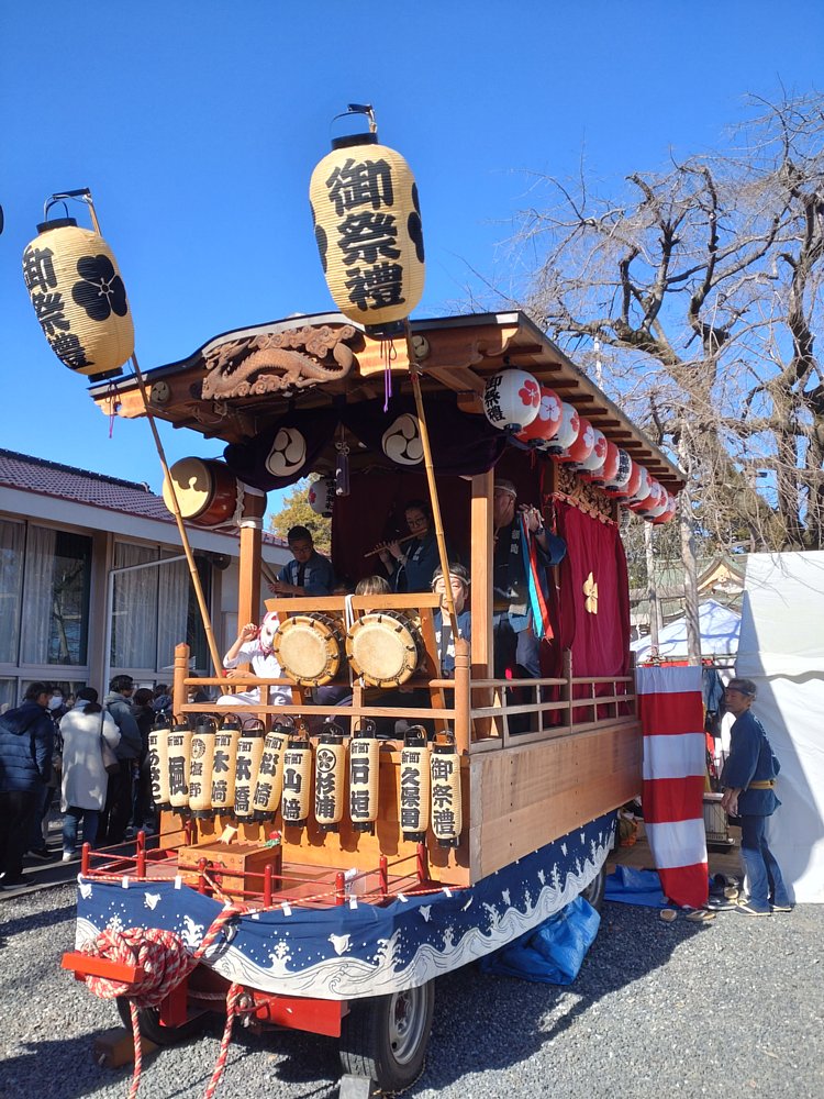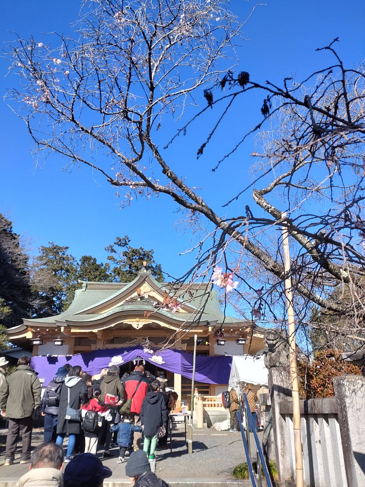 今年も初詣はいつもの新町御嶽神社、風がやや強いが穏やかな元旦で初詣の人出も多く、 境内では山車でお囃子、ジュウガツサクラが咲いていた。