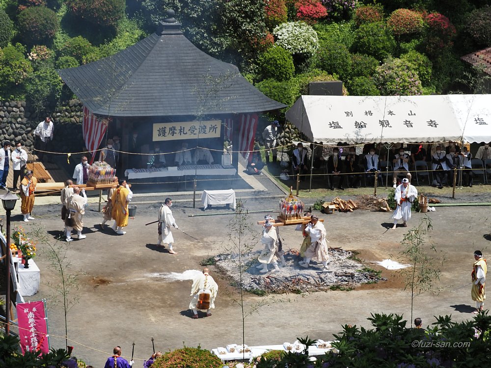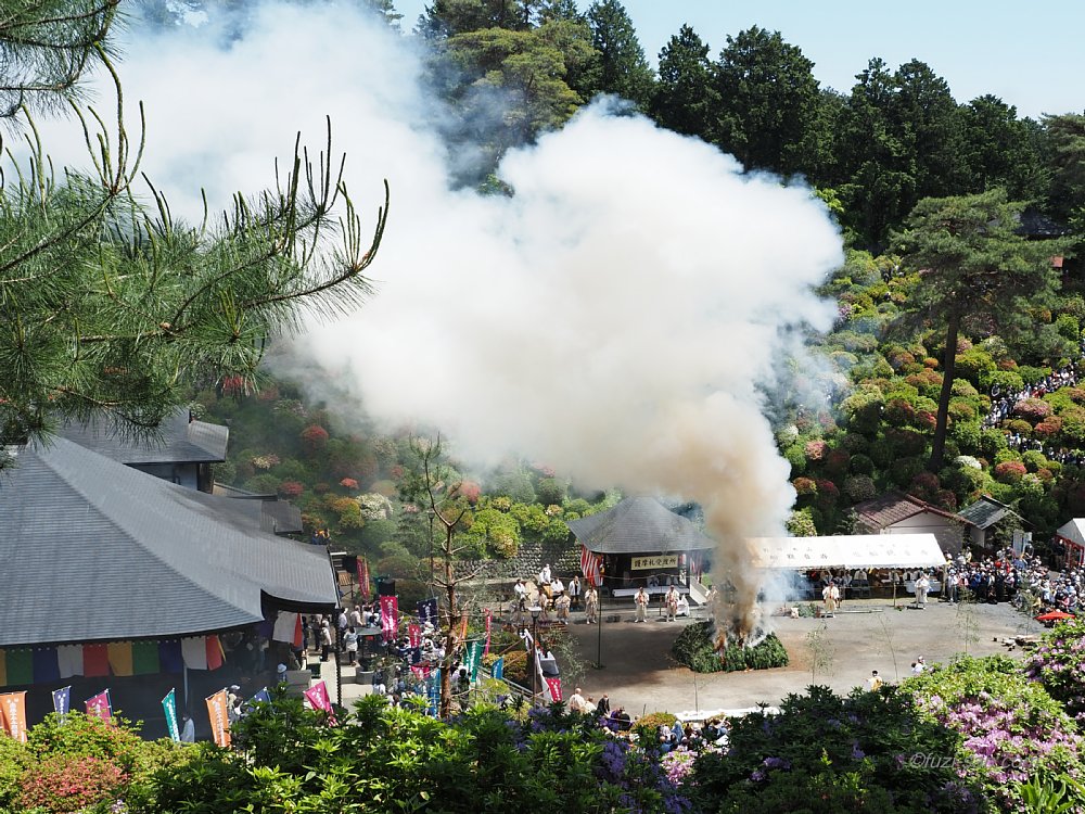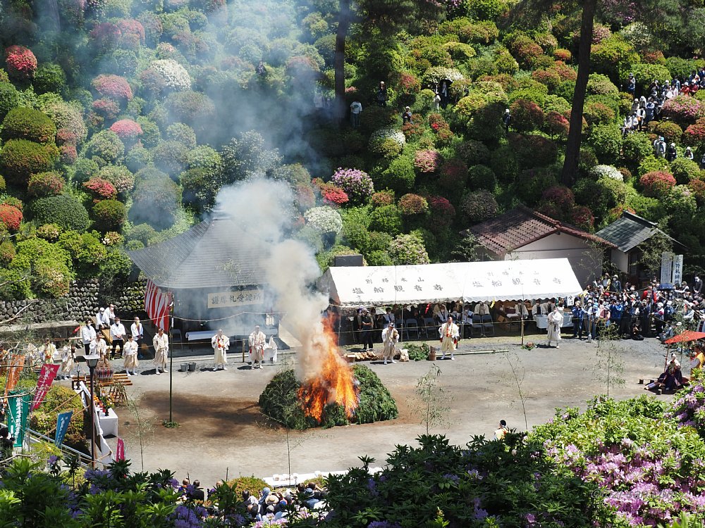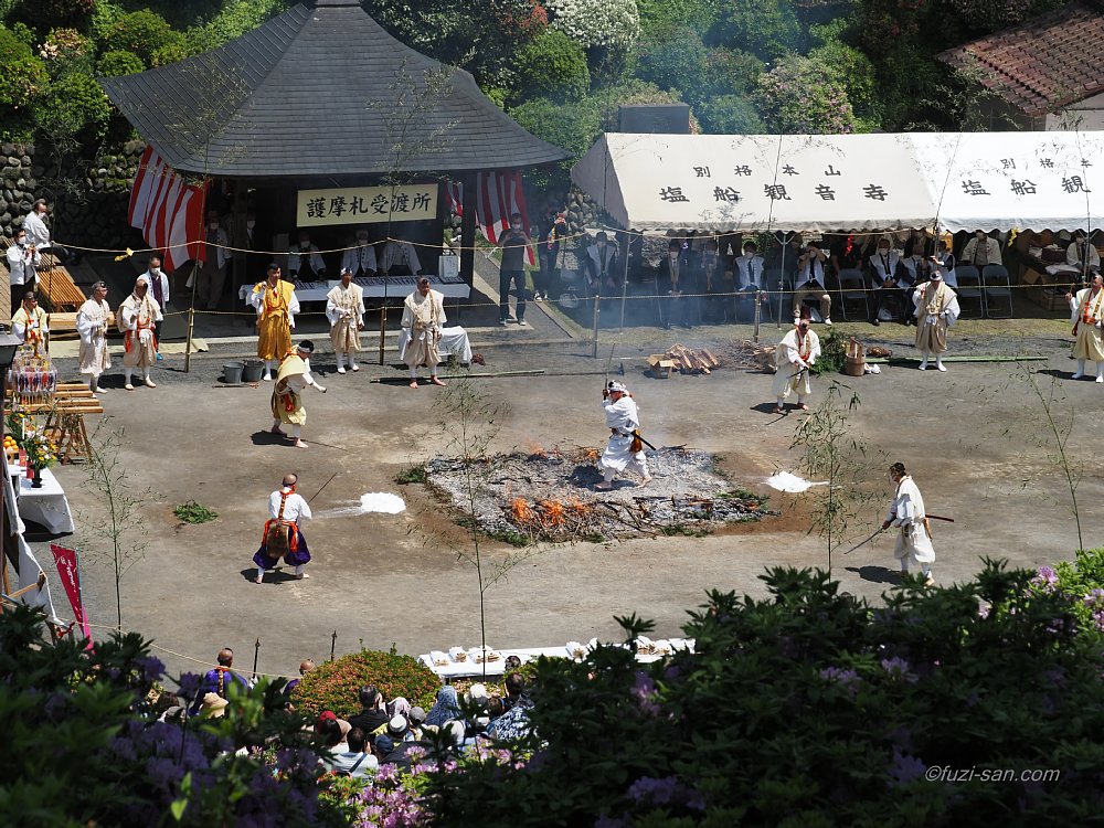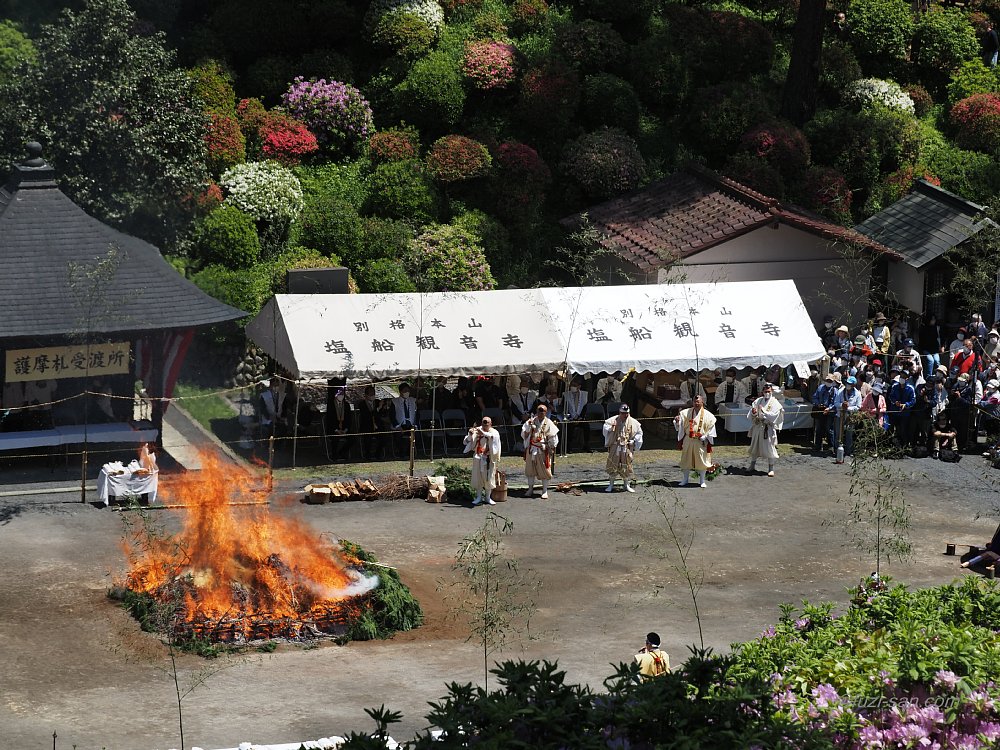 5月3日憲法記念日、塩船観音寺でつつじ祭りと例大祭火渡り荒行が行われたので見物に、ツツジはピークを過ぎていた。 火渡りは修験者のほか一般の方が約500名が参加していた。 ◆修験者が火渡りしている様子 ◆火渡り行事の一連の流れの様子