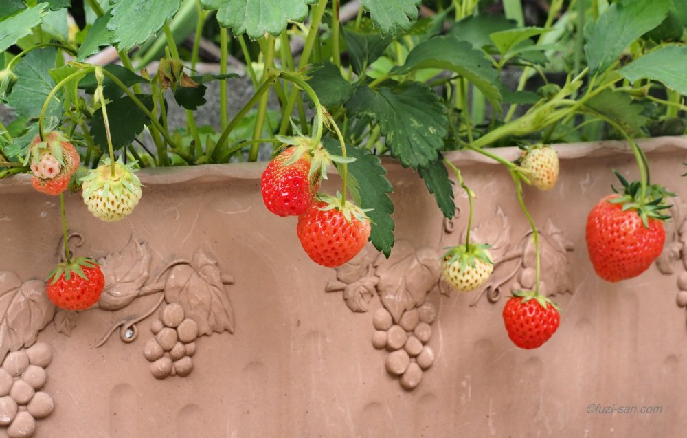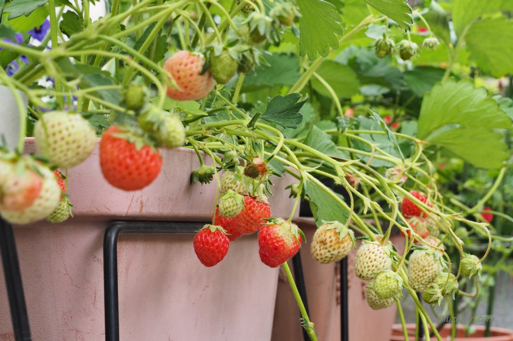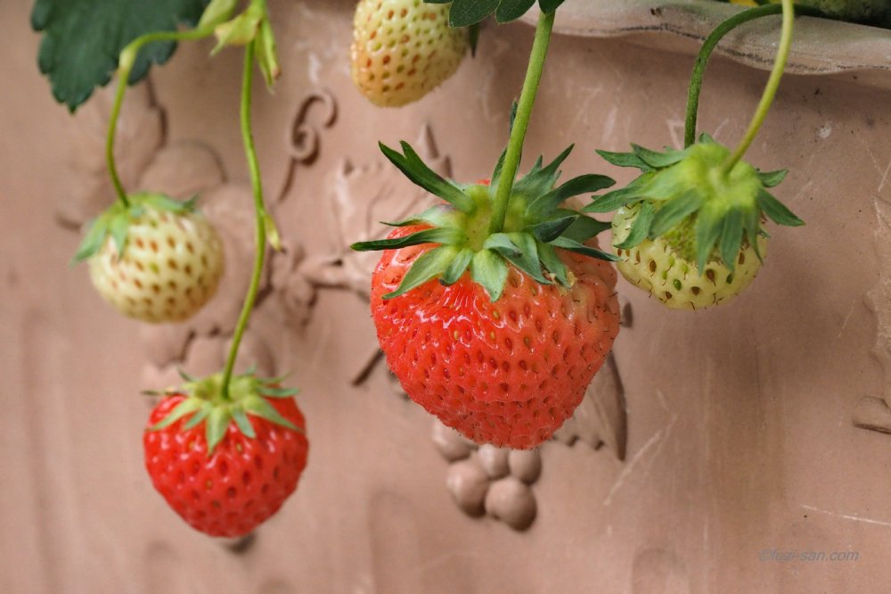 昨日は夏日で暑かったが、今日は一転して曇りで4月上旬ころの陽気。 栽培しているイチゴが色付き食べごろが近い。今年は一部分「とちおとめ」を栽培した。
