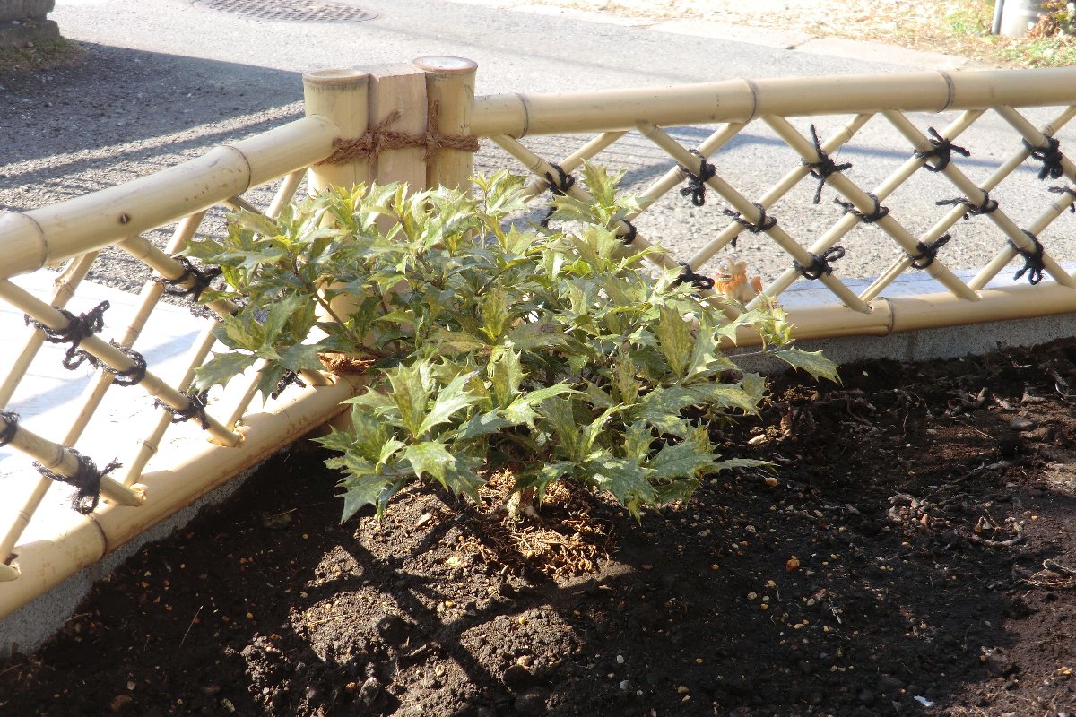 先日垣ねを作ったところに、5年ほど鉢で栽培していた五色柊(ゴシキヒイラギ)を定植した。 この五色柊は黄・白などの斑が入っており、緑葉のヒイラギよりも生長が遅く放任して育てても自然な樹形になるが、放っておくと樹高が高くなる。しかし 刈り込みには強いとのこと。 ヒイラギはよく生垣にしているのを見かけ、家の庭には表鬼門(北東)にヒイラギ、裏鬼門(南西)に南天の木を植えると良いとされている。(鬼門除け)