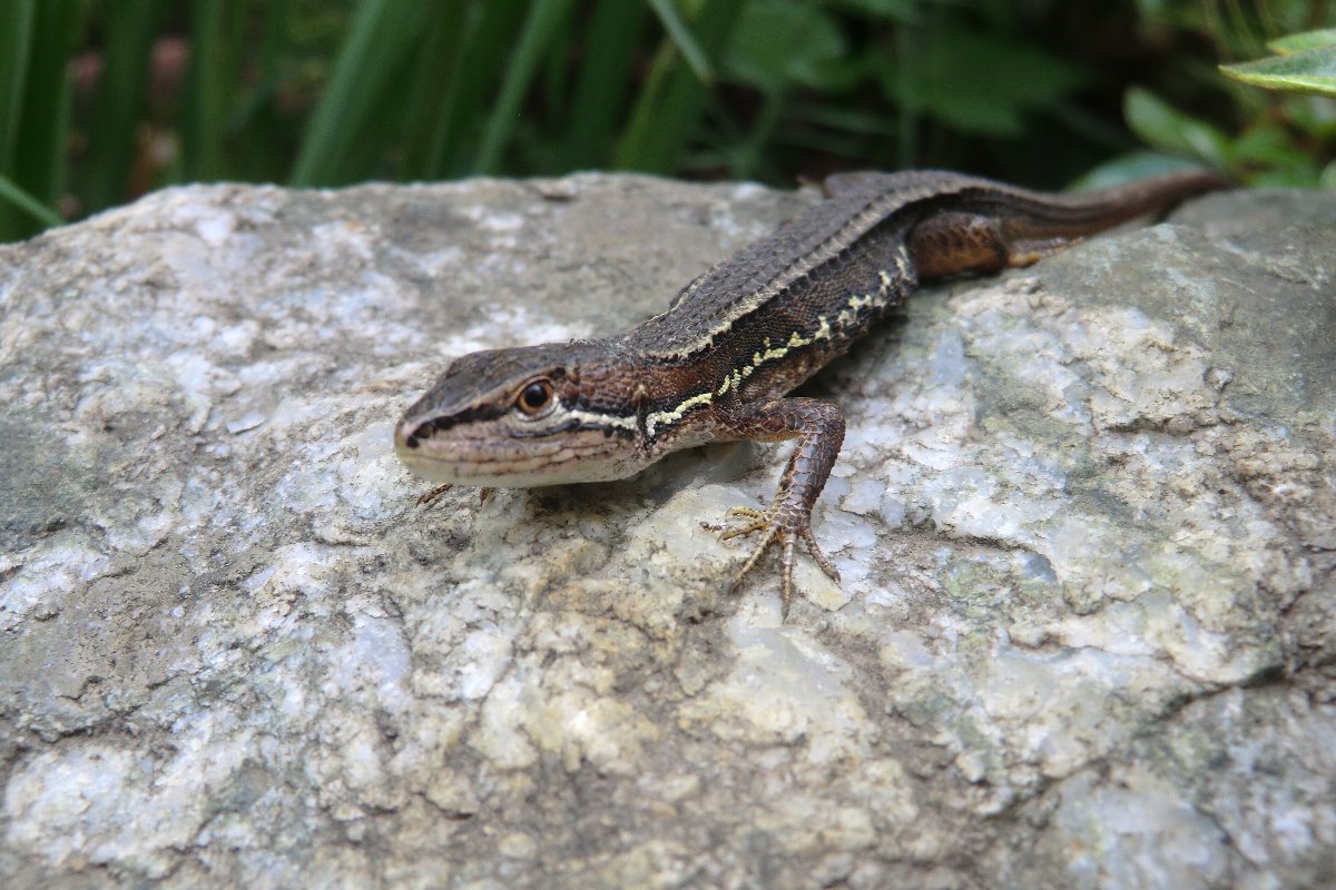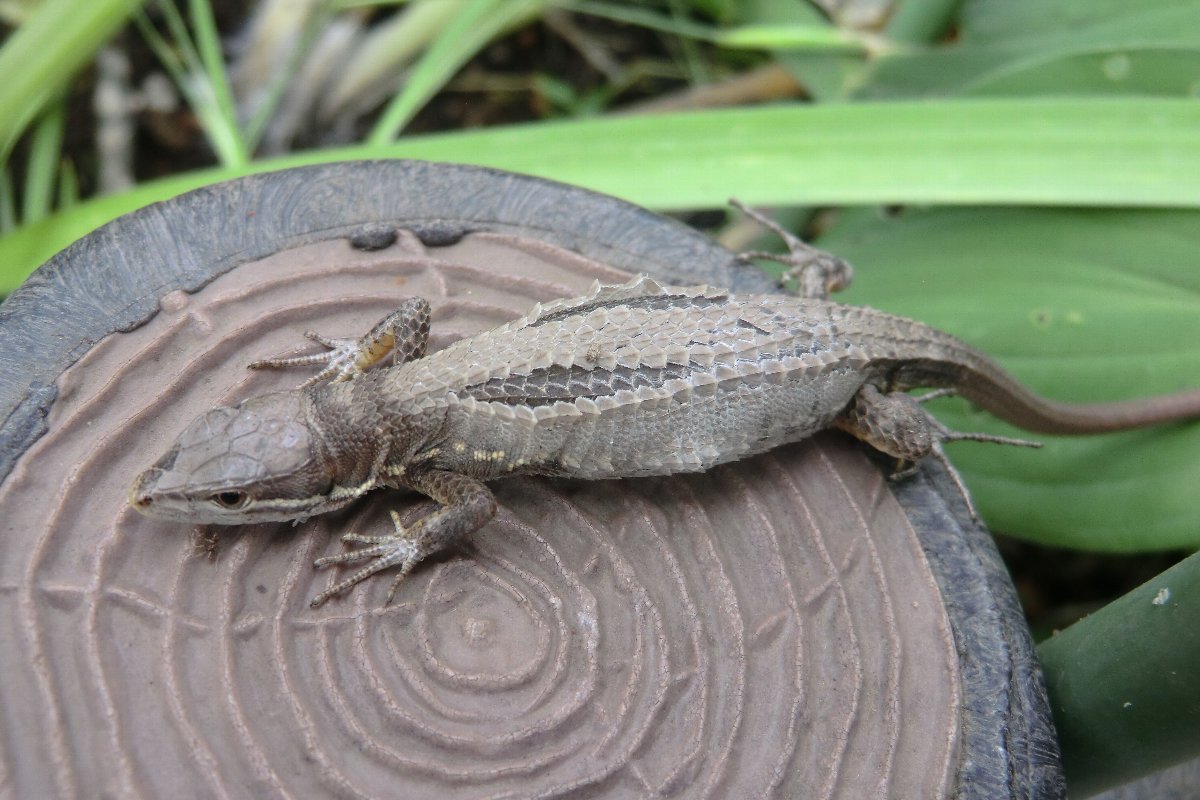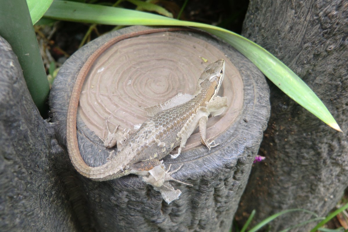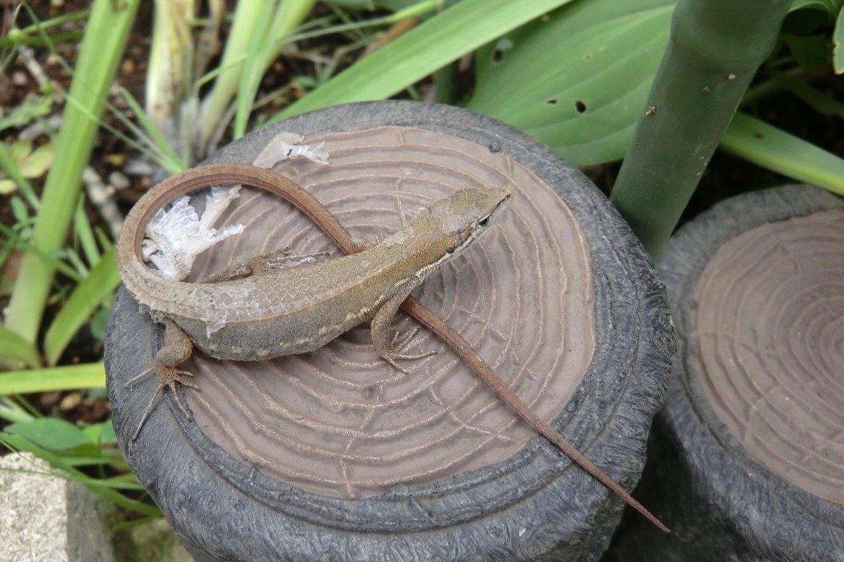 5日に例年より3日ほど早い梅雨入り後、4日間降り続いた大雨も一休みで蒸し暑く大気が不安定。 夕方には雷を伴う集中豪雨で大雨警報と土砂災害警戒情報が発令されされた。 午前中の晴れ間がでて気温が上昇した庭でトカゲが脱皮しているのに遭遇(3時間くらいかけて脱皮)。 毎年庭で数匹が生活をしており夏の暑い日に良く見かけ、今日は脱皮中と日光浴中のトカゲ2匹と対面。