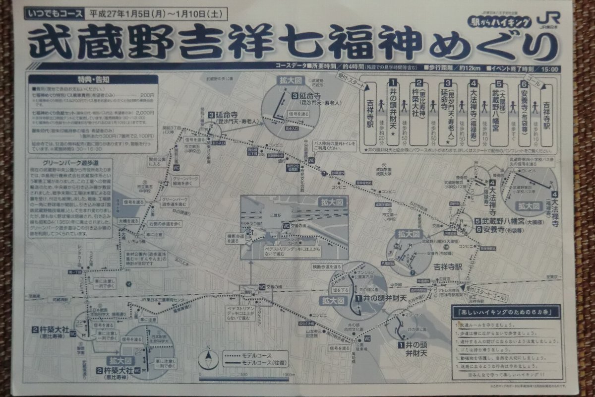 吉祥寺駅→井の頭弁財天→杵築大社(恵比寿神)→延命寺(毘沙門天、寿老人)→大法禅寺(福禄寿)→武蔵野八幡宮(大黒様)→安養寺(布袋尊)→吉祥寺駅、