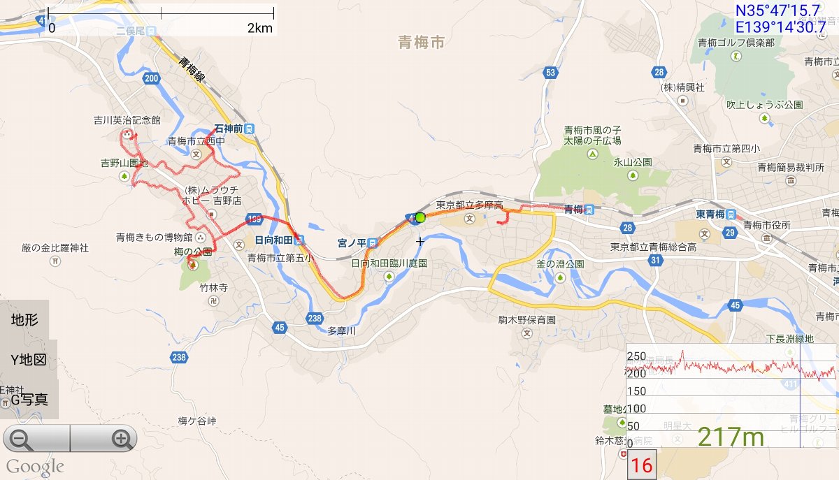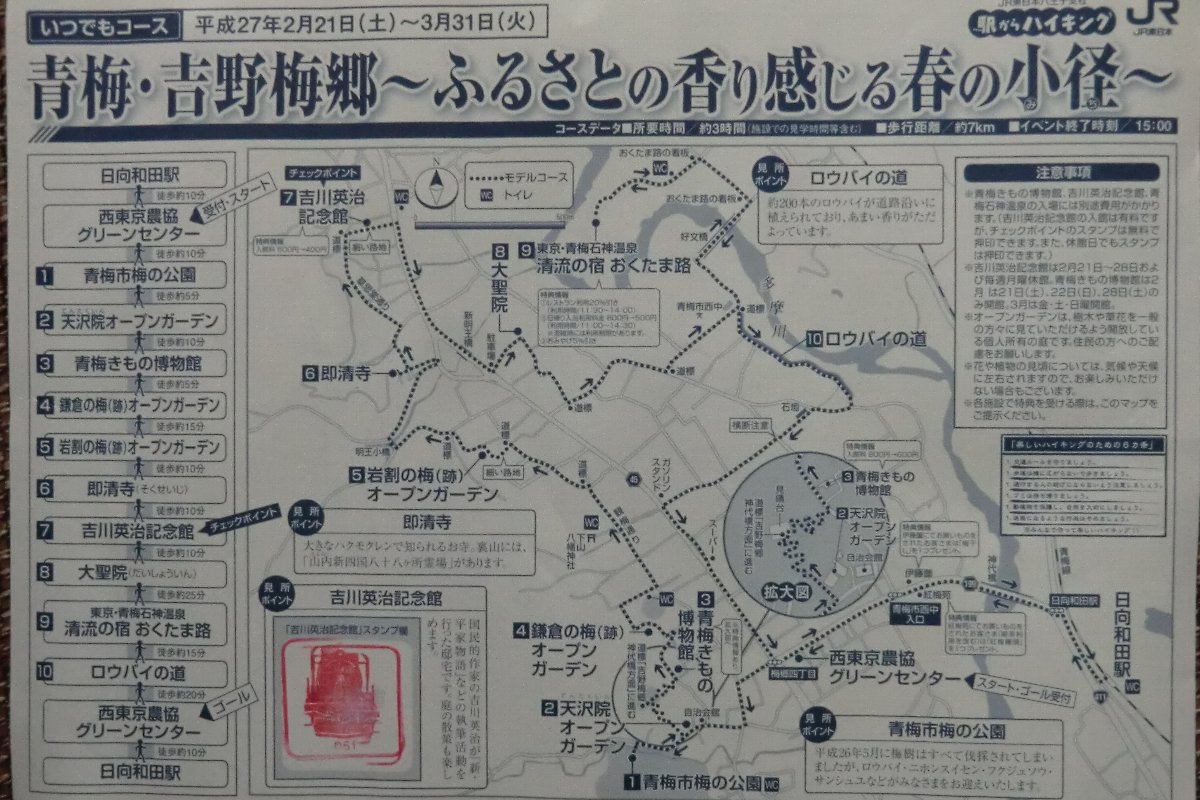 日向和田駅→西東京農協グリーンセンタ→梅の公園→岩割の梅(跡)→吉川栄治記念館→ロウバイの道→西東京農協グリーンセンタ→日向和田駅→金剛寺→青梅駅、