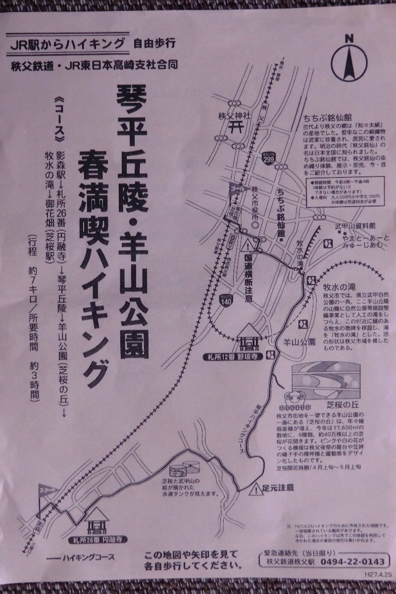 影森駅→札所26番(円融寺)→琴平丘陵→羊山公園(芝桜の丘)→牧水の滝→御花畑駅、