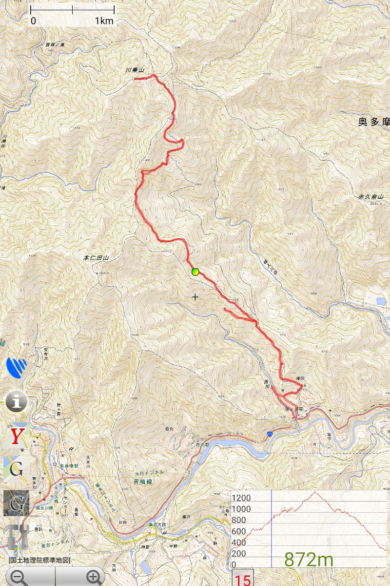 鳩ノ巣駐車場(08:35)→大根ノ山ノ神(09:23)→大ダワ(10:38)→舟井戸(11:32)→川苔山(11:59,12:32)→大ダワ(13:20)→大根ノ山ノ神(13:58)→鳩ノ巣駐車場(14:33)