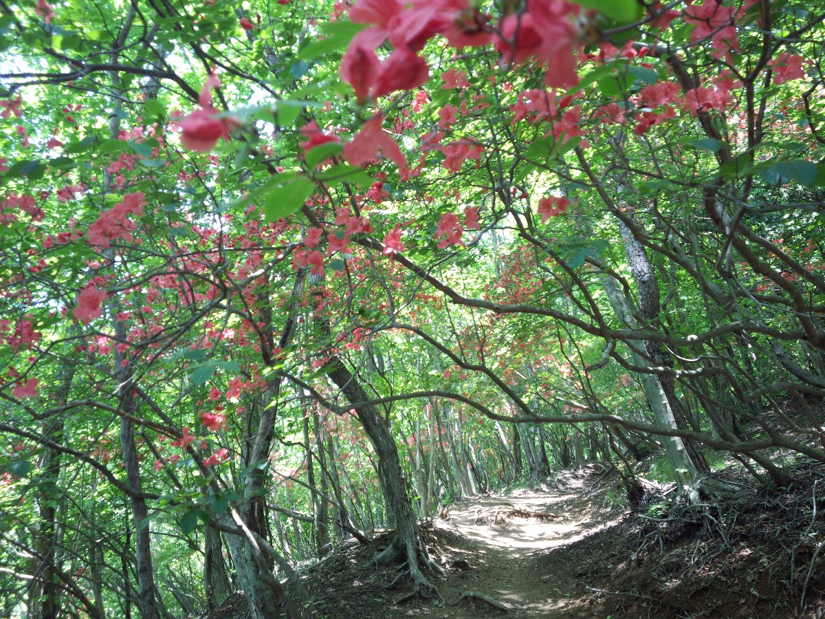 大ダワの手前から新緑の雑木林で涼しい風が通り気持ちがよい、舟井戸の先では満開の山ツツジが登山道をトンネルのように覆い綺麗であった。
