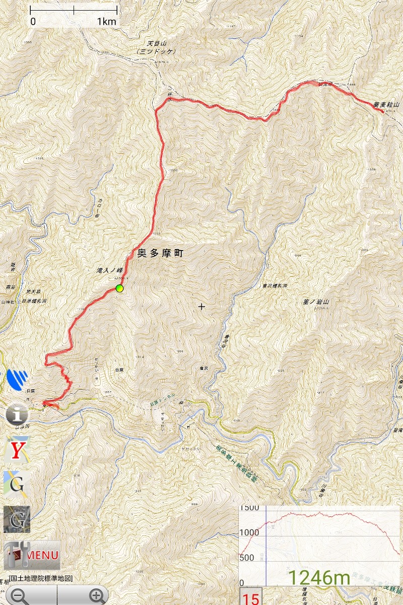 東日原登山口駐車場(08:50)→滝入ノ峰(10:05)→一杯水避難小屋(11:02)→仙元峠分岐(11:46)→蕎麦粒山(12:03,12:30)→一杯水(13:15)→滝入ノ峰(14:00)→登山口駐車場(15:03)