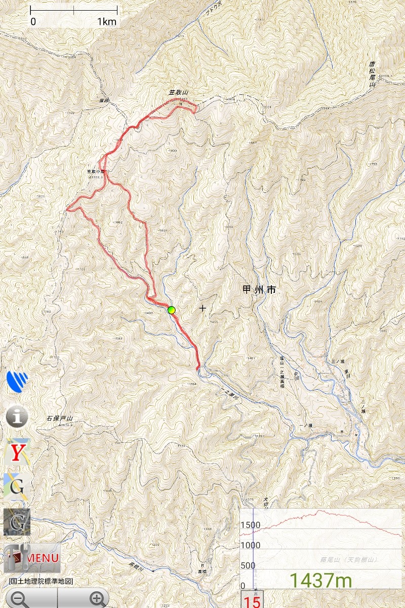 作場平登山口駐車場(10:00)→一休坂分岐(10:20)→ヤブ沢峠(11:01)→笠取小屋(11:24)→小さな分水嶺(11:47)→笠取山西峰(12:14)→笠取山(12:23,12:43)→水干(13:01)→笠取小屋→一休坂→登山口駐車場(14:28)