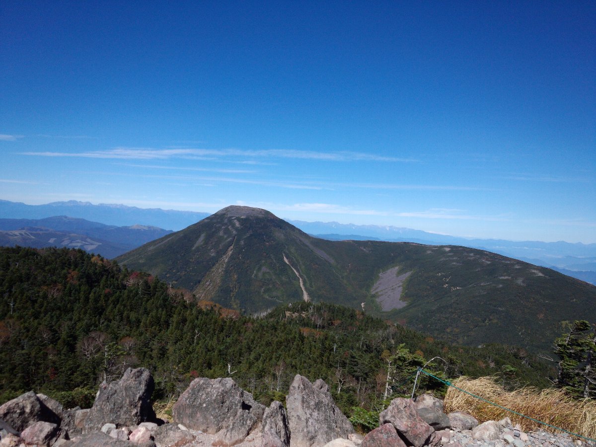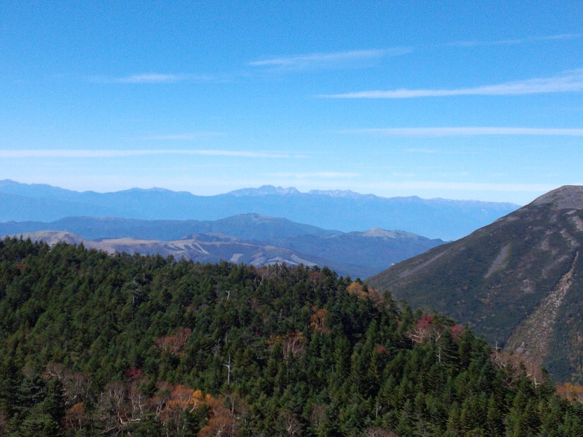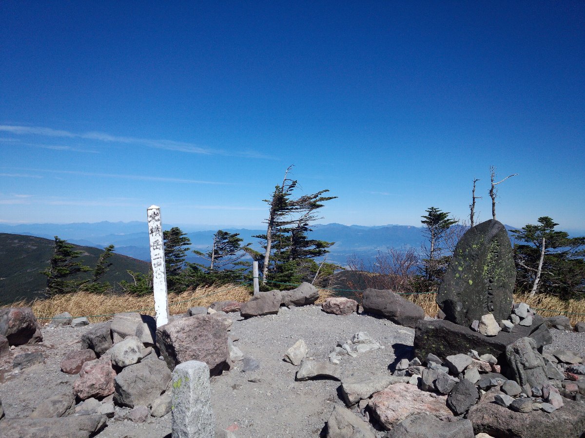 台風21号が低気圧に変わり、10月1日から2日にかけた爆弾低気圧通過直後で気持ち良い秋晴れの天気、山頂からの展望は快晴で360度の展望が素晴らしく、南八ヶ岳、南アルプス、中央アルプス、北アルプスと見晴らすことができた。しかし山頂は強風のため長時間滞在ができなかった。