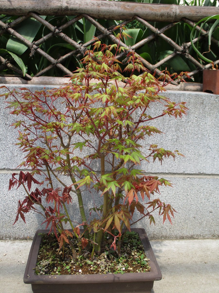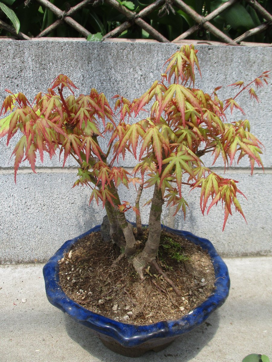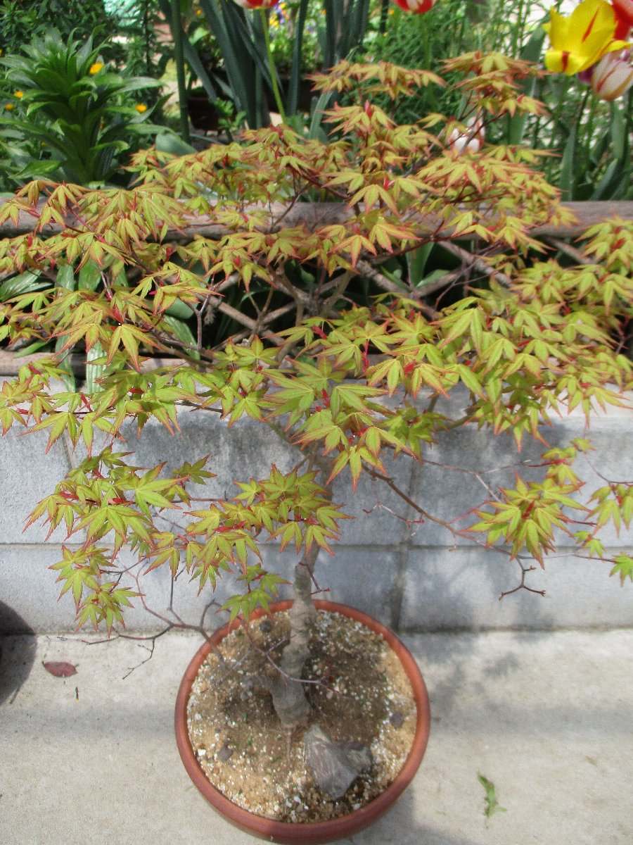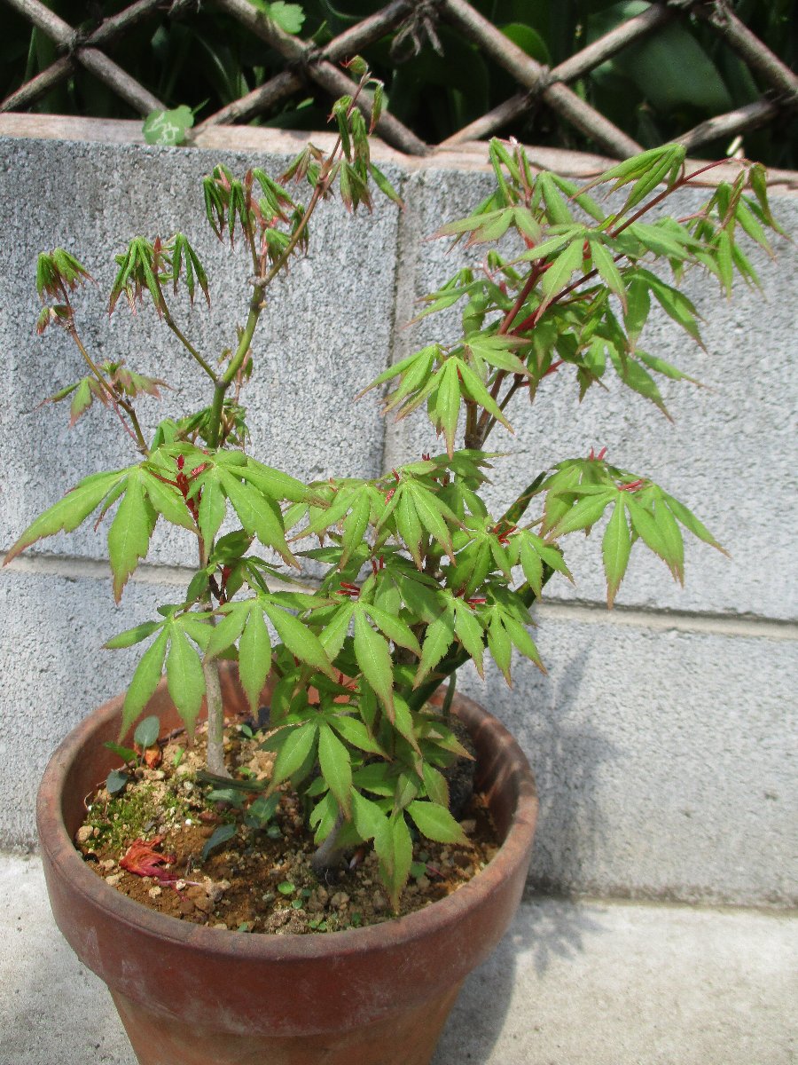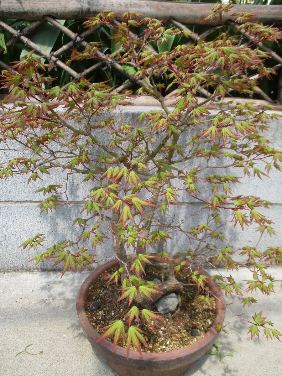 モミジ(カエデ)が萌芽から新葉に展開して綺麗な春紅葉(はるもみじ)である。 秋にはこのモミジの紅葉が楽しめます。 ★モミジとカエデの違い ・名前の付け方での違い、紅葉(こうよう)から名づけた「モミジ」と葉型から名づけた「蛙手(かえるて)=カエデ」。 蛙手は切れ込んだ葉の形をカエルの手に見立てたもの。 ・盆栽界では、葉の切れ込みの深いものをモミジ、浅いものをカエデと呼んでいる。
