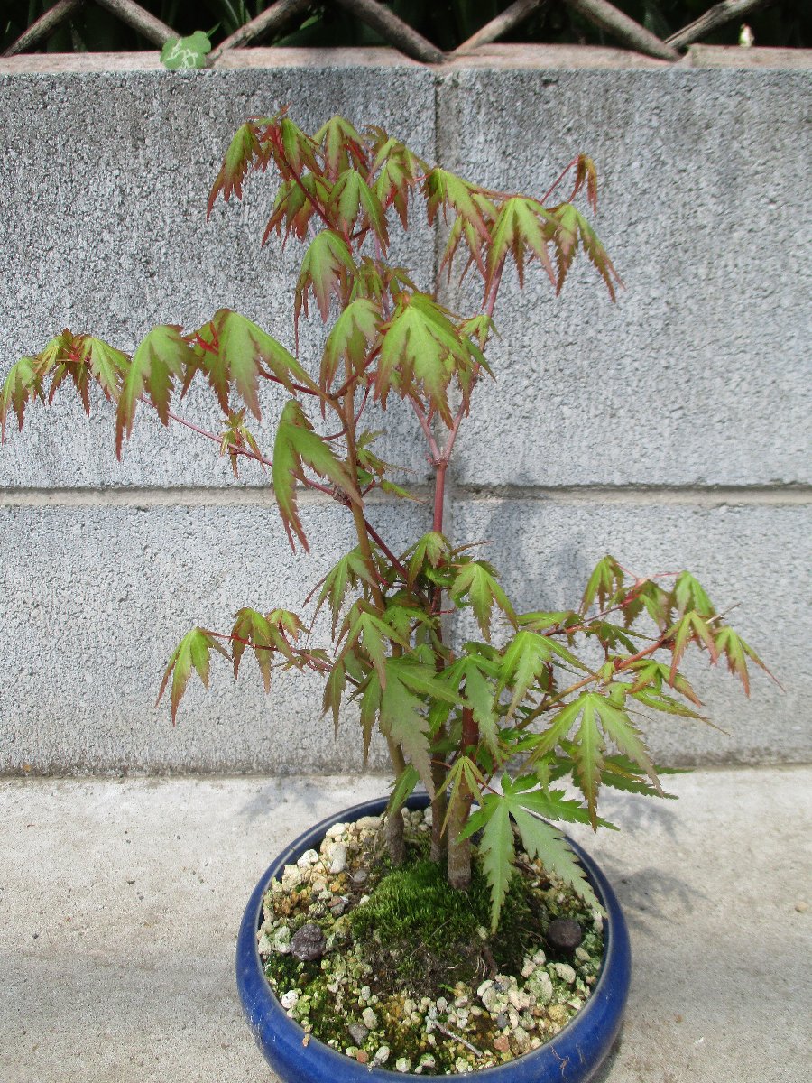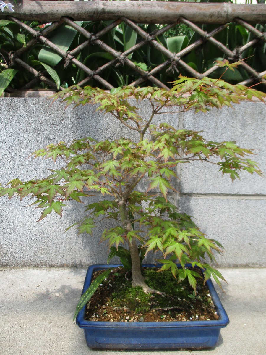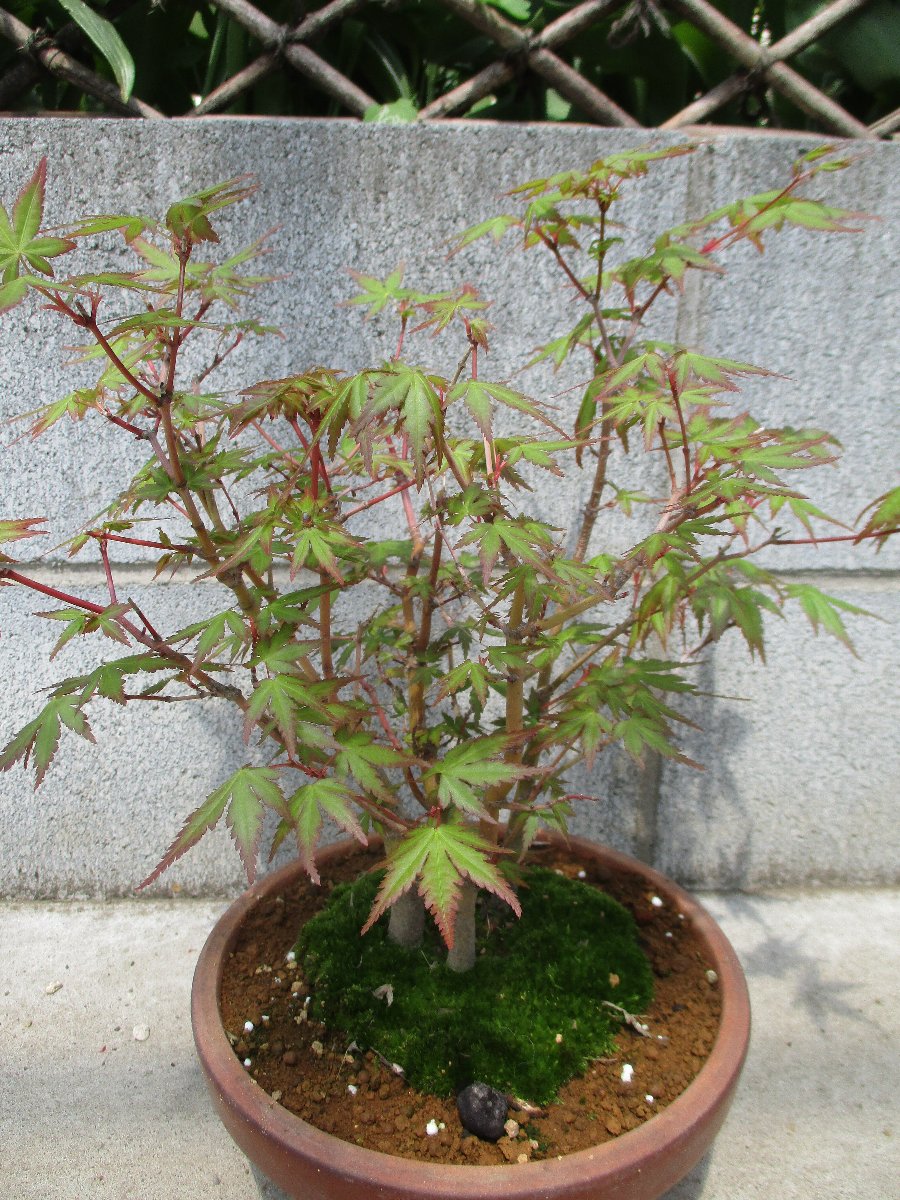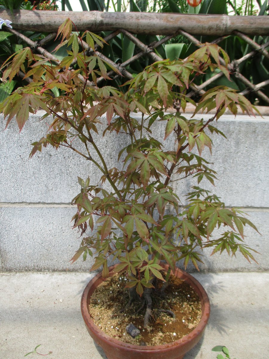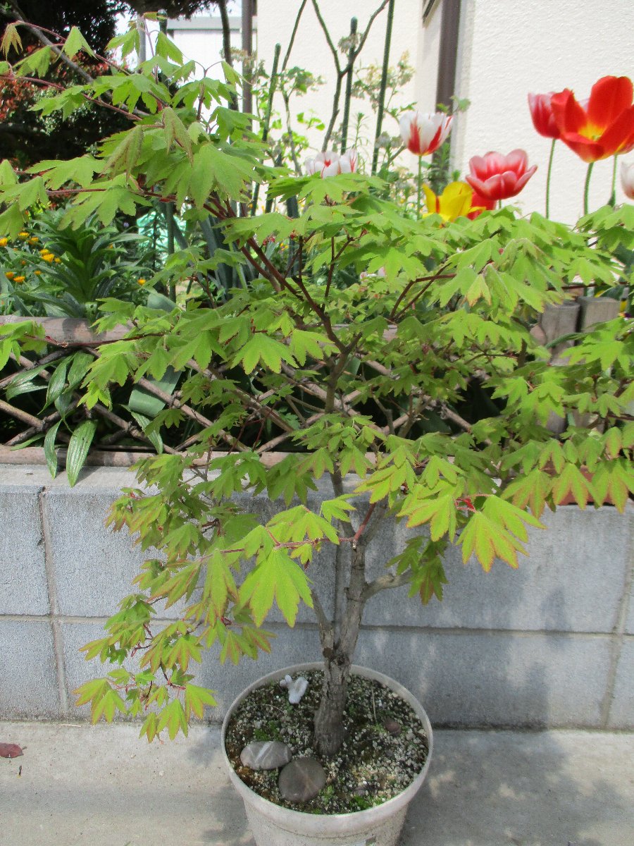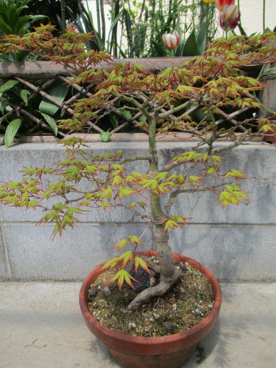 モミジ(カエデ)が萌芽から新葉に展開して綺麗な春紅葉(はるもみじ)である。 秋にはこのモミジの紅葉が楽しめます。 ★モミジとカエデの違い ・名前の付け方での違い、紅葉(こうよう)から名づけた「モミジ」と葉型から名づけた「蛙手(かえるて)=カエデ」。 蛙手は切れ込んだ葉の形をカエルの手に見立てたもの。 ・盆栽界では、葉の切れ込みの深いものをモミジ、浅いものをカエデと呼んでいる。
