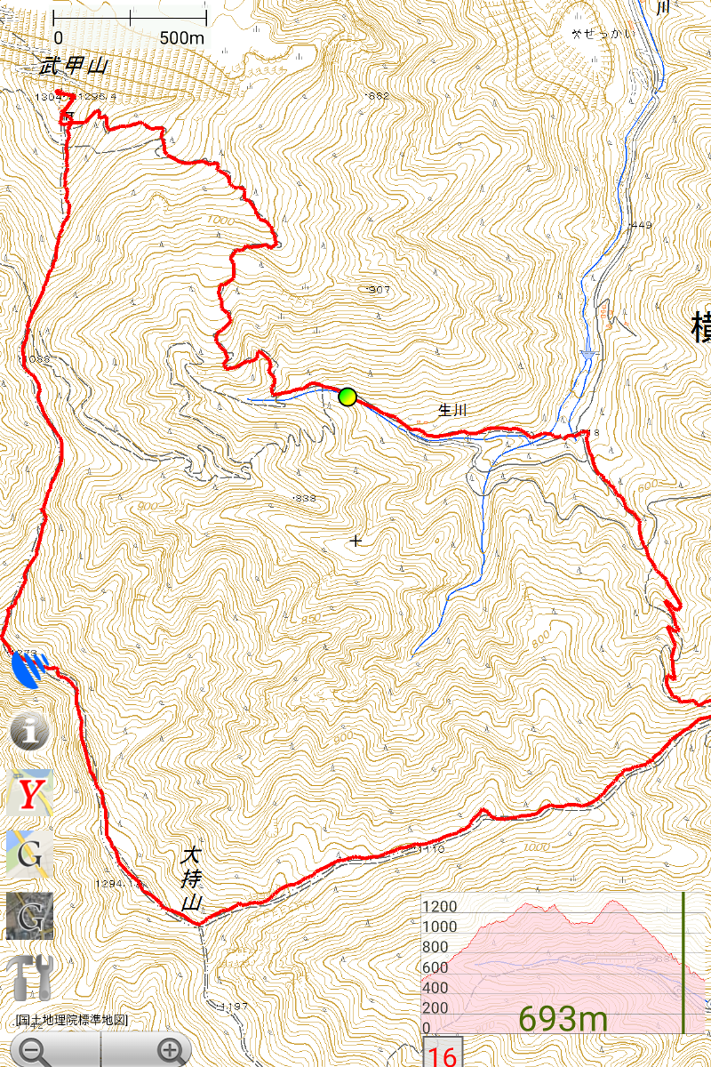 生川の登山口駐車場を基点に大持山、子持山、武甲山を周回して駐車場に戻るコース。
