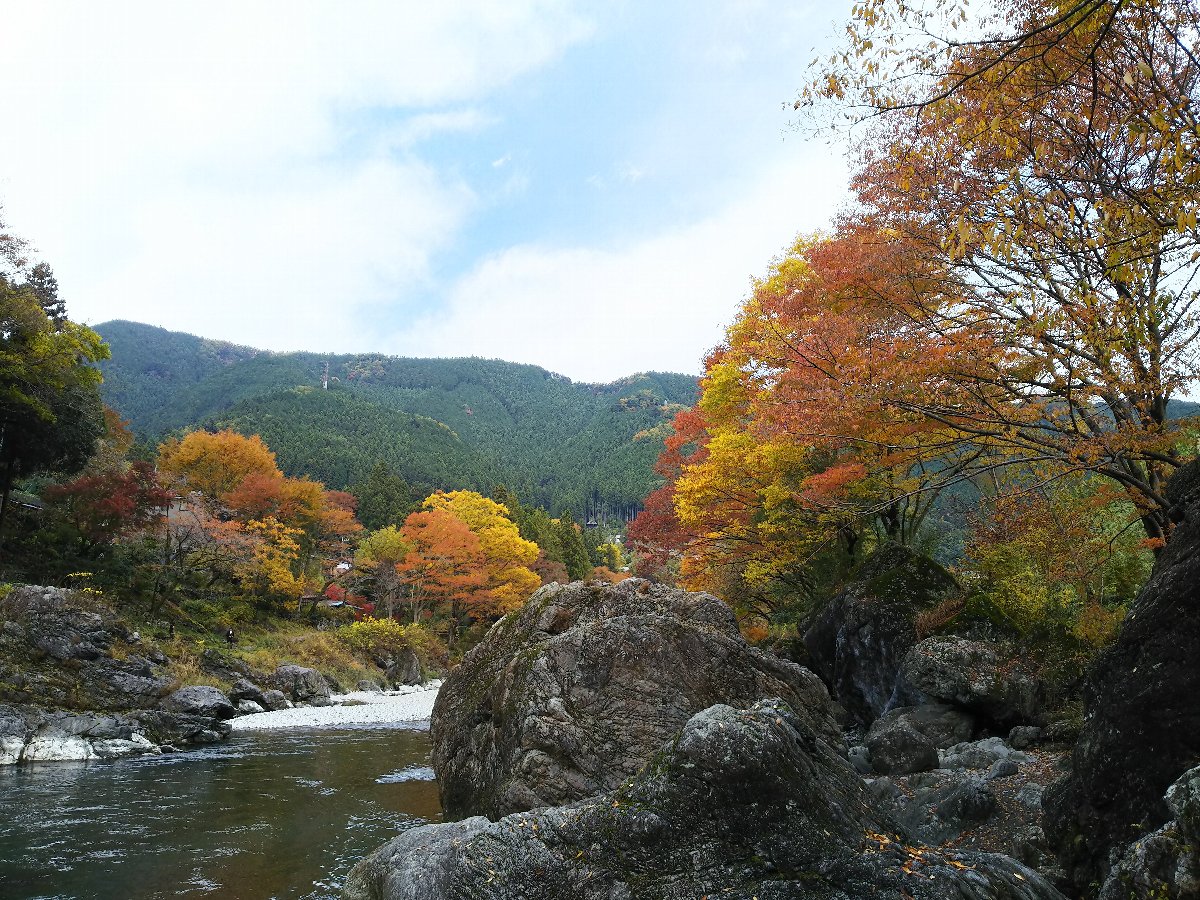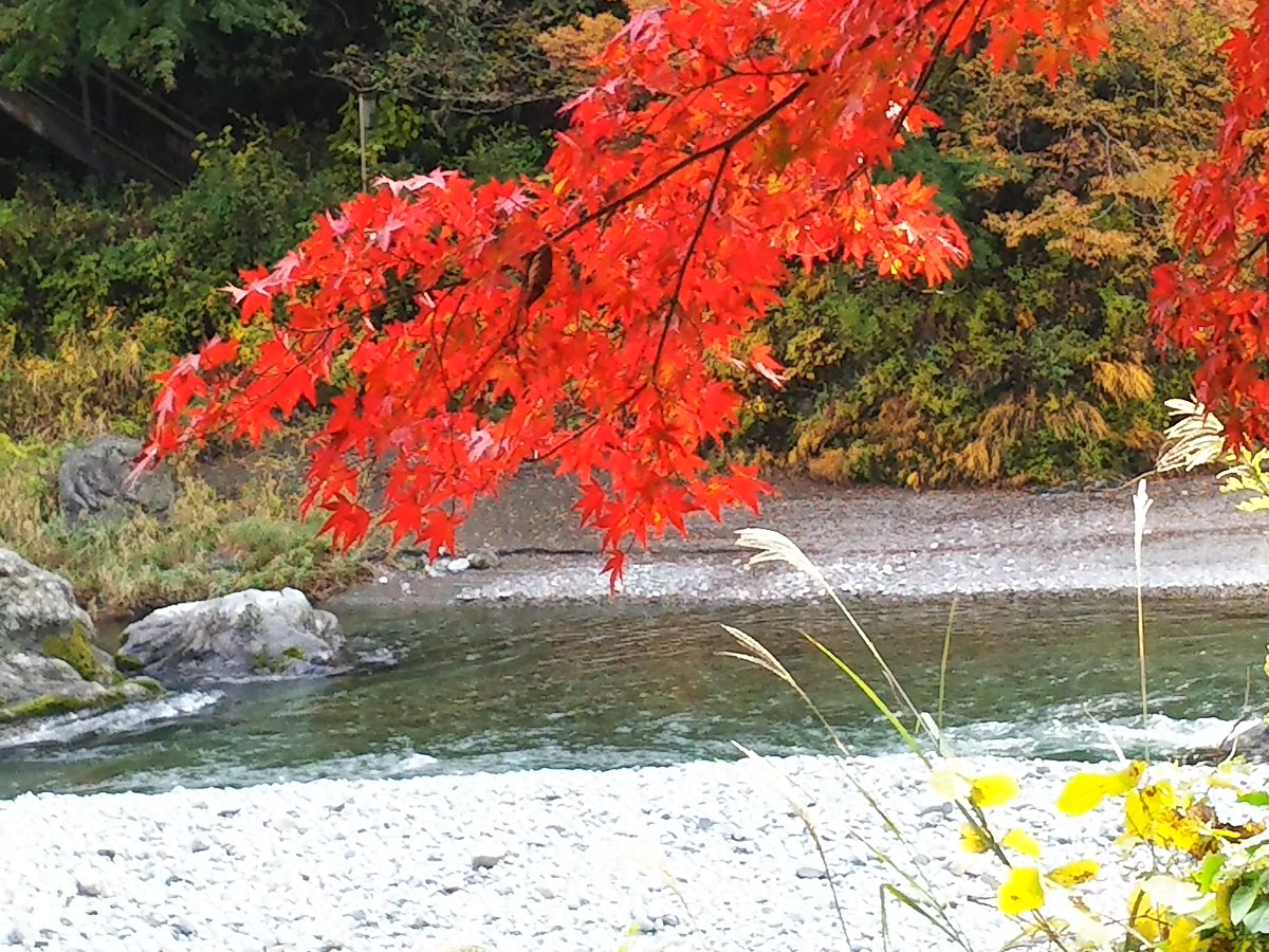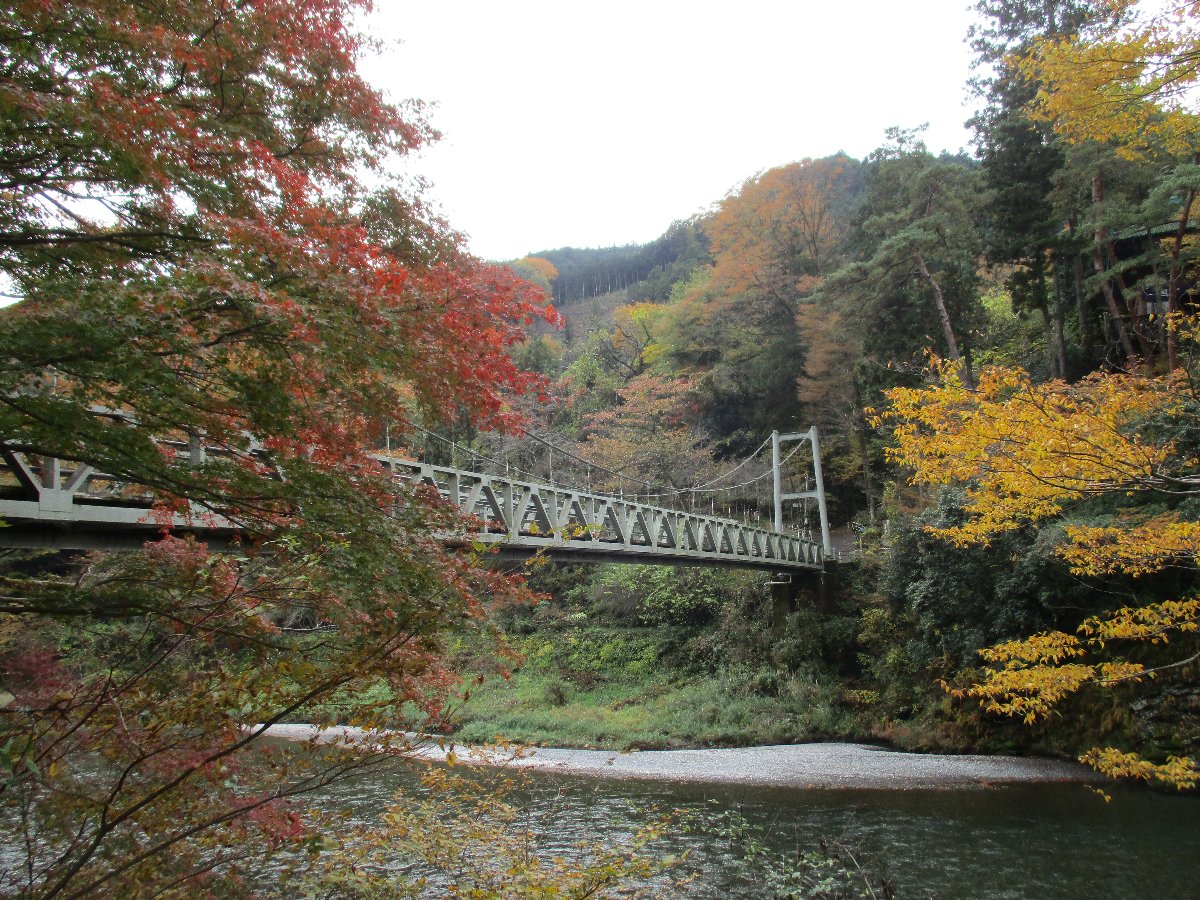 今日は暖かい小春日和である。 天気の回復が早く朝から晴れになったので、紅葉の見頃となっている御岳渓谷にモミジ狩りに出かけた。 渓谷の遊歩道は昨夜から未明の雨と落ち葉で滑りやすく歩きにくかったが渓谷の紅葉を堪能できた。