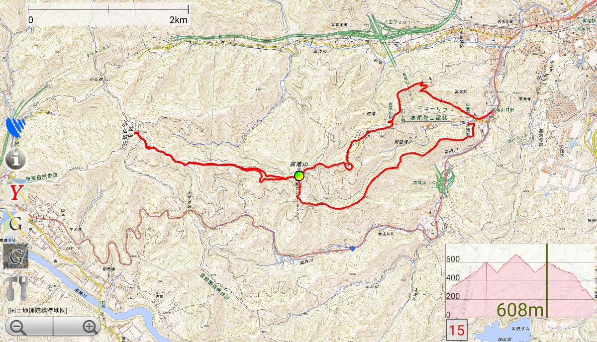 稲荷山コース登山口(08:45)→稲荷山(09:17)→高尾山(09:54)→一丁平(10:37)→小仏城山(11:03,11:30)→高尾山(12:21)→薬王院(12:38)→高尾山口駅(13:45)
