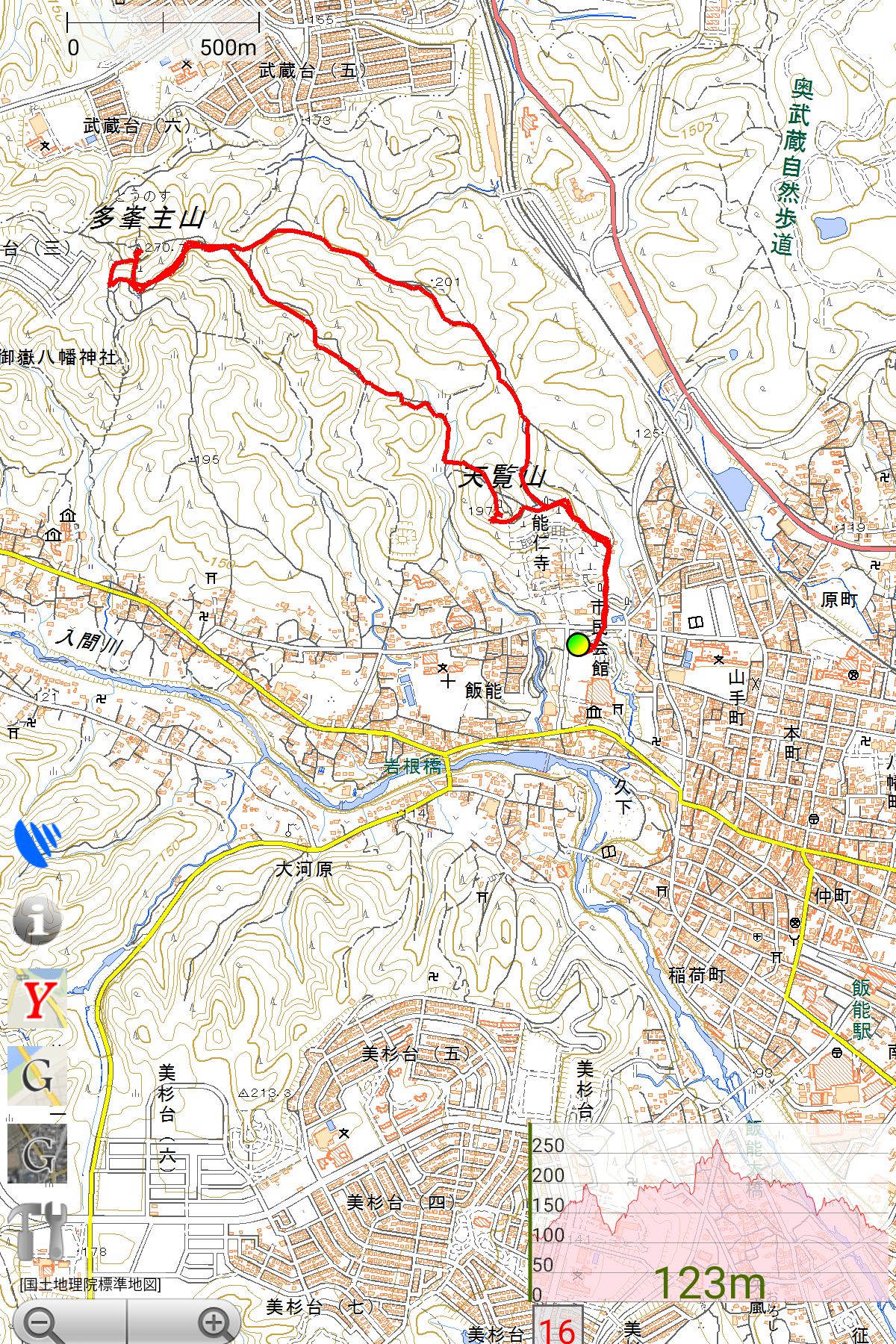 飯能市民会館駐車場(10:03)→天覧山(10:15,10:22)→多峯主山(10:52,11:05)→駐車場(11:40)
