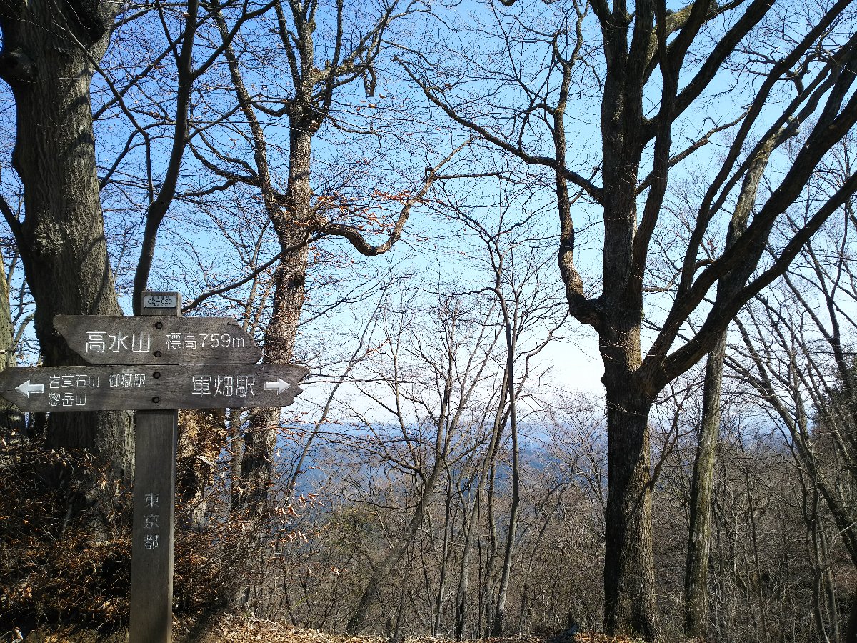 軍畑駅(8:44)→高水山(10:22,10:30)→岩茸石山(10:55,11:15)→惣岳山(11:48,12:00)→御岳駅(12:57)→御岳渓谷遊歩道→寒山寺駐車場(13:30)