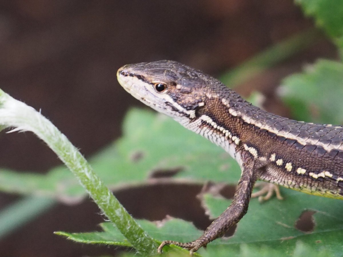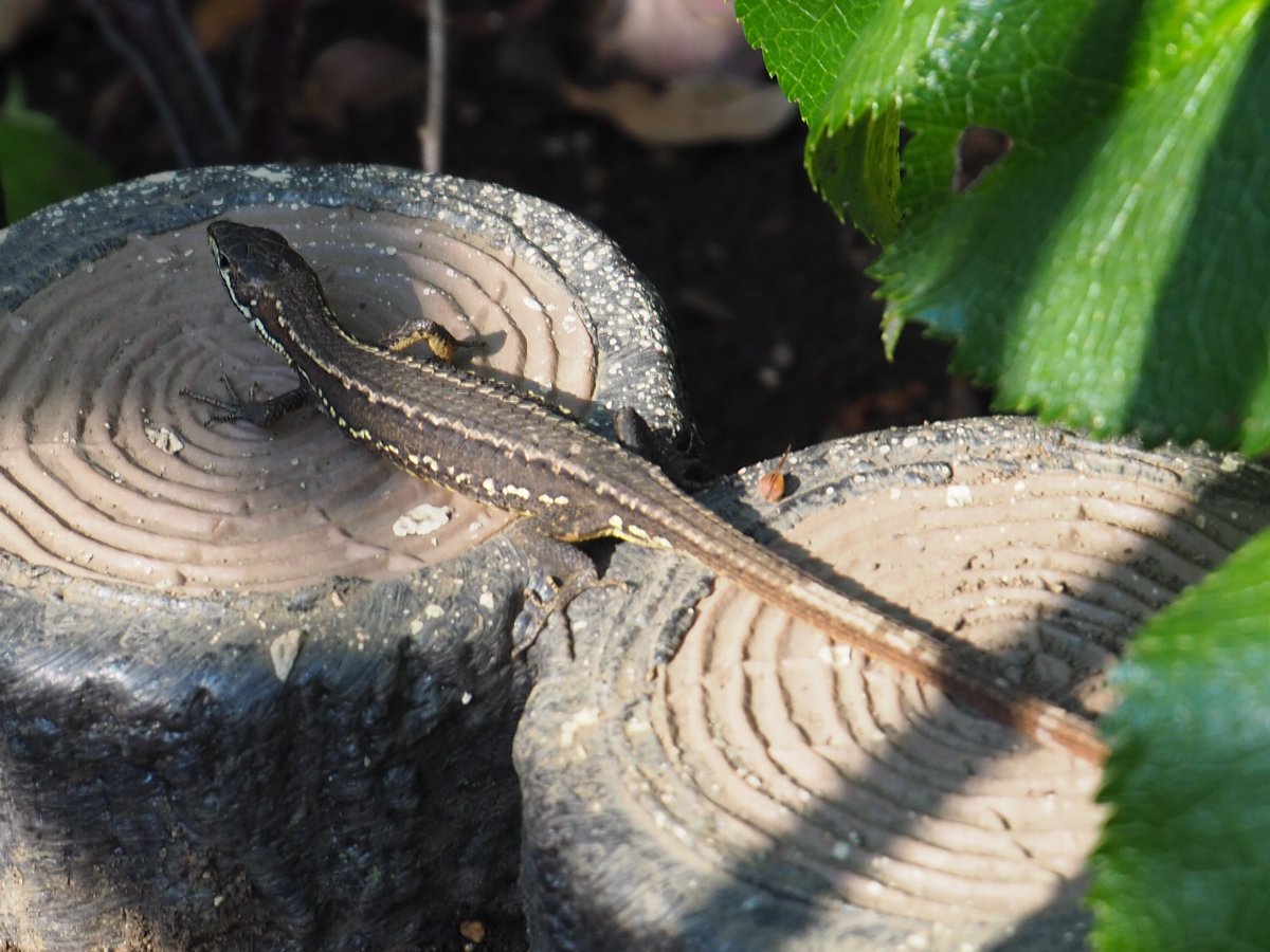 庭に久しぶりにニホンカナヘビが姿を現した。 カナヘビ科カナヘビ属に属する爬虫類の動物の一種で、トカゲとは違う。 カナヘビは長い尻尾でカサカサした肌(鱗状)をしており、 トカゲは尻尾が短く肌はツルツル(鱗が細かい)している。 そしてカナヘビは四肢と尻尾で体を支えて歩き、 トカゲは腹を地面につけて歩き、幼体は鮮やかな青い色の尻尾が特徴。