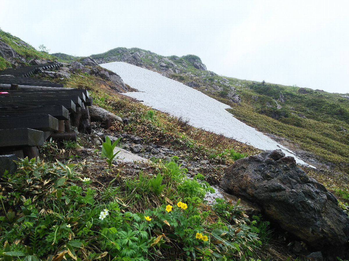 登山開始から2時間くらいした至仏山への登りで雨が降り出し、時々雷と強い風雨に見舞われてしまい濡れネズミ状態、花を楽しむどころではなかった。