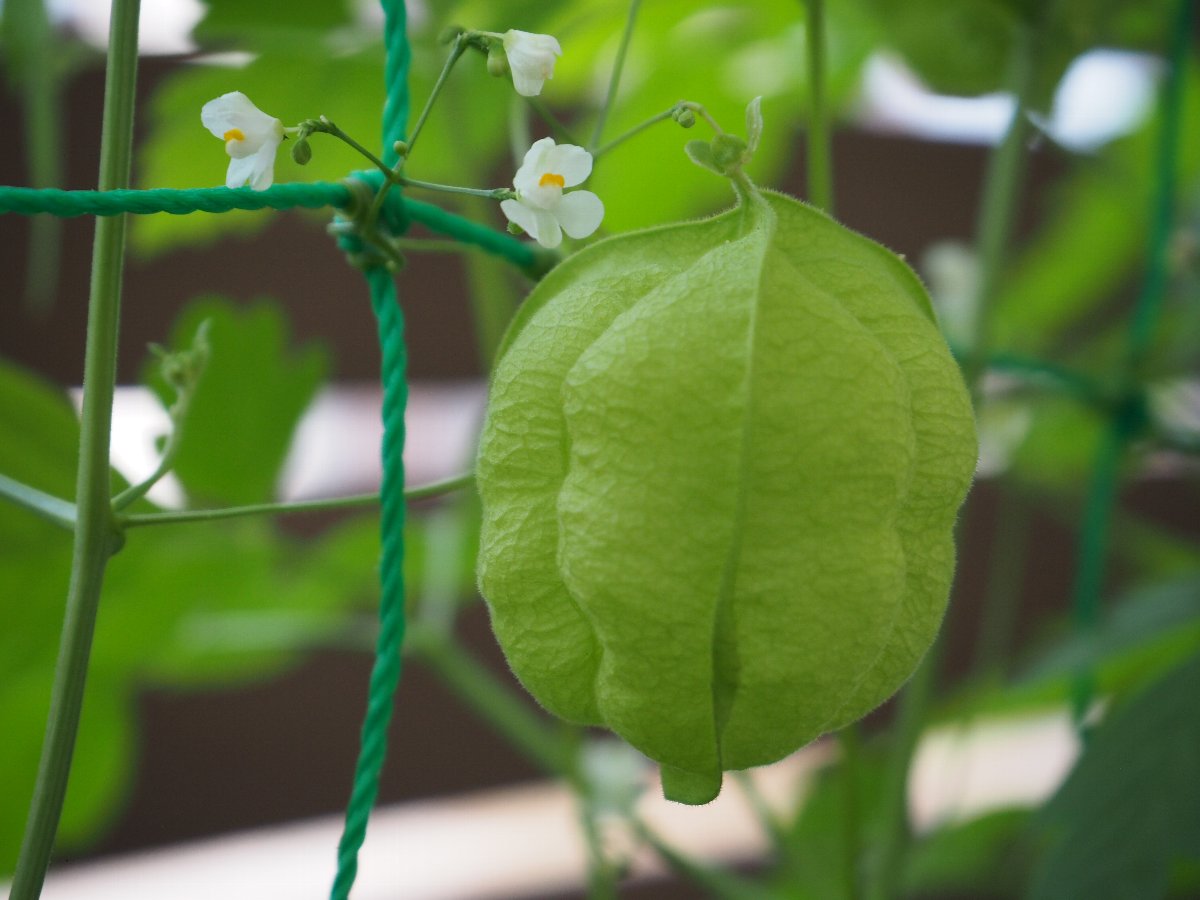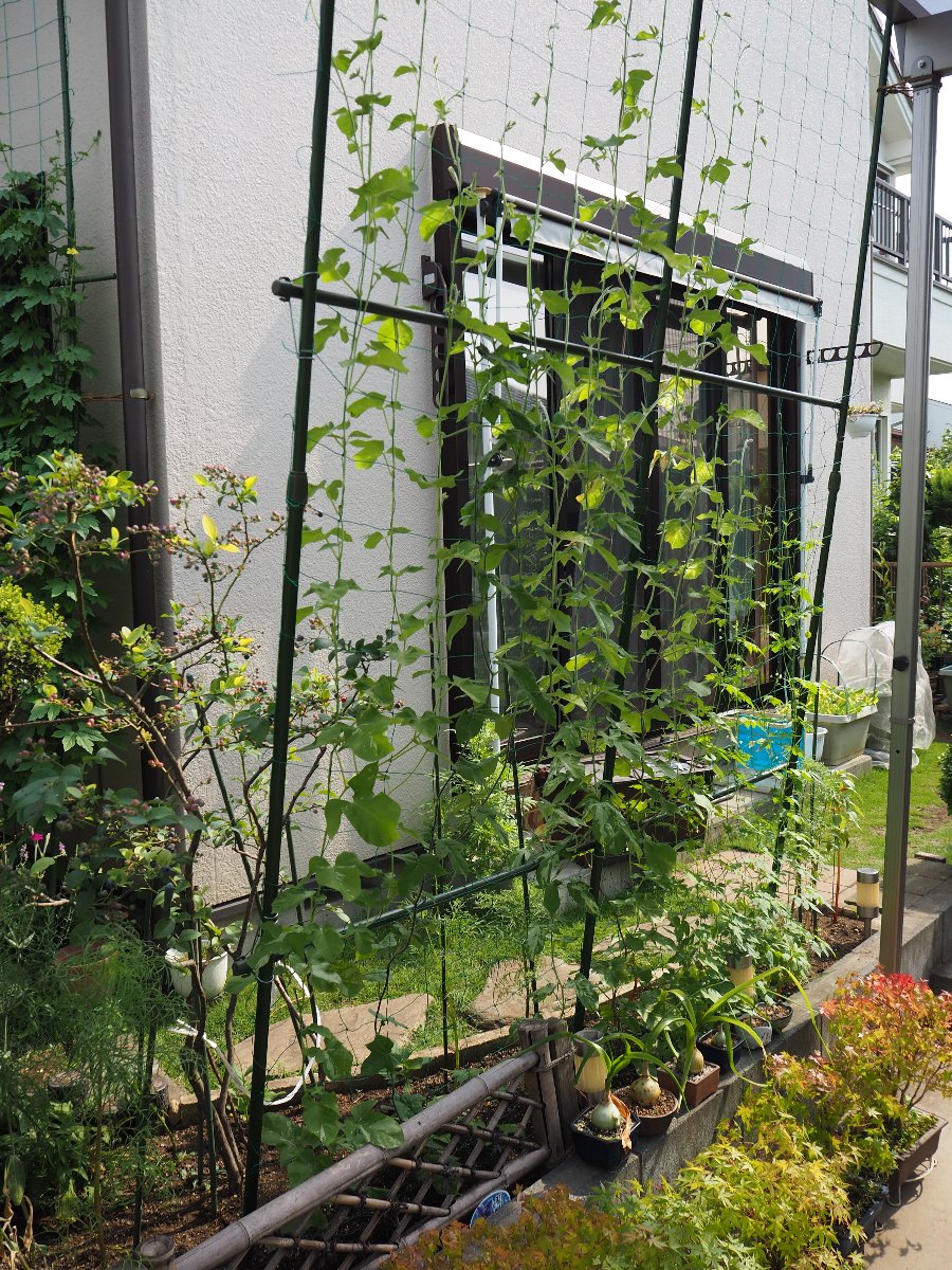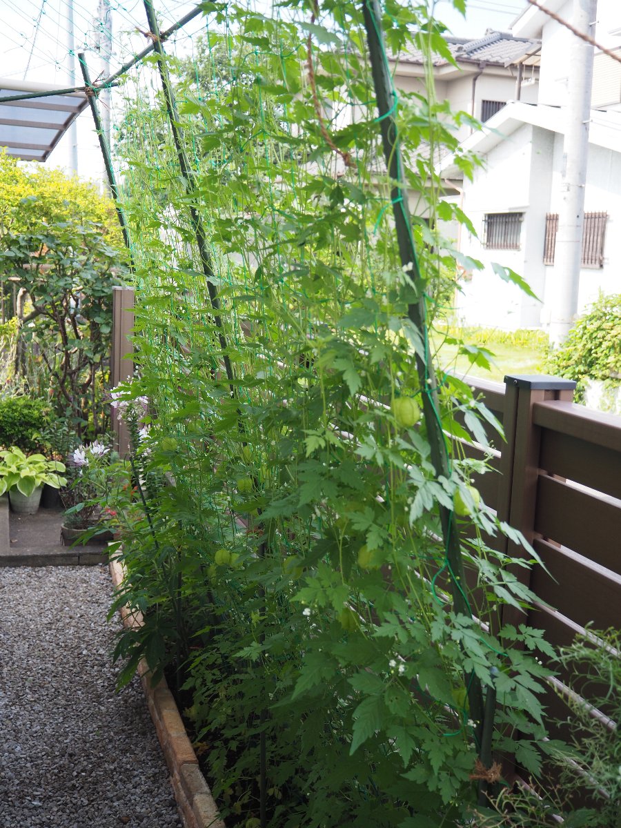 今年のグリーンカーテンは3種類です。ゴーヤ、フーセンカズラ、アサガオ 連日の猛暑の中、グリーンカーテンで少し癒されています。 ■ゴーヤ そろそろ食べれそうな実が沢山あります。 ■フーセンカズラ 白い小さな花がいっぱい咲き、実がフウセン(風船)になっています。 ■アサガオ 花が咲くのはこれからです。 ■6月13日の状況