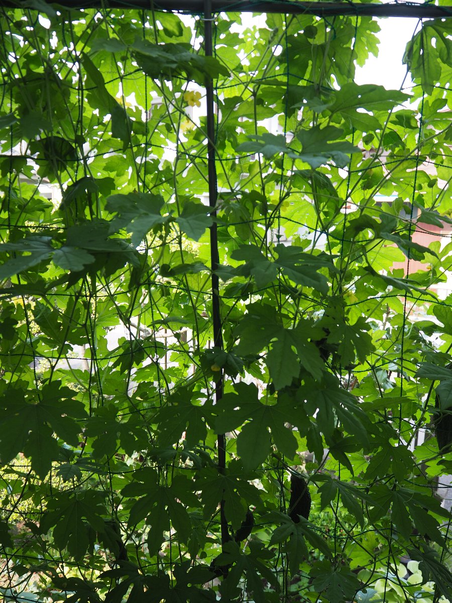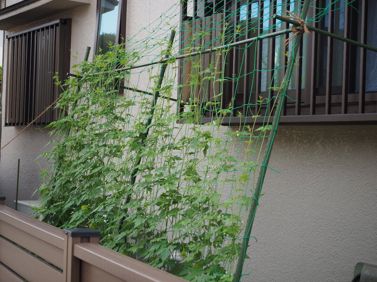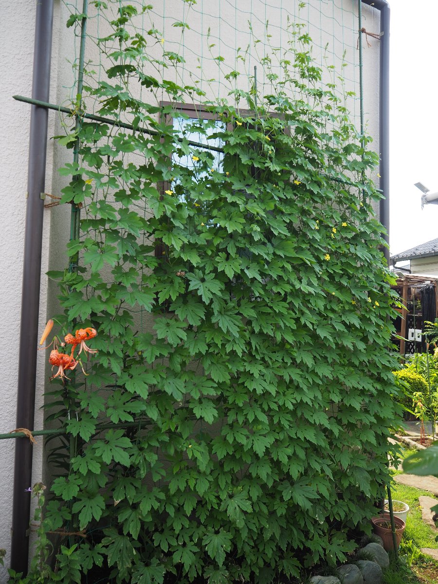 今年のグリーンカーテンは3種類です。ゴーヤ、フーセンカズラ、アサガオ 連日の猛暑の中、グリーンカーテンで少し癒されています。 ■ゴーヤ そろそろ食べれそうな実が沢山あります。 ■フーセンカズラ 白い小さな花がいっぱい咲き、実がフウセン(風船)になっています。 ■アサガオ 花が咲くのはこれからです。 ■6月13日の状況