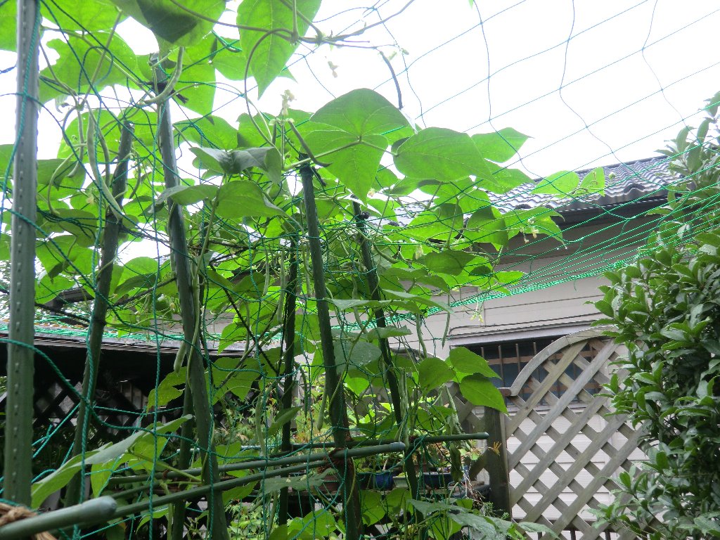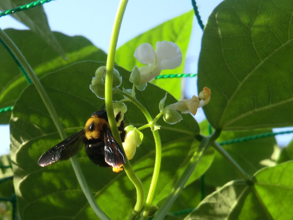 ウメモドキの花の蜜を一生懸命集めているミツバチ。 ウメモドキは実家からいただいた30年物で、毎年小さな赤い実をいっぱいつける。 インゲンの花を訪れたクマバチ。 庭の一部を一坪農園にしてインゲンを昨年に引続き栽培。 5月のGWに植え付け、すでに収穫もできており食卓の一品となっている。