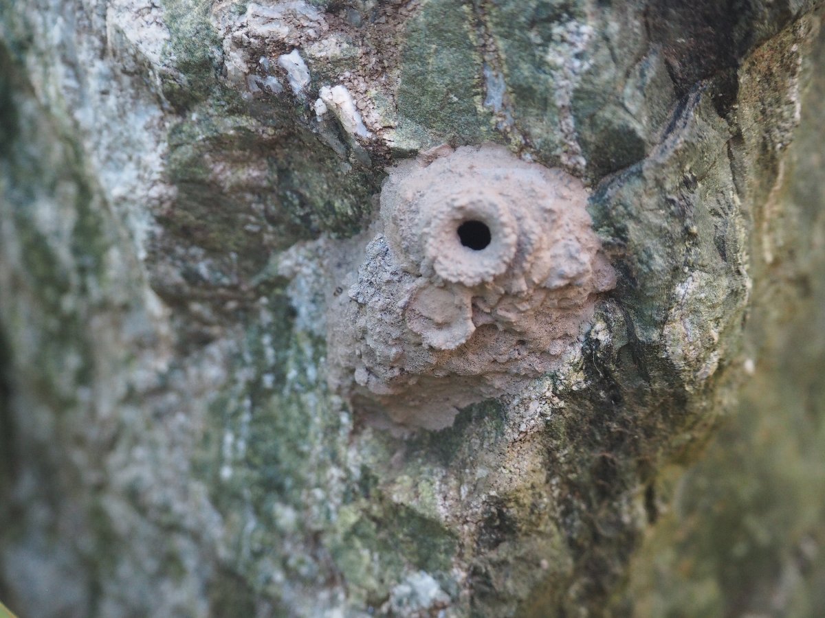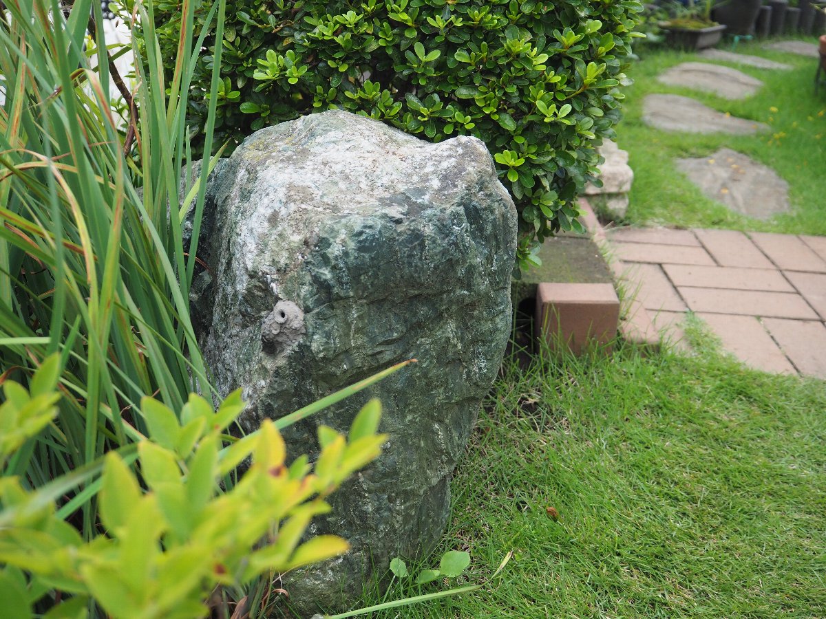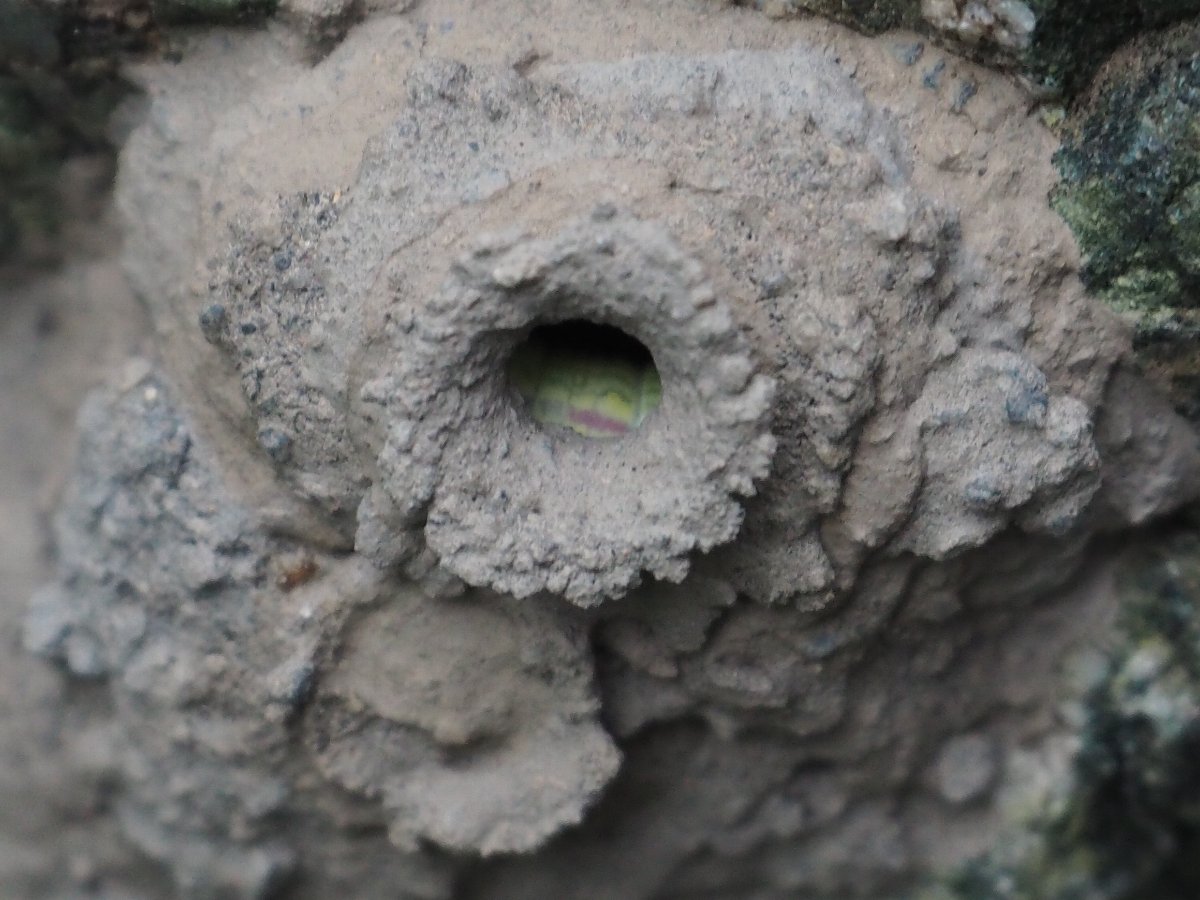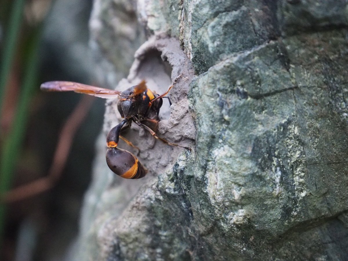 庭の庭石にスズバチが巣作りをした。スズバチはドロバチの一種で、 体には橙黄色の斑紋があり、腹部第1節は細長く、第2節以下が丸く膨れていて鈴を思わせるのでスズバチの名がある。 泥で器用に壺状の巣をつくり壁などにくっつけている。シャクトリムシなどの青虫を狩って巣に詰め、幼虫の餌とする。 この時期に巣作り・産卵、翌年の6月ころ孵化する。