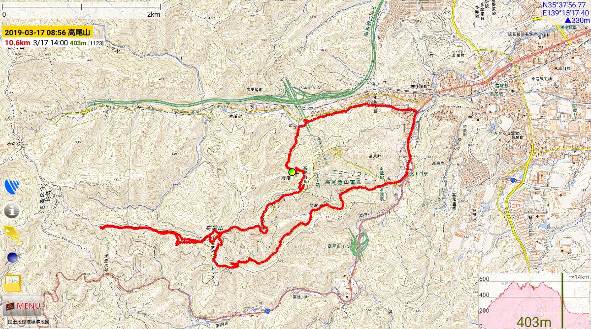 高尾山口駅(08:56)→琵琶滝(09:26)→高尾山(10:42)→一丁平(11:28,12:27)→薬王院(13:16)→高尾山駅(13:37)→蛇滝(14:02)→高尾山口駅(15:20)