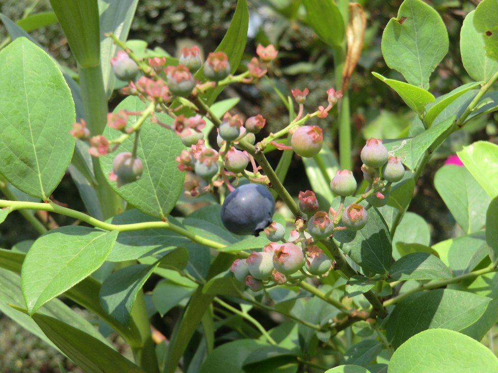 1本のブルーベリーが植えてあり、少し小粒だが食べごろを迎えた。 ウメモドキ(写真左下にブルーベリーの花)とミツバツツジの影だが西側道路際なので比較的日当たりがよく今年は実が沢山ついた。 ブルーベリーは種類の違うものを2本以上植えつけると実の付きがよいとされているので2本目をチャレンジしようかと思っている。