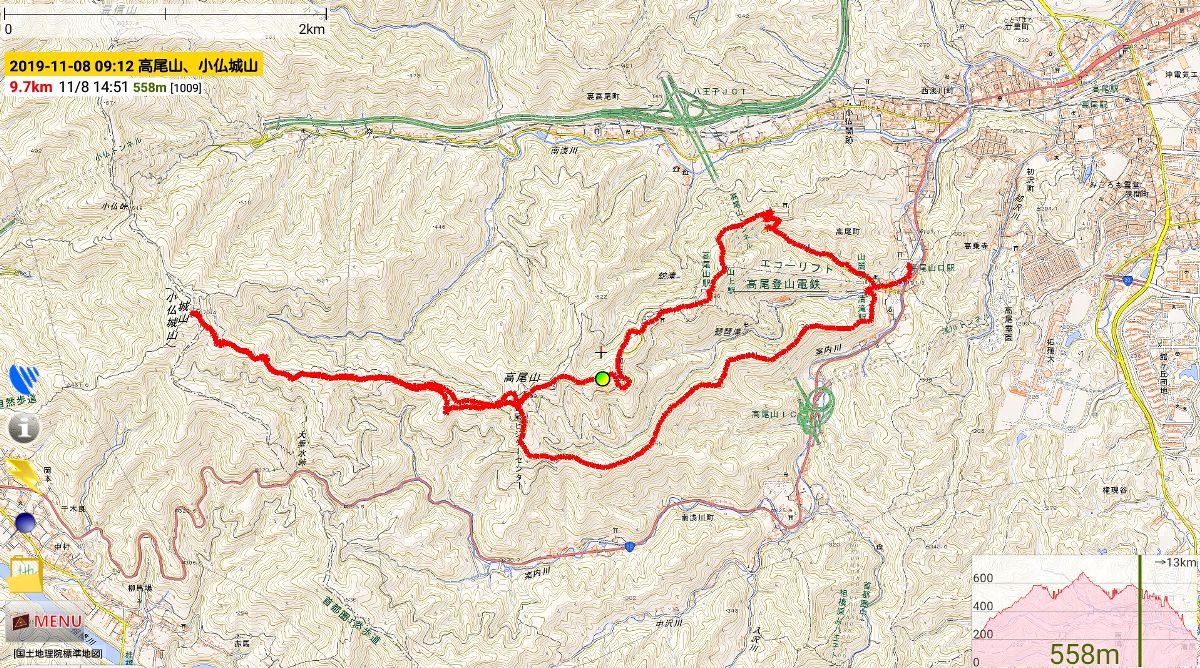 高尾山口駅(09:12)→稲荷山(10:00)→高尾山(10:50)→小仏城山(12:34,13:35)→高尾山(14:35)→薬王院(14:55)→清滝駅(15:53)