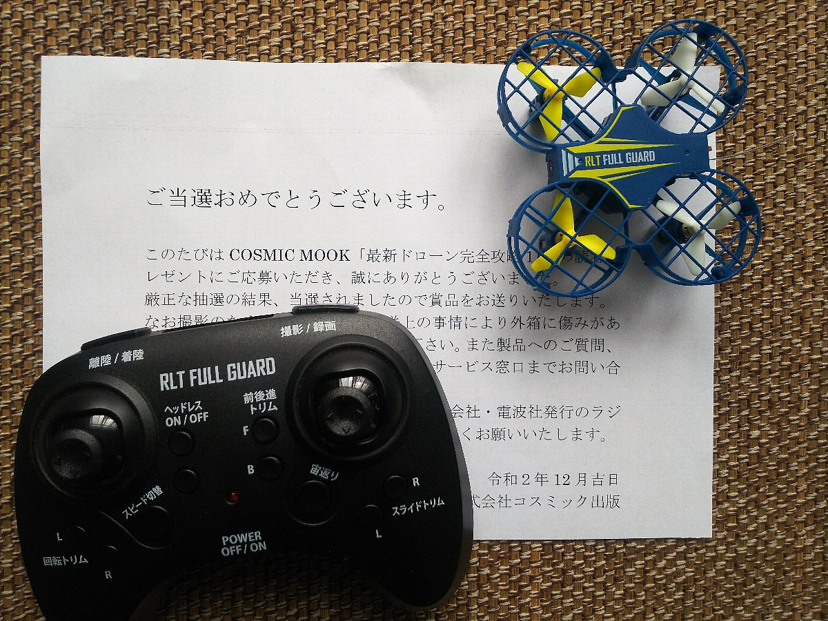 COSMIC MOOKの「最新ドローン完全攻略11」の読者アンケート&プレゼントに応募したらトイドローンが当選した。 CCP社の”リアルライブテトラル フルガード”で、「全方向プロペラガードで安全!安心!」室内専用のトイドローンである。 サイズは全長70㎜、静止画・動画30万画素で、コントローラおよびスマホから操作できるが、飛行時間が内蔵Li-ion電池で4分と短い。 新型コロナウィルス感染拡大で外出自粛中の室内でドローン操縦の練習に励もう。