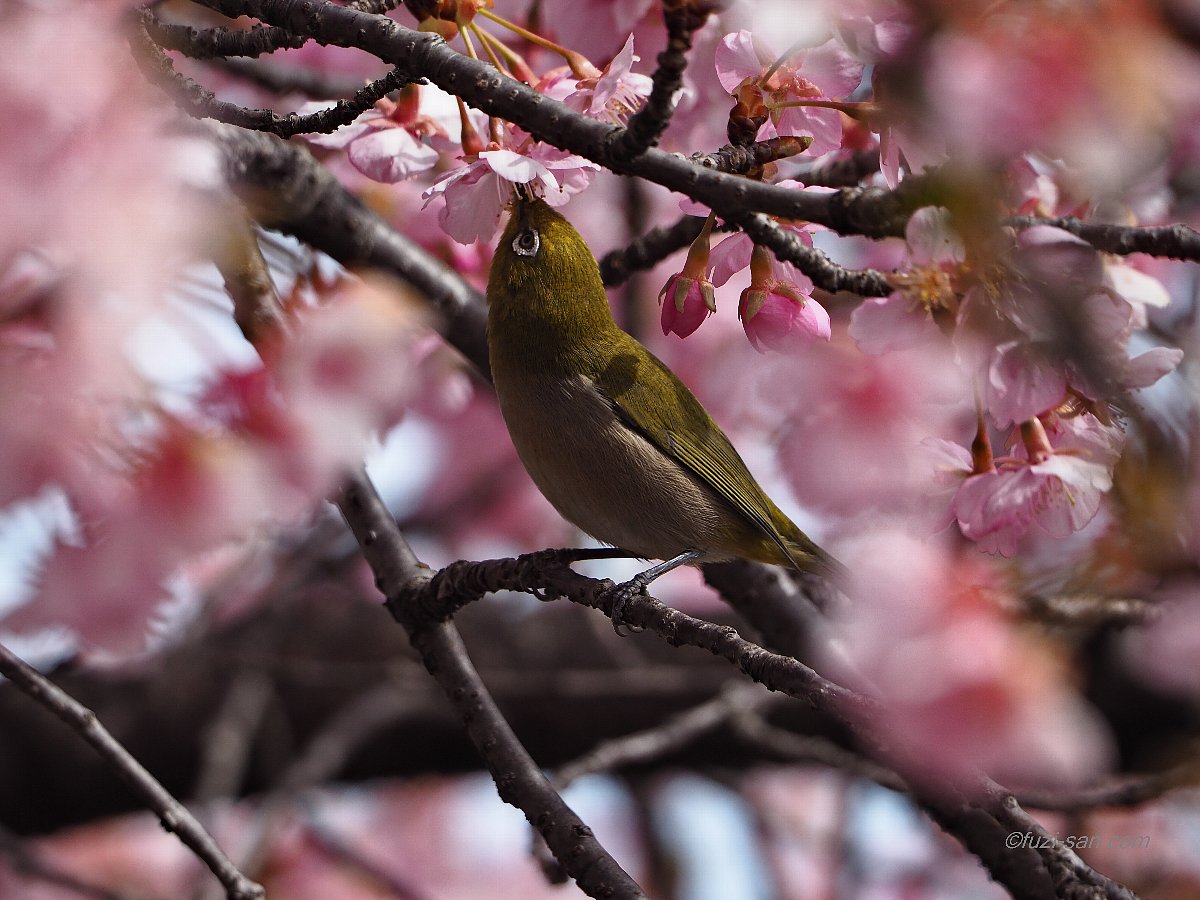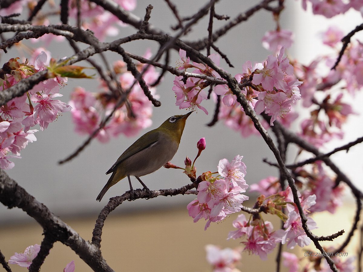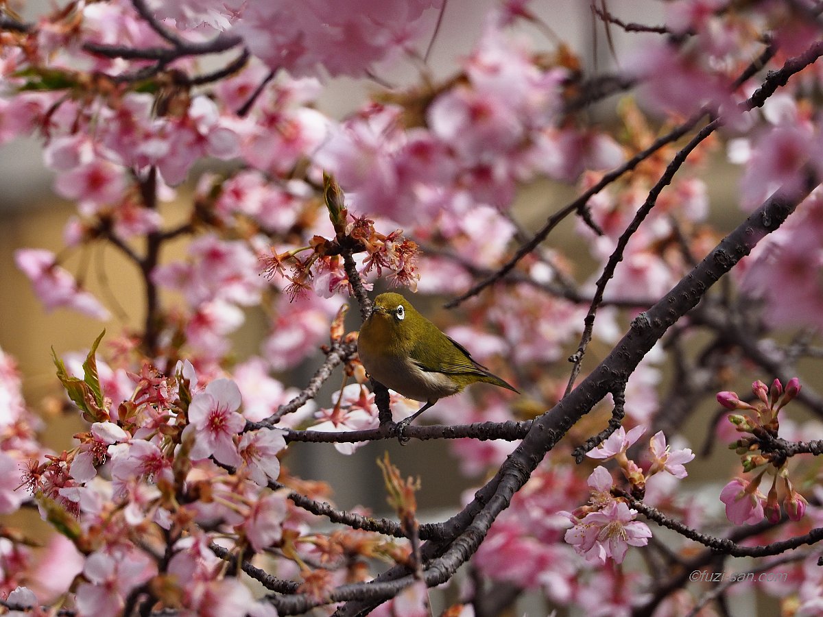 今日から3月、春である。ピークをとうに過ぎてしまったが、かわぐさ公園の河津サクラ鑑賞とメジロ撮影に。 メジロが沢山集まって河津サクラの蜜をせっせとついばんでいました。